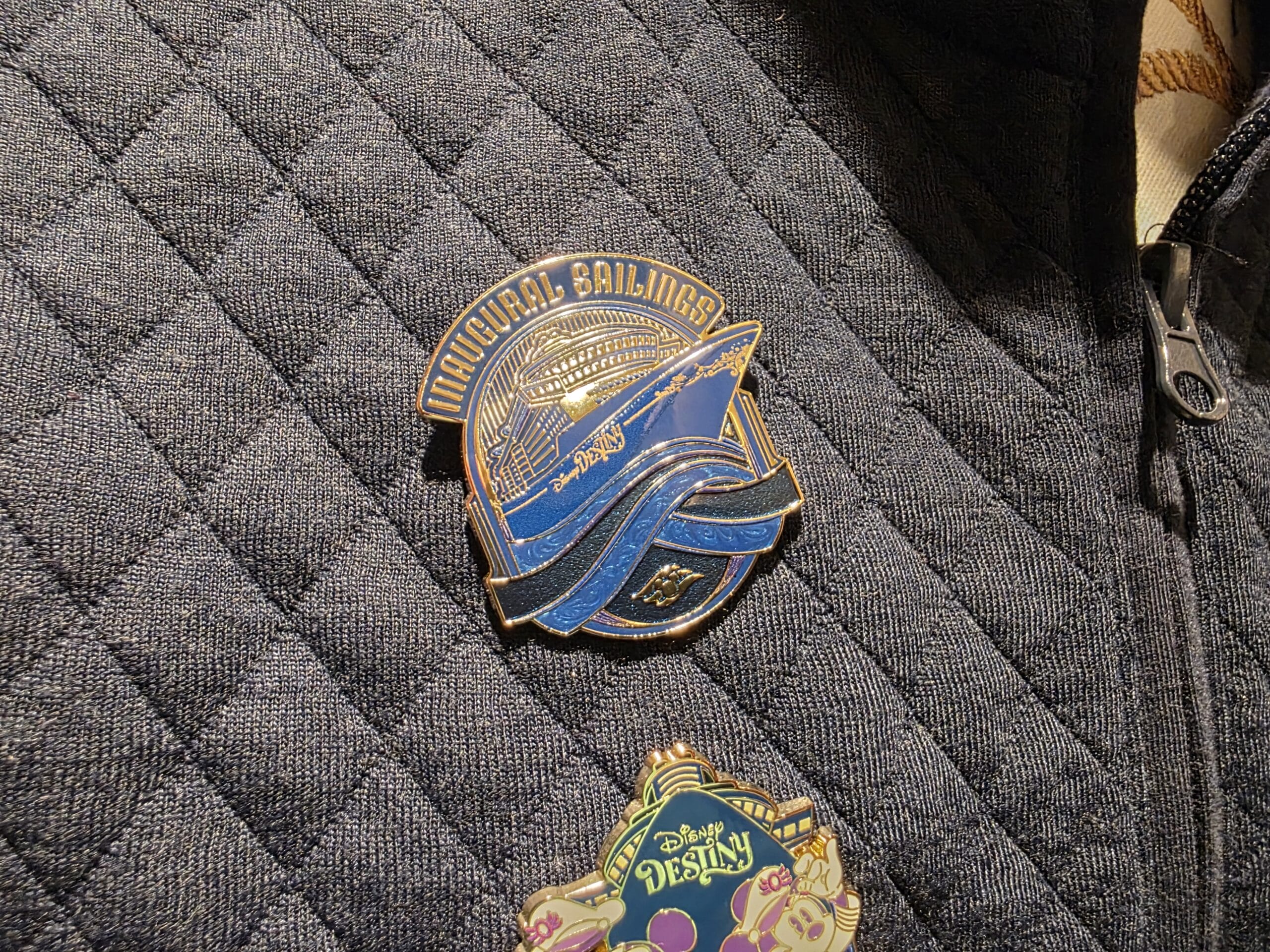 The first commemorative Inaugural Sailings pin features a golden Disney Destiny sailing through stylized waves of pearlescent blue and shimmering navy. “Inaugural Sailings” arches above and a small Disney Cruise Line logo is at the bottom.
