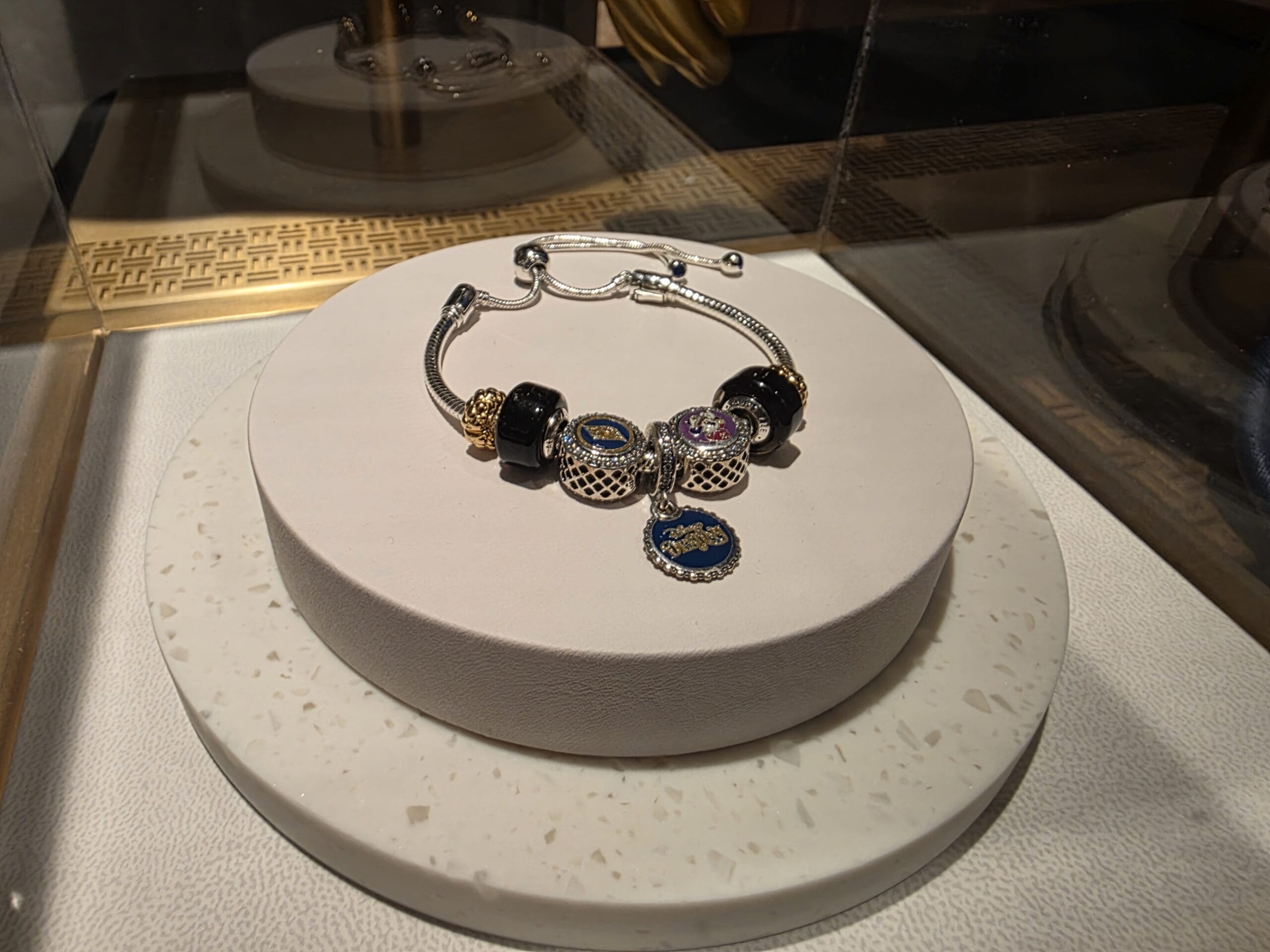 The Disney Destiny gets its own commemorative Pandora bracelet with special Captain Mickey, Disney Cruise Line, and Disney Destiny charms, plus black and gold accent beads, on a sterling silver adjustable snake chain bracelet.