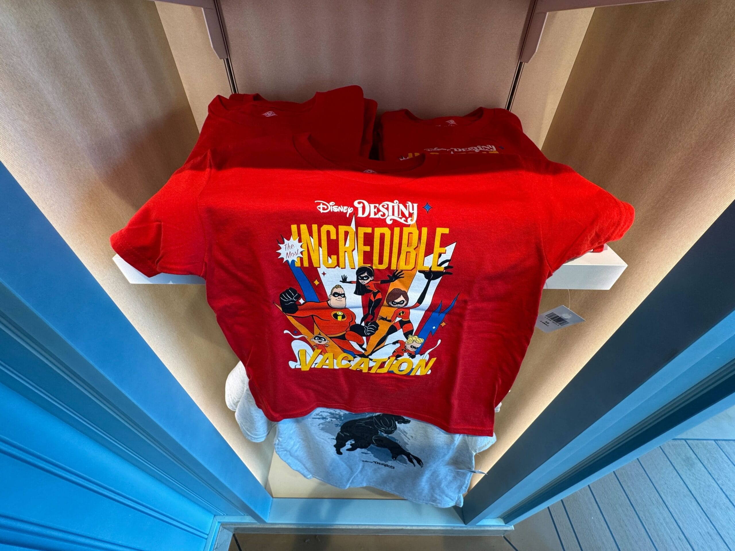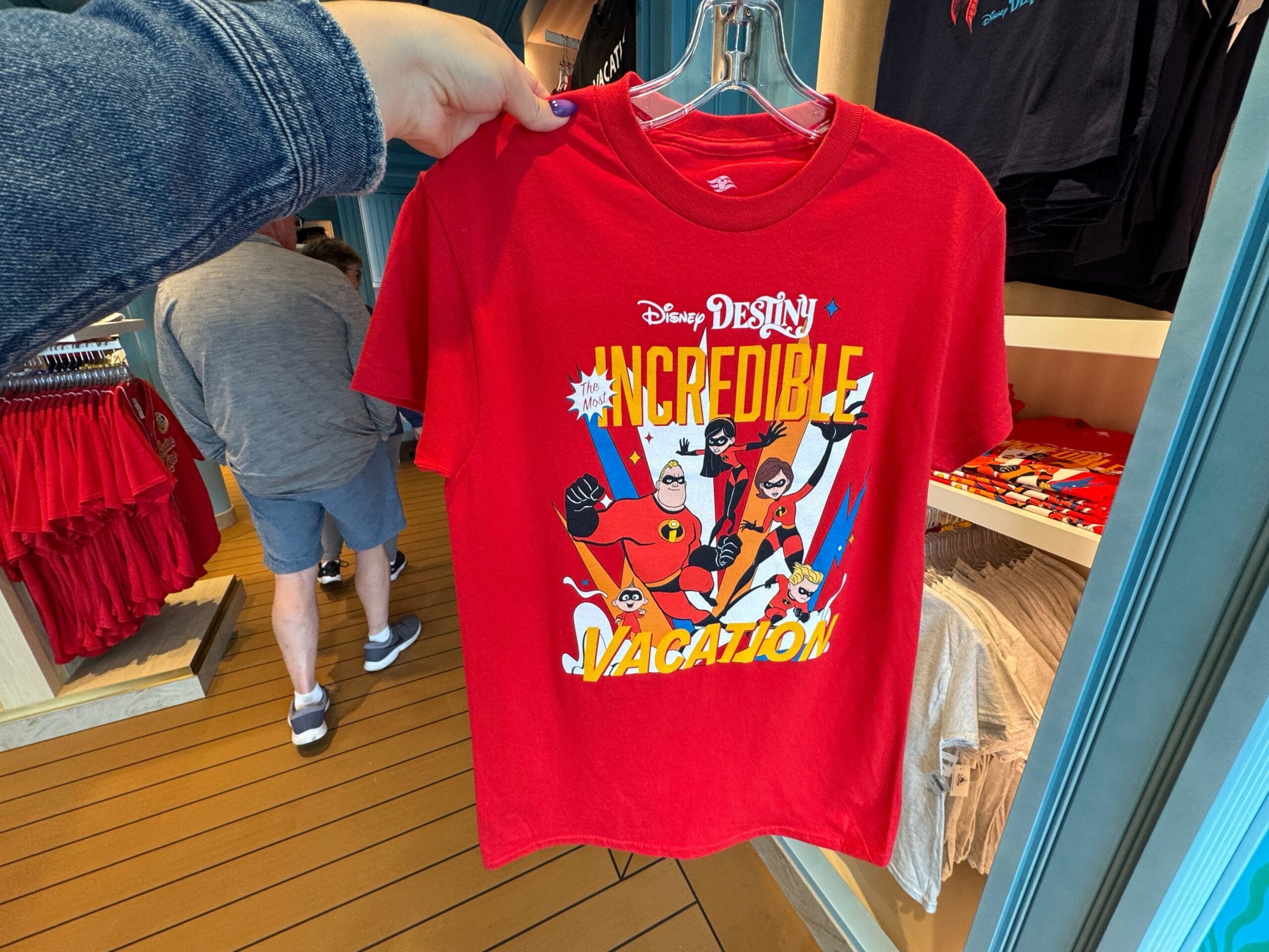 The Incredible Vacation T-shirt is red with the Incredibles family in their superhero outfits. The Destiny wordmark is at the top in white text, and “Incredible Vacation” is in yellow text.
