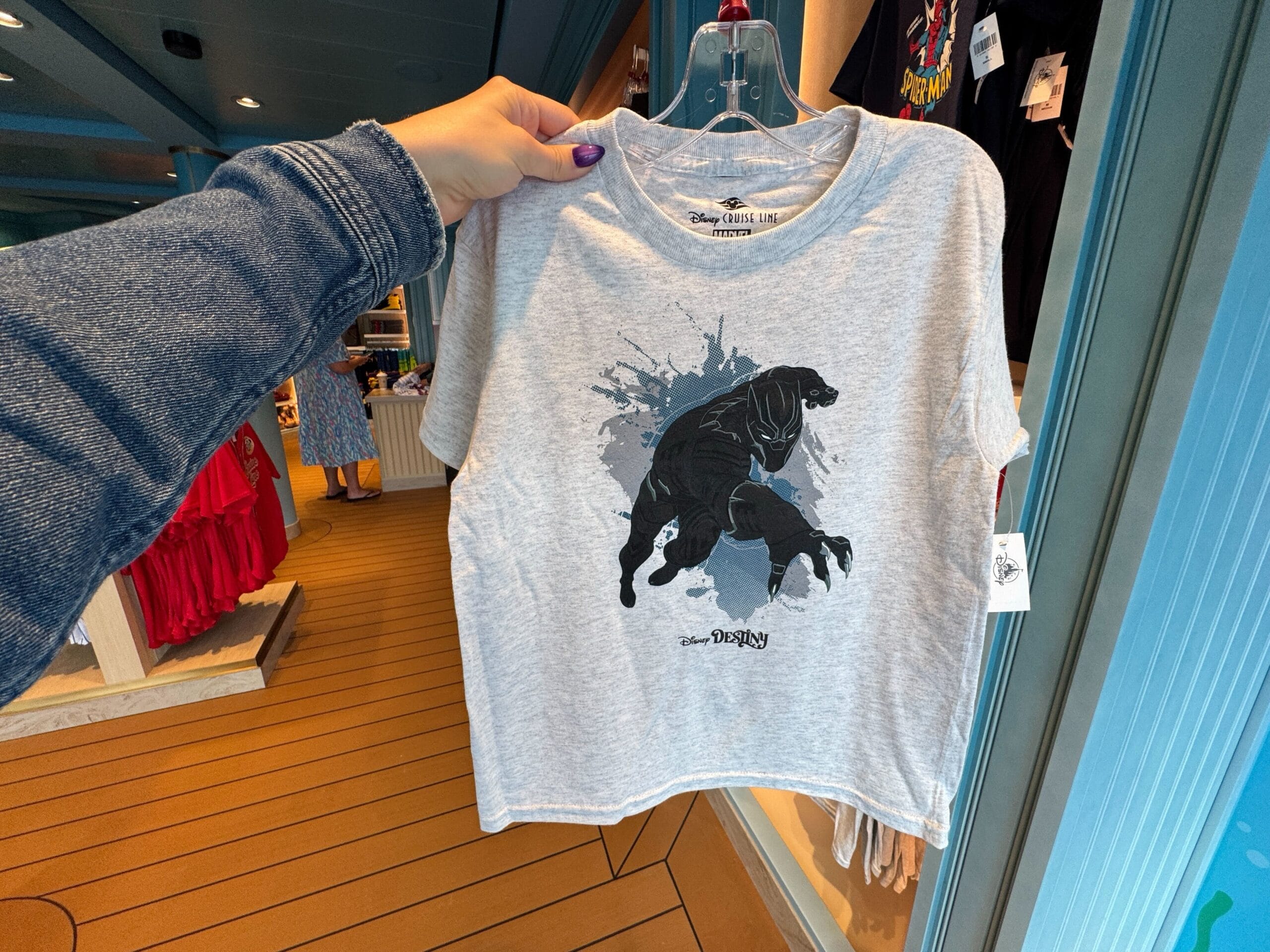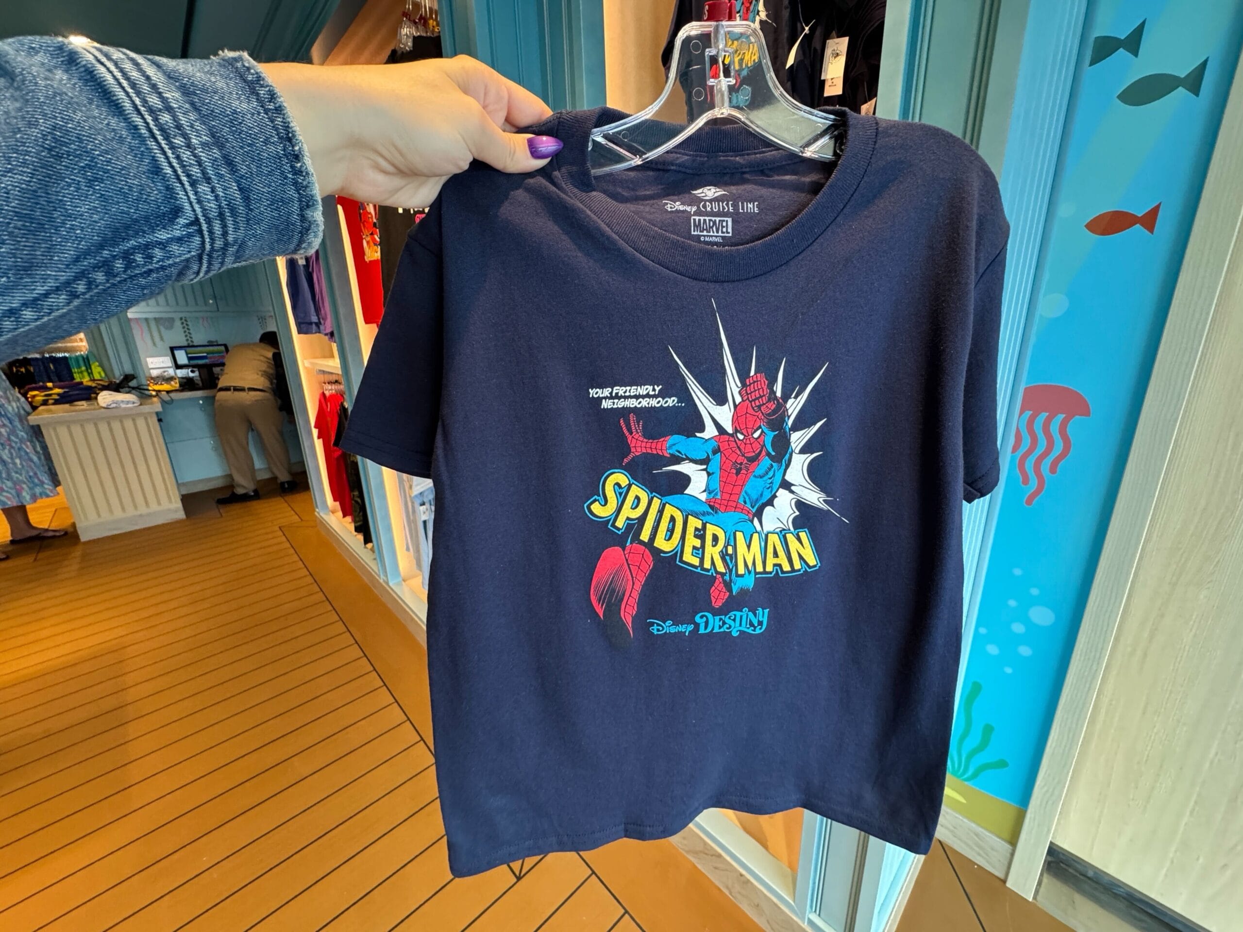 The Spider-Man T-shirt is blue with Spider-Man slinging his web. The text says “Your friendly neighborhood Spider-Man” in yellow and white. The Destiny wordmark is at the bottom.