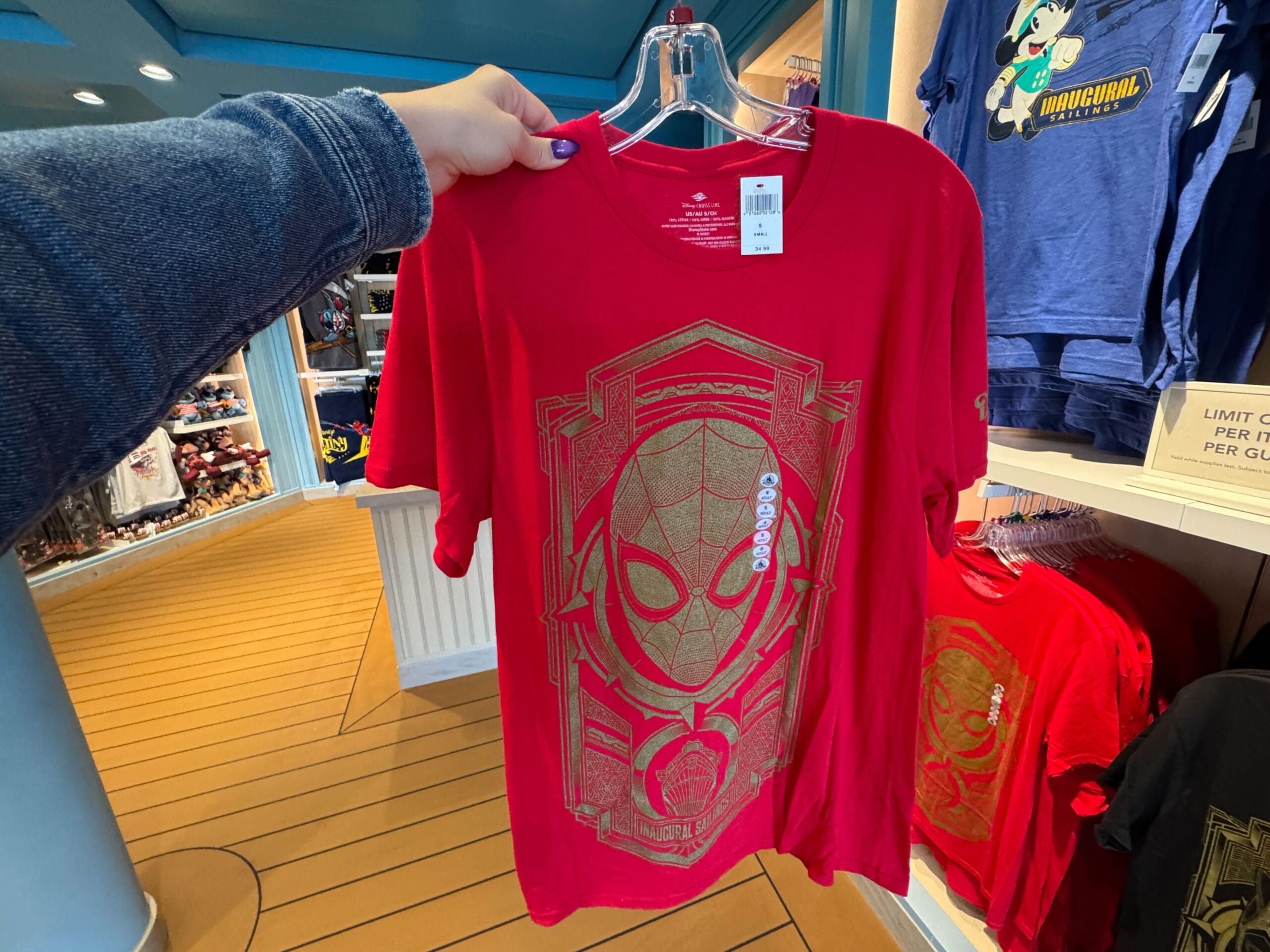 This Spider-Man T-shirt is red with a goldtone image of Spider-Man’s face inside a geometric border. The ship and “wordmark “Inaugural Sailings” is at the bottom.