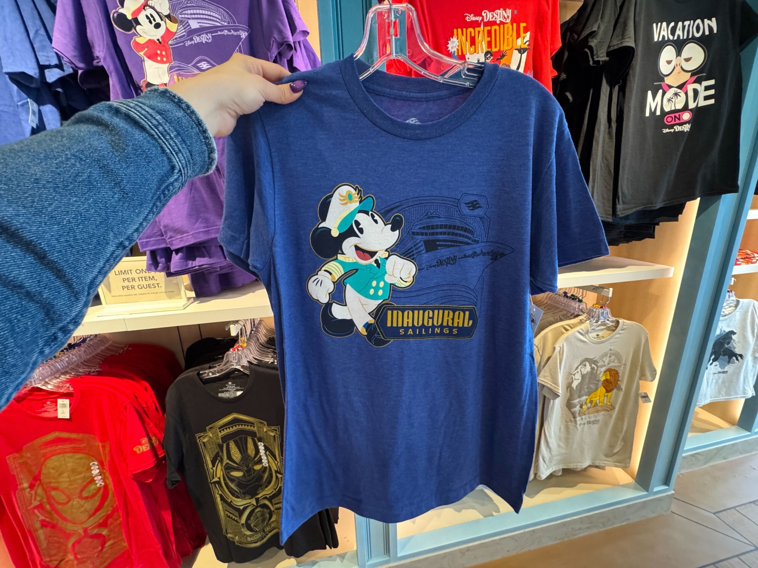 The Mickey Inaugural Sailings T-shirt is blue with an image of Captain Mickey standing in front of the Destiny ship. “Inaugural Sailings” is in yellow text underneath Mickey.