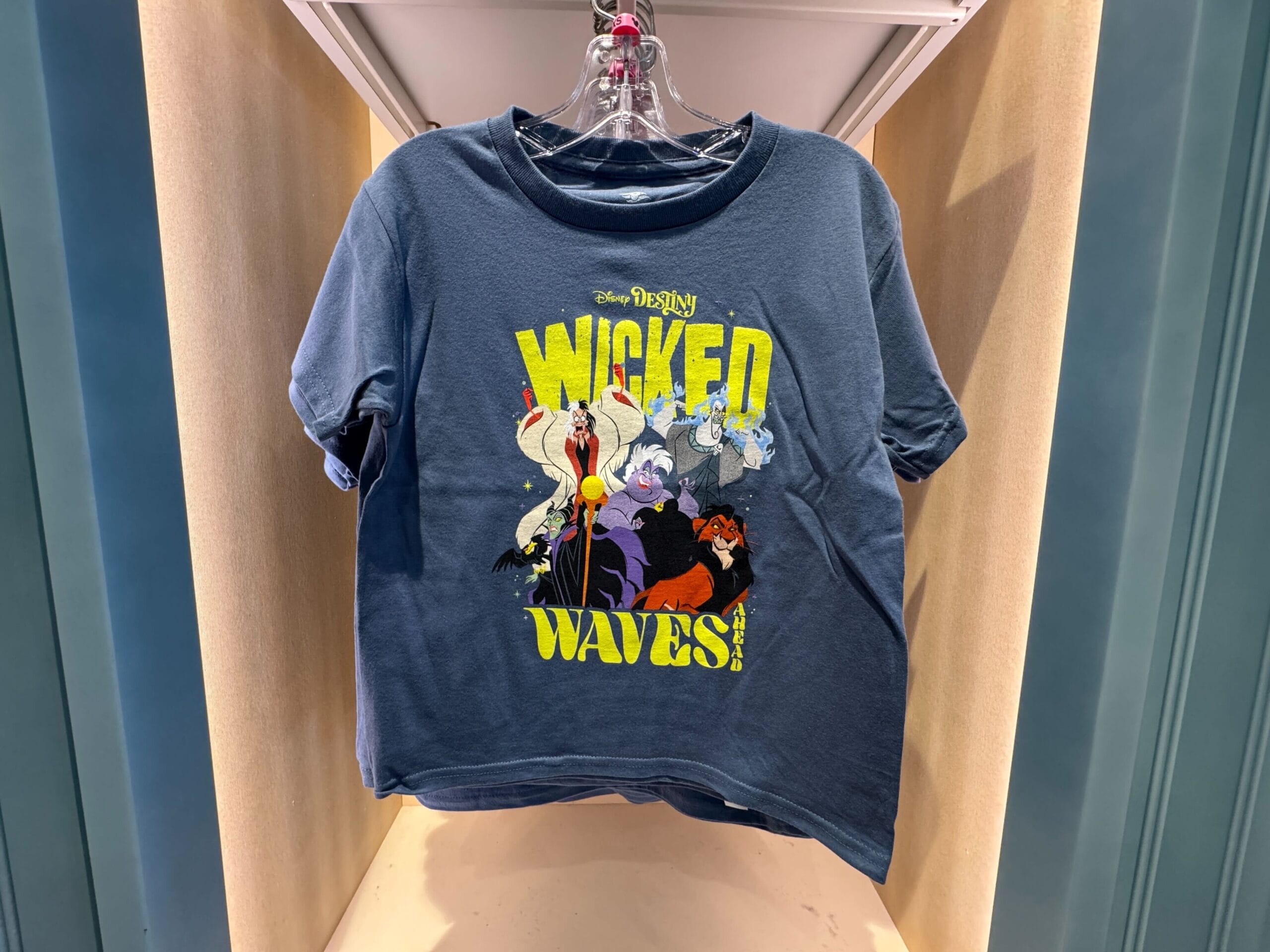 The Wicked Waves T-shirt is blue with Hades, Cruella, Ursula, Mufas, and Maleficent in the center. The Destiny wordmark and “Wicked Waves” yellow text surround the image.