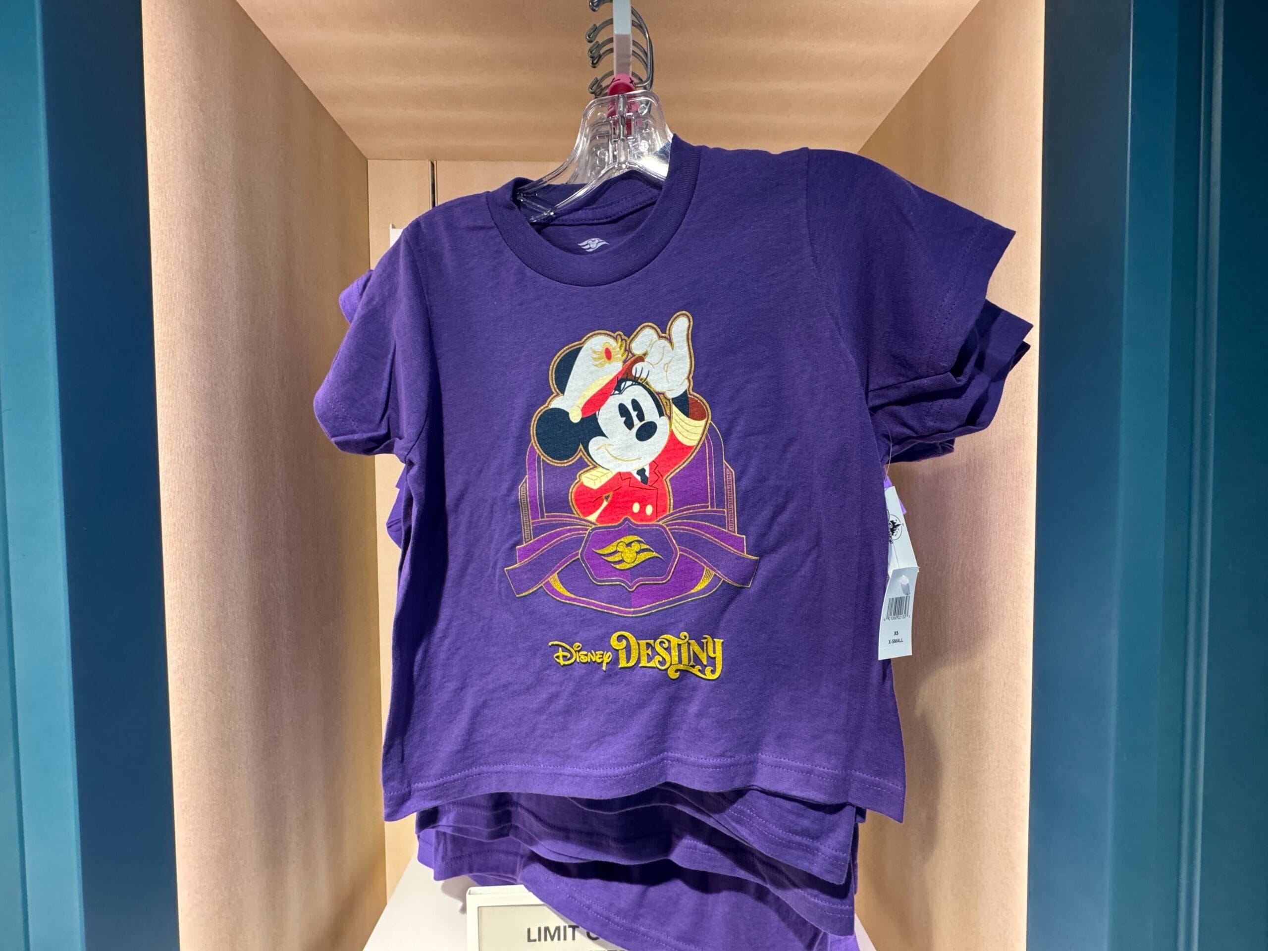 The Mickey T-shirt is purple with an image of Captain Mickey standing inside a border with the Disney Cruise Line logo. The Destiny wordmark is in yellow text underneath Mickey.