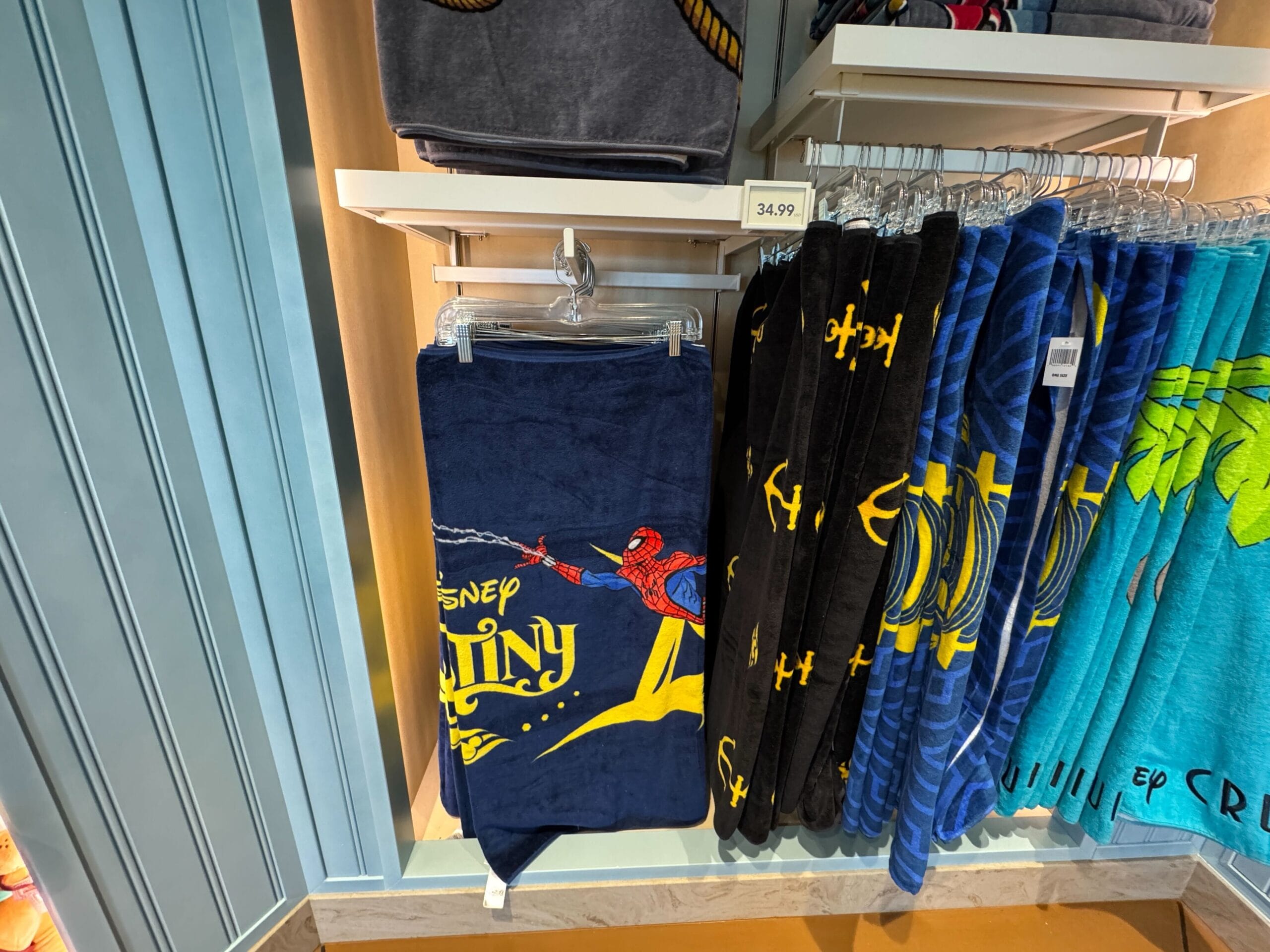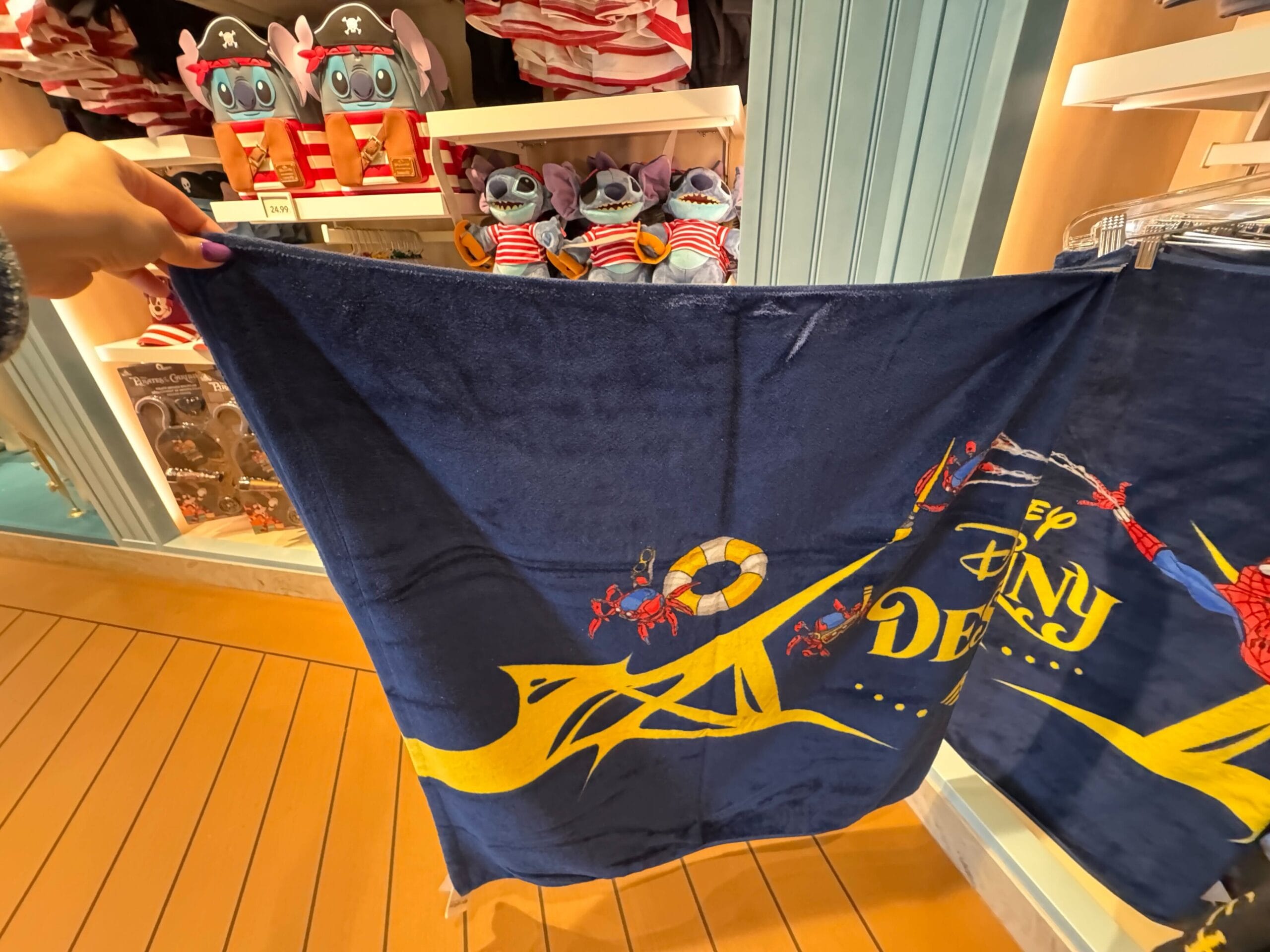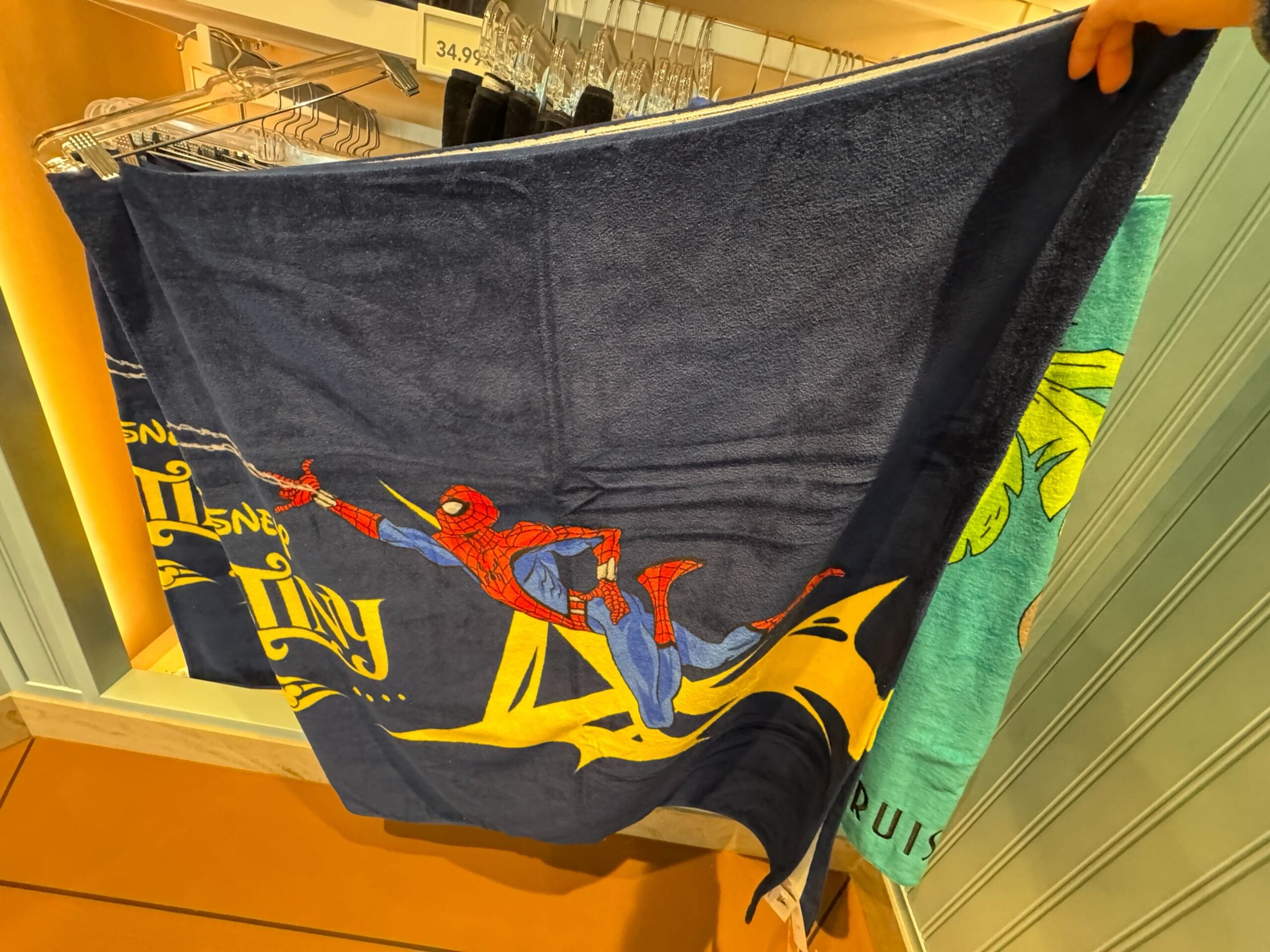 The Disney Destiny beach towel is navy blue. The design replicates the stern art on the ship, which is Spider-Man slinging a web and his Spider-Bots.