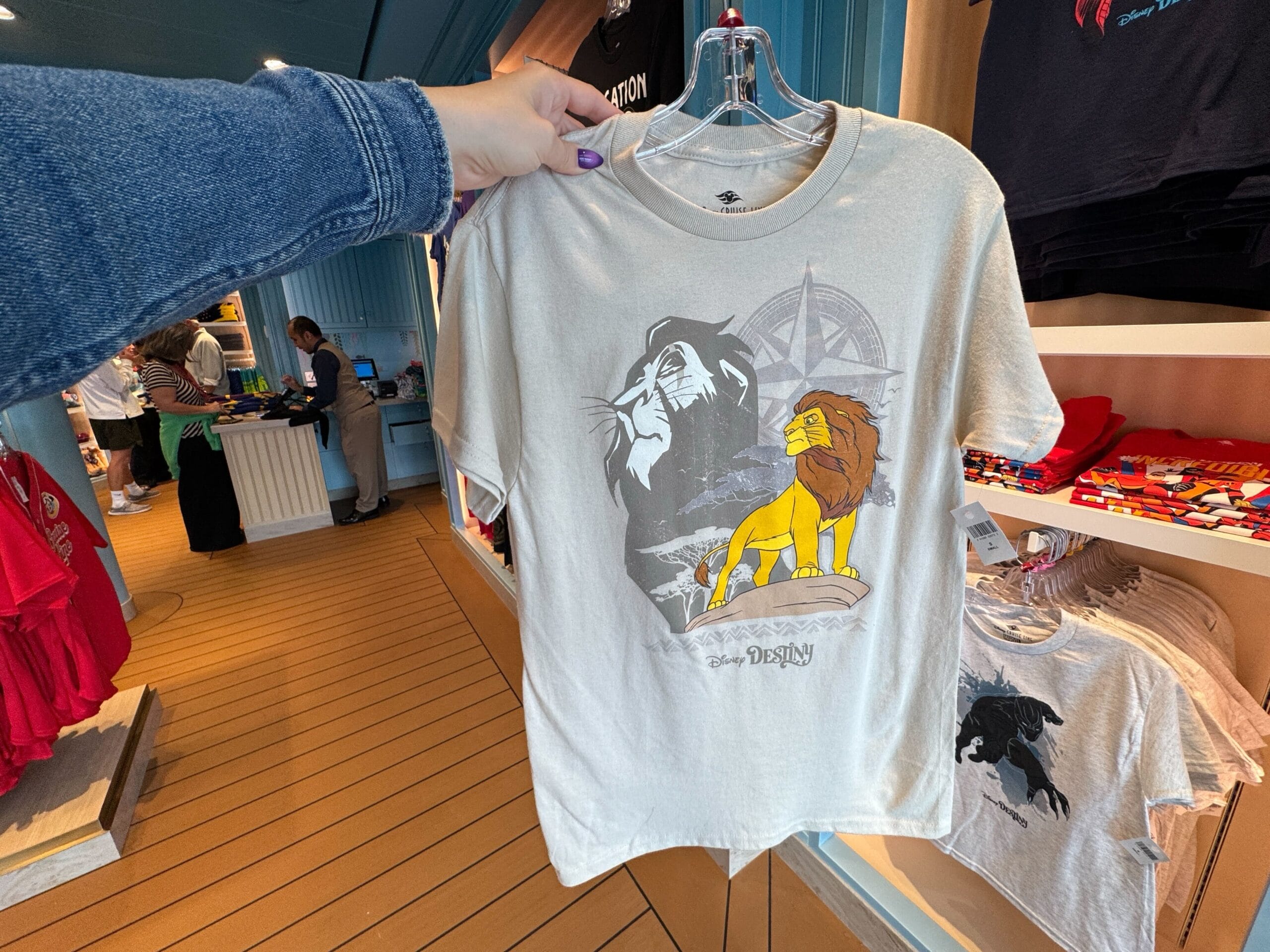 The Lion King T-shirt is gray with an image of Simba standing on a rock in the foreground, and Mufasa in graytone image in the back, which also includes a compass. The Destiny wordmark is at the bottom.