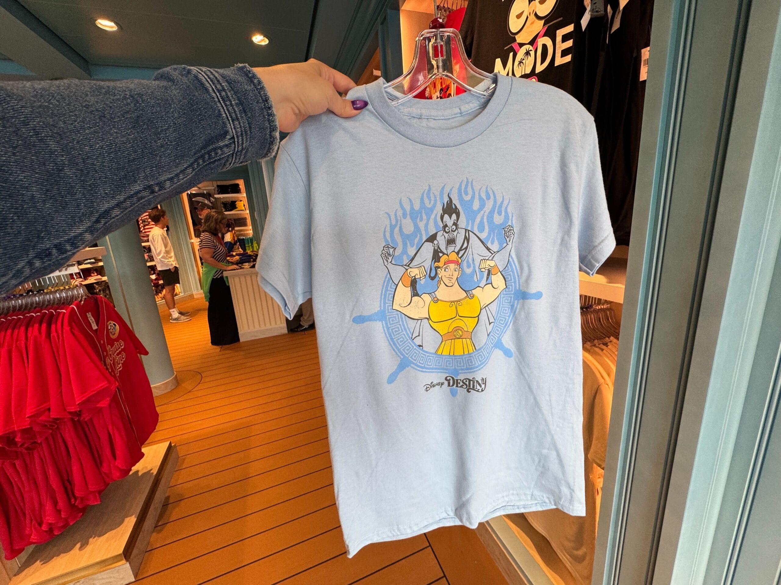 The Hercules T-shirt is light blue with Hercules flexing his muscles inside a captain’s wheel. Hades stands behind him as blue flames dance in the background. The Destiny wordmark is at the bottom.