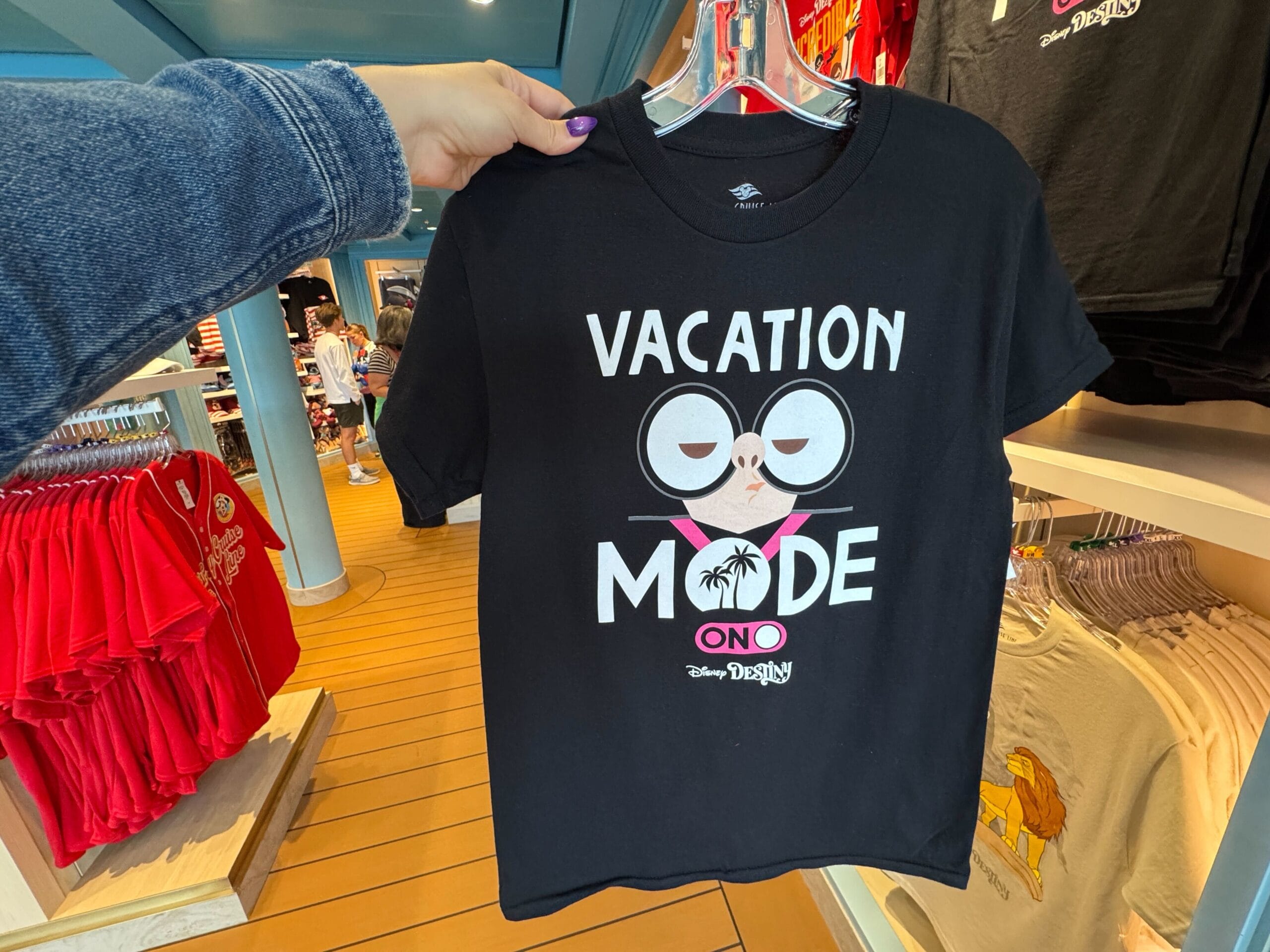 The Vacation Mode T-Shirt is black with Edna Mode’s face in the center. “Vacation Mode” is in white text, with palm trees inside the “O.”