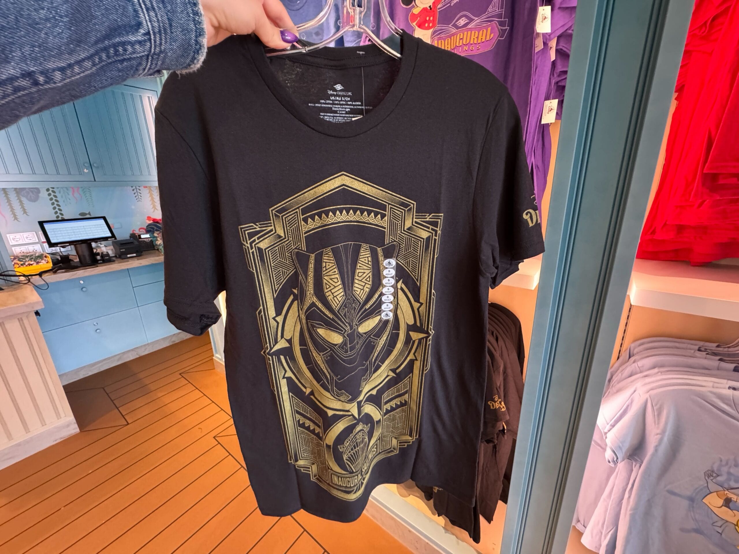 This Black Panther T-shirt is black with a goldtone image of his face inside a geometric border. The ship and “wordmark “Inaugural Sailings” is at the bottom.
