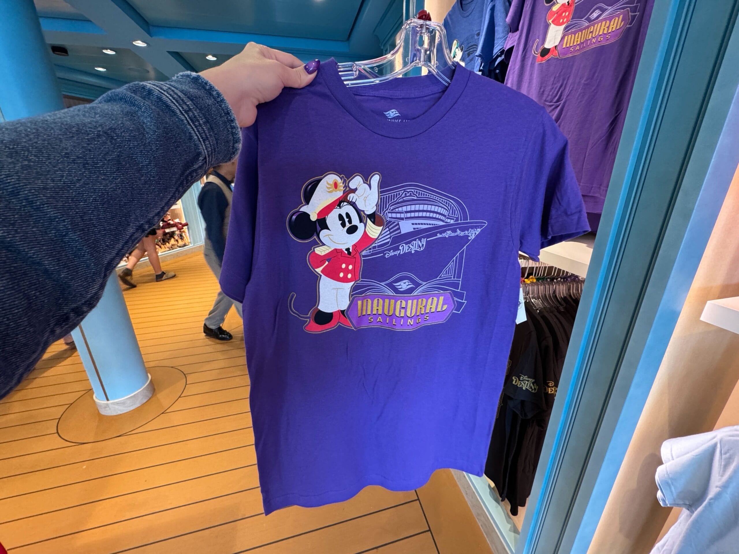 The Minnie Inaugural Sailings T-shirt is blue with an image of Captain Minnie standing in front of the Destiny ship. “Inaugural Sailings” is in yellow text underneath Minnie.