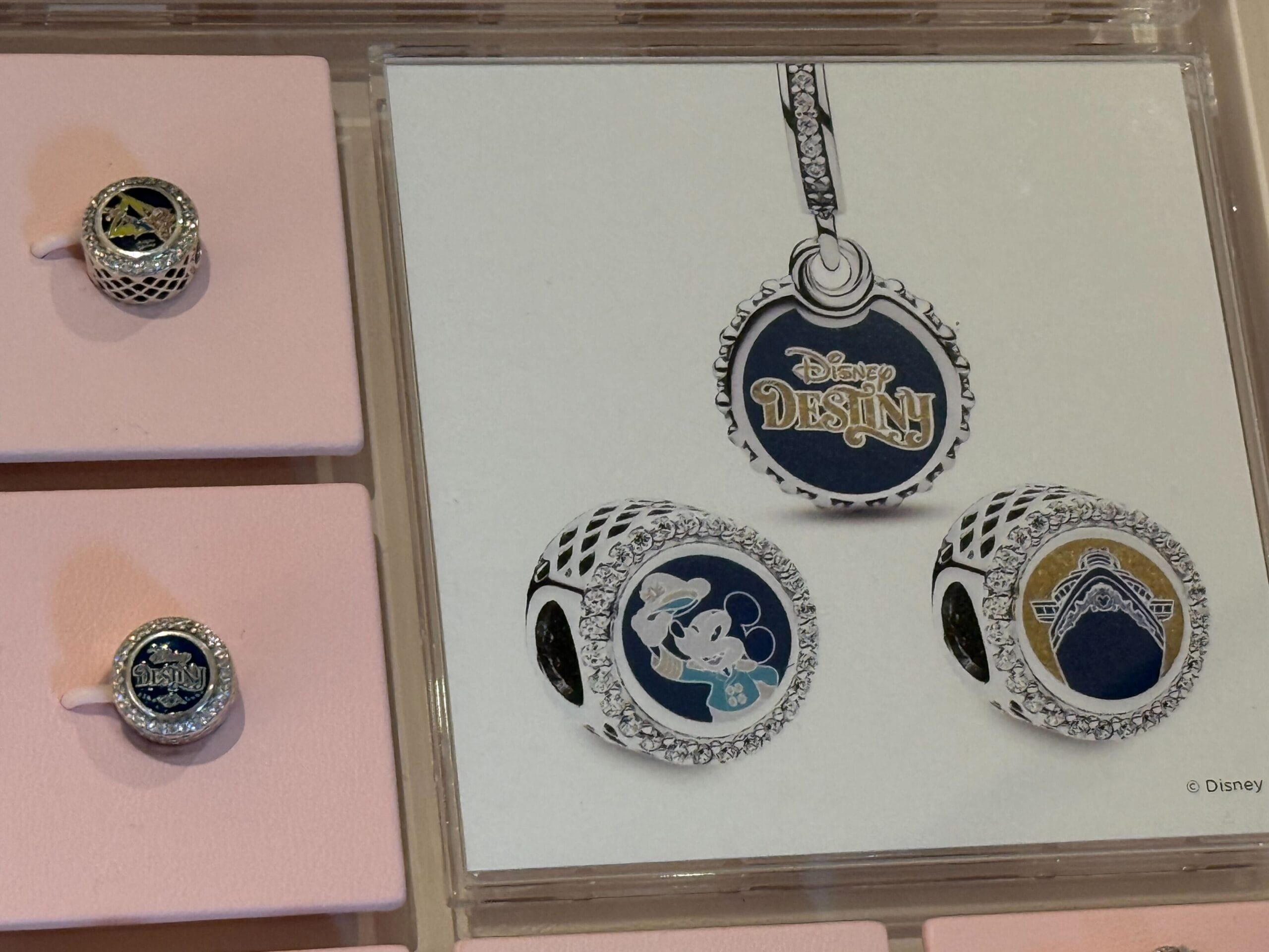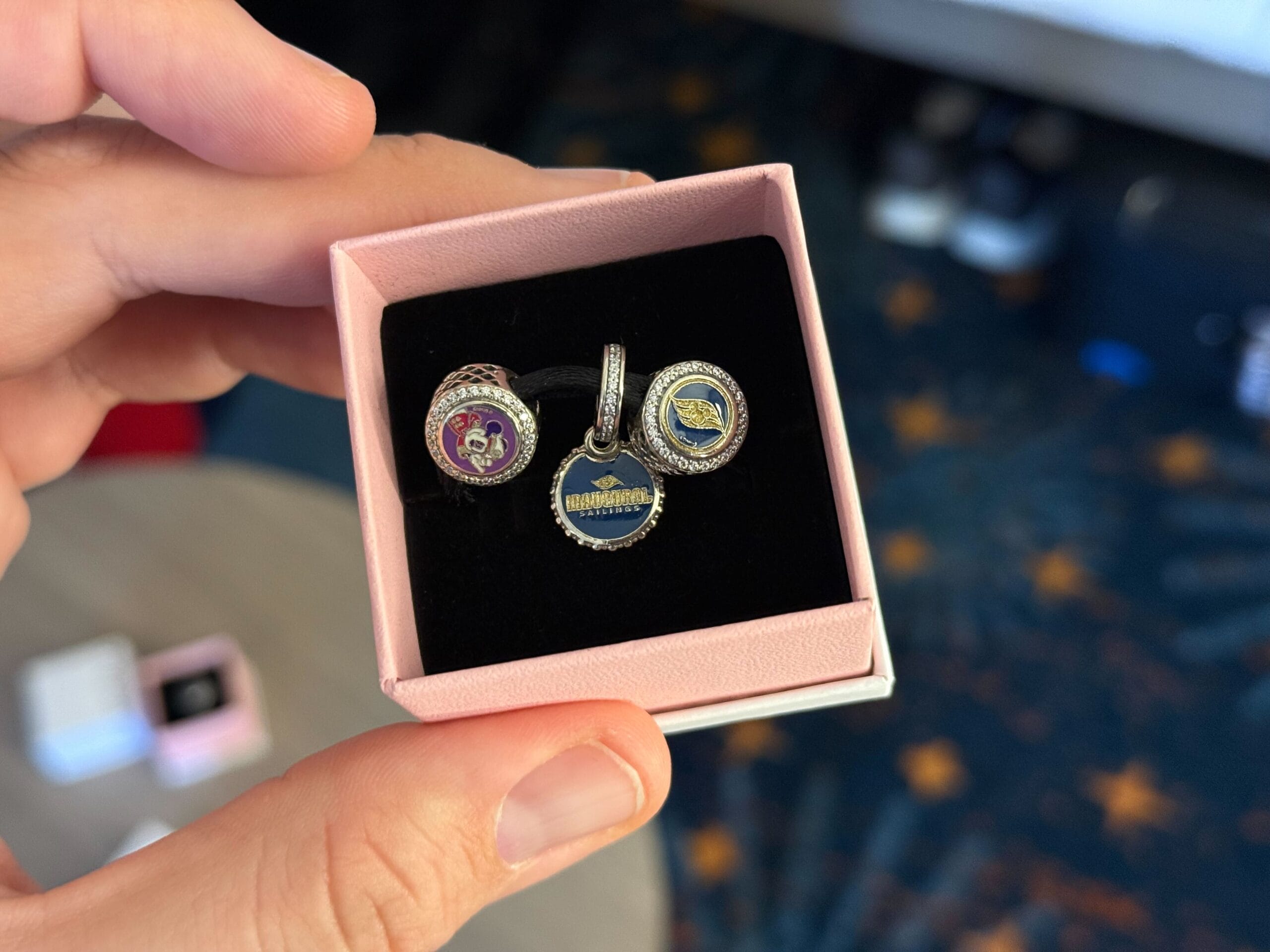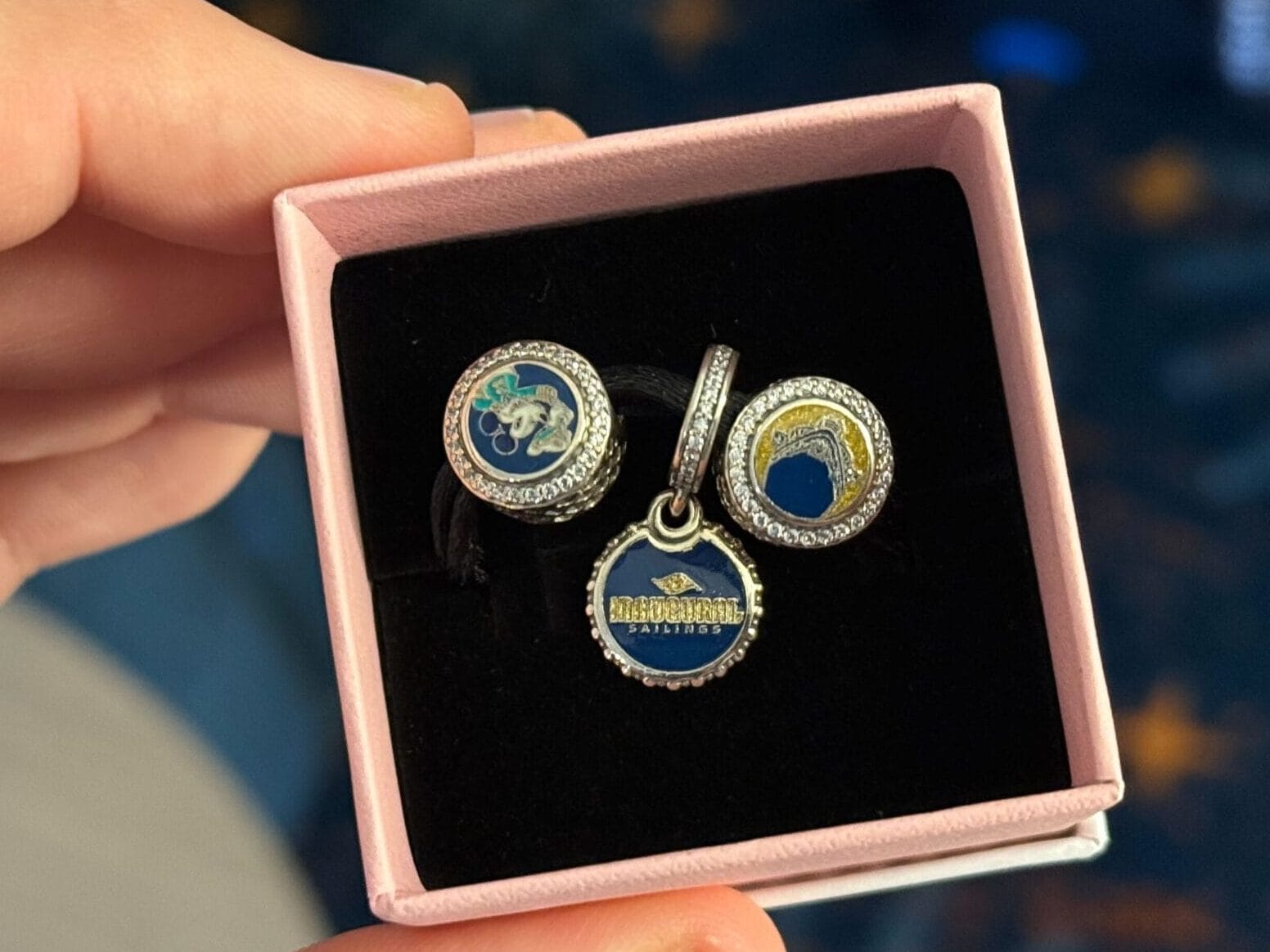 The Inaugural set includes one dangle charm with Inaugural Sailing text, as well as two regular charms with Mickey/Minnie and the Disney Cruise Line logo/ship image.