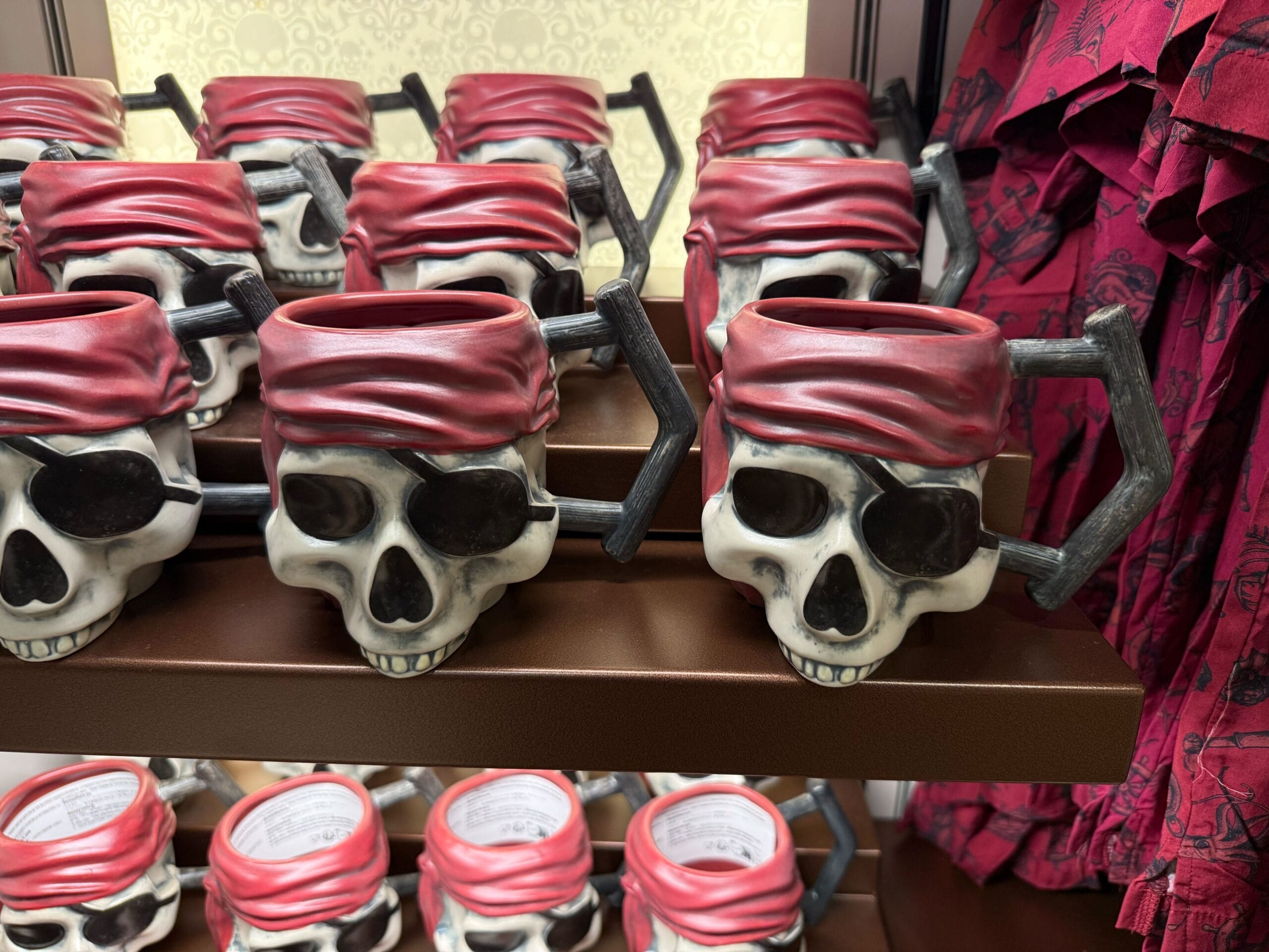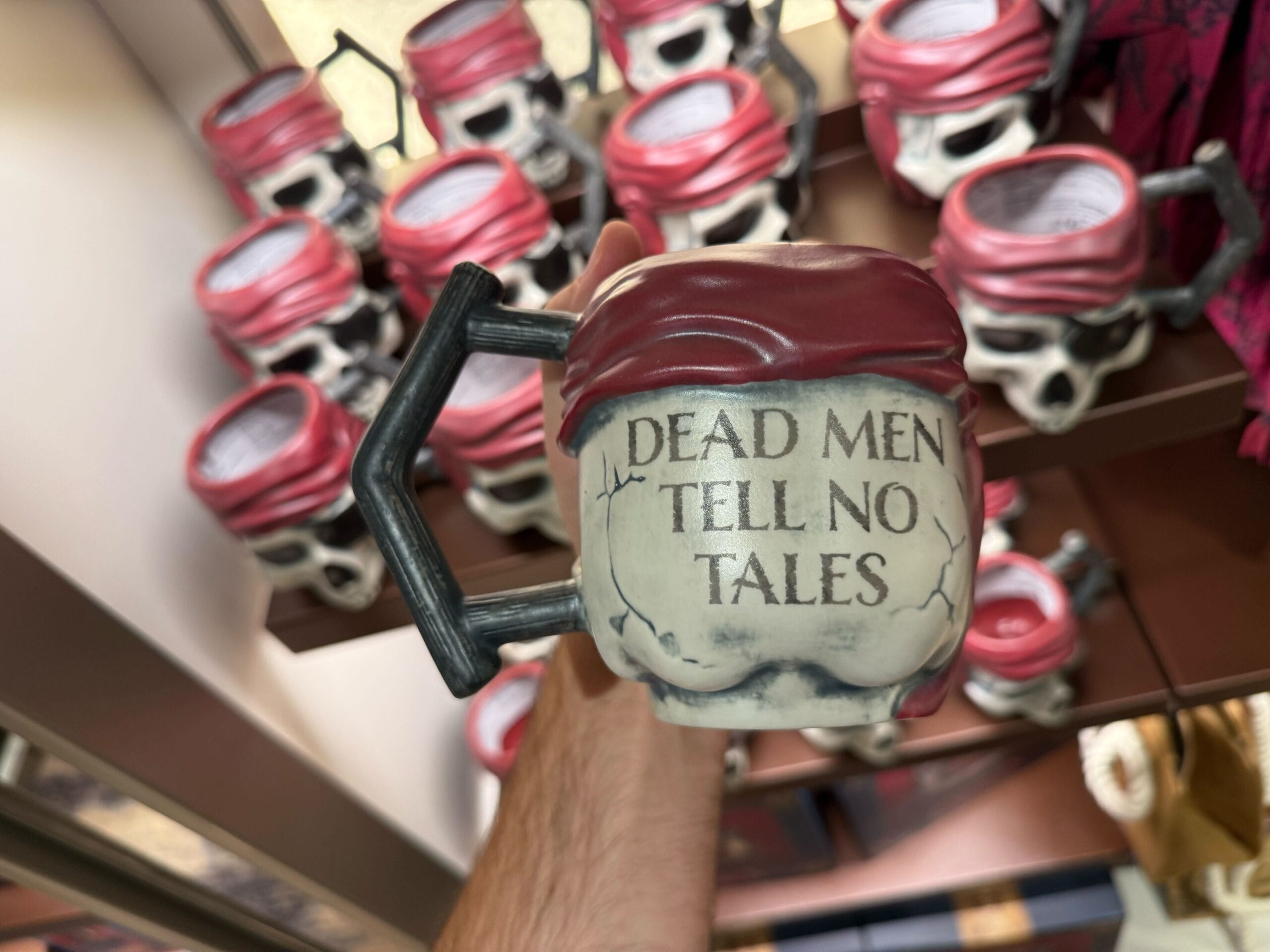 One side of the mug is a skull wearing an eye patch and bandana. On the back it has “Dead men tell no tales” text. The handle has a deep angular jut in the middle.