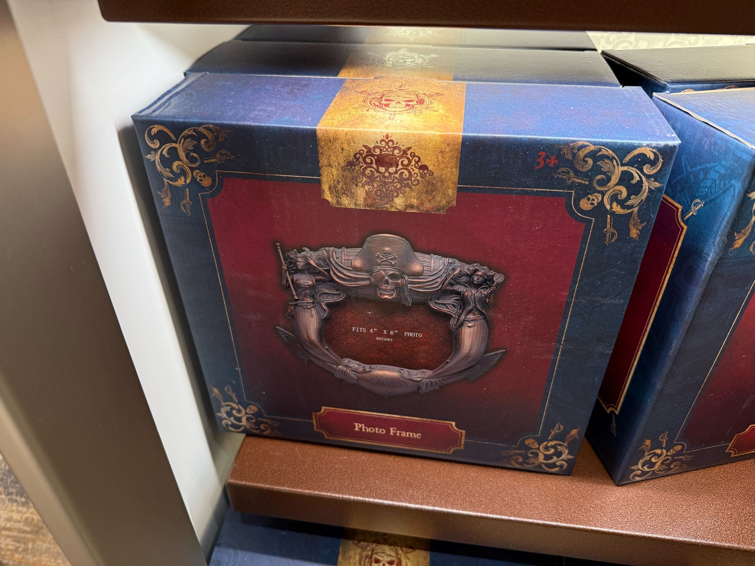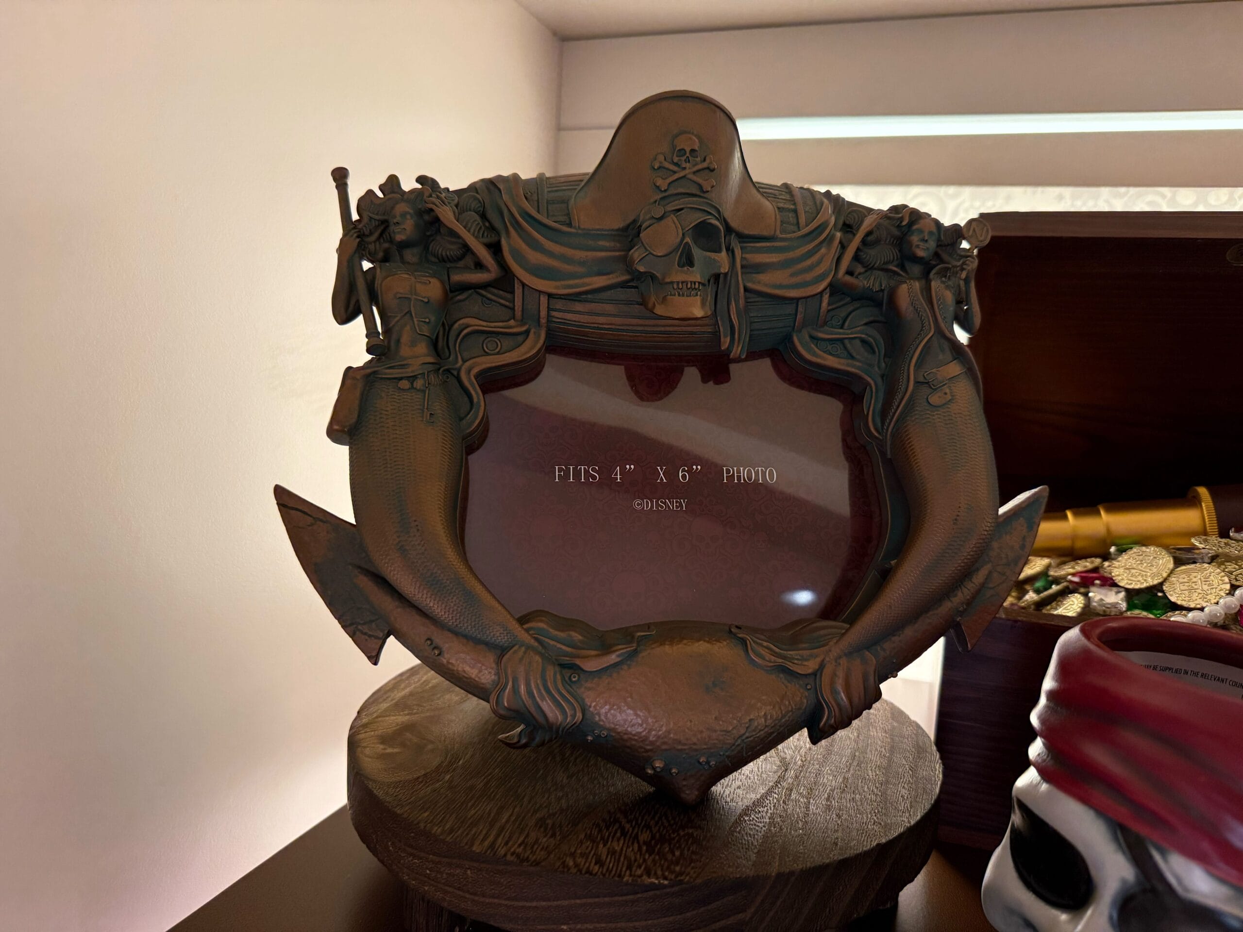 The weathered brass photo frame has a skull with a pirate’s trifold hat in front of a barrel. Each side of the frame is made up of a mermaid, and the bottom stands on a wood display.