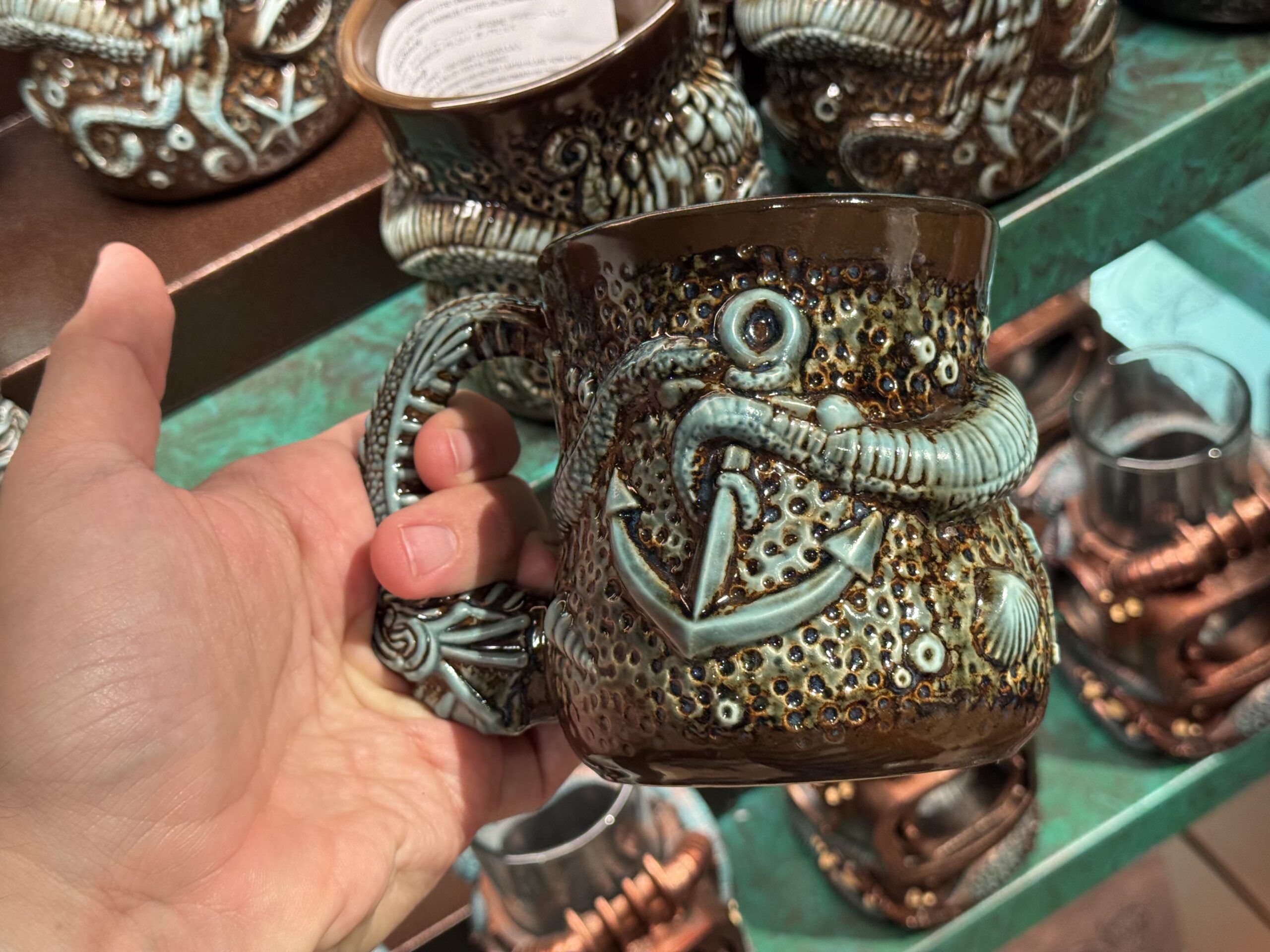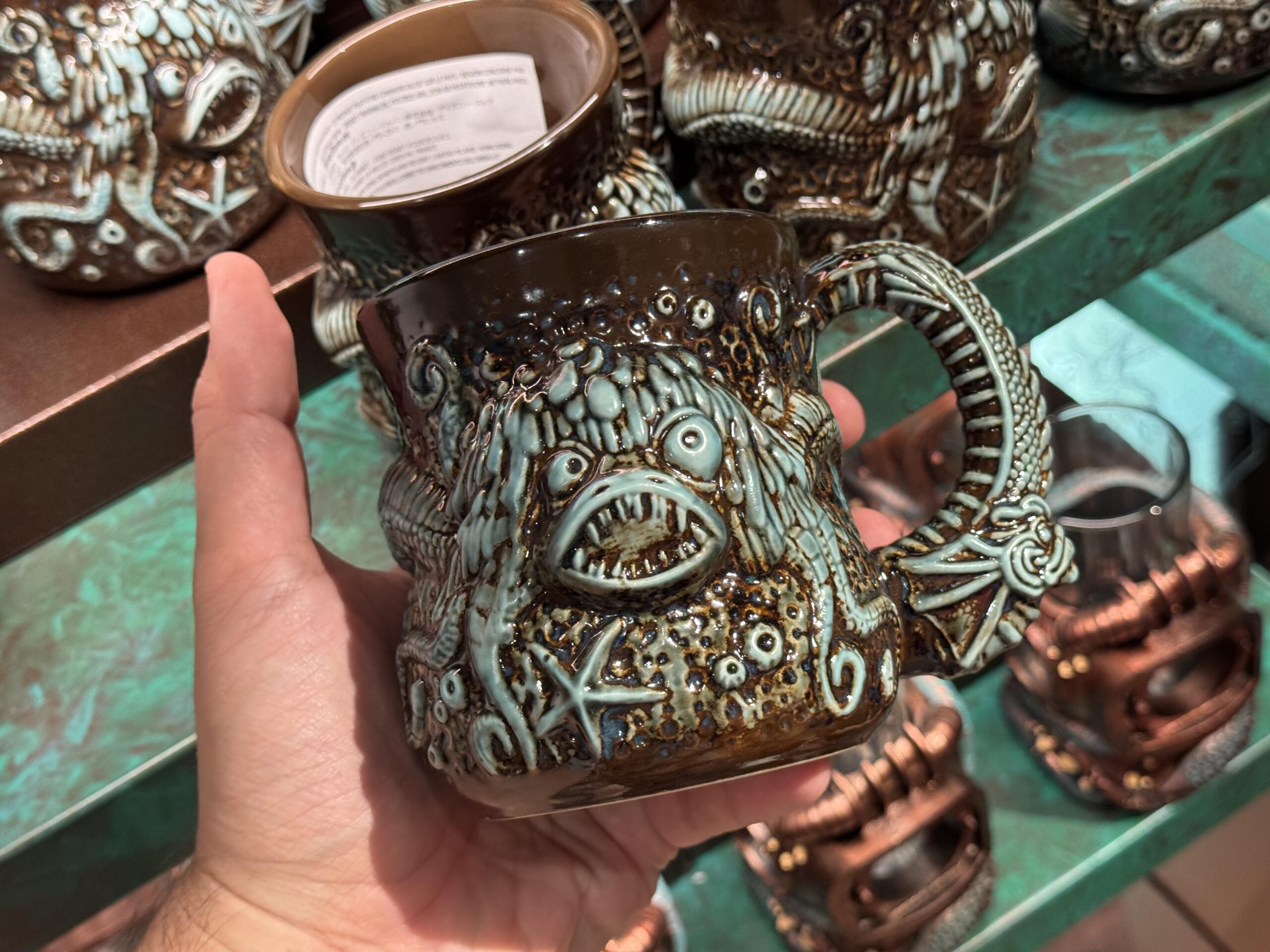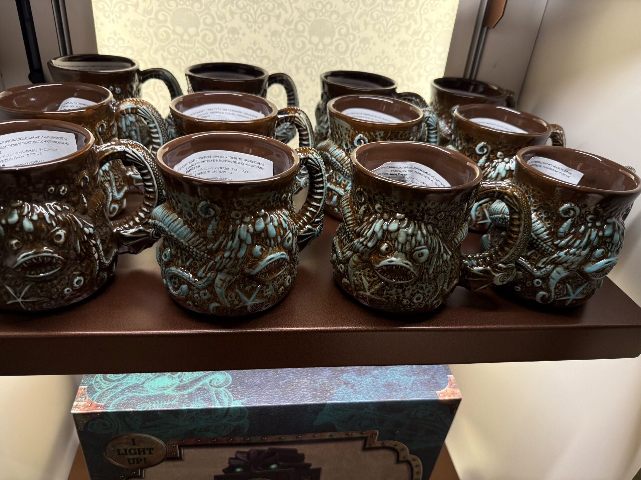 Inspired by the Haunted Mansion Parlor’s ghost fish aquarium, this brown stoneware mug features a teal blue carving of the aquarium’s fishy figure. Tentacles continue around the sides and create the handle.
