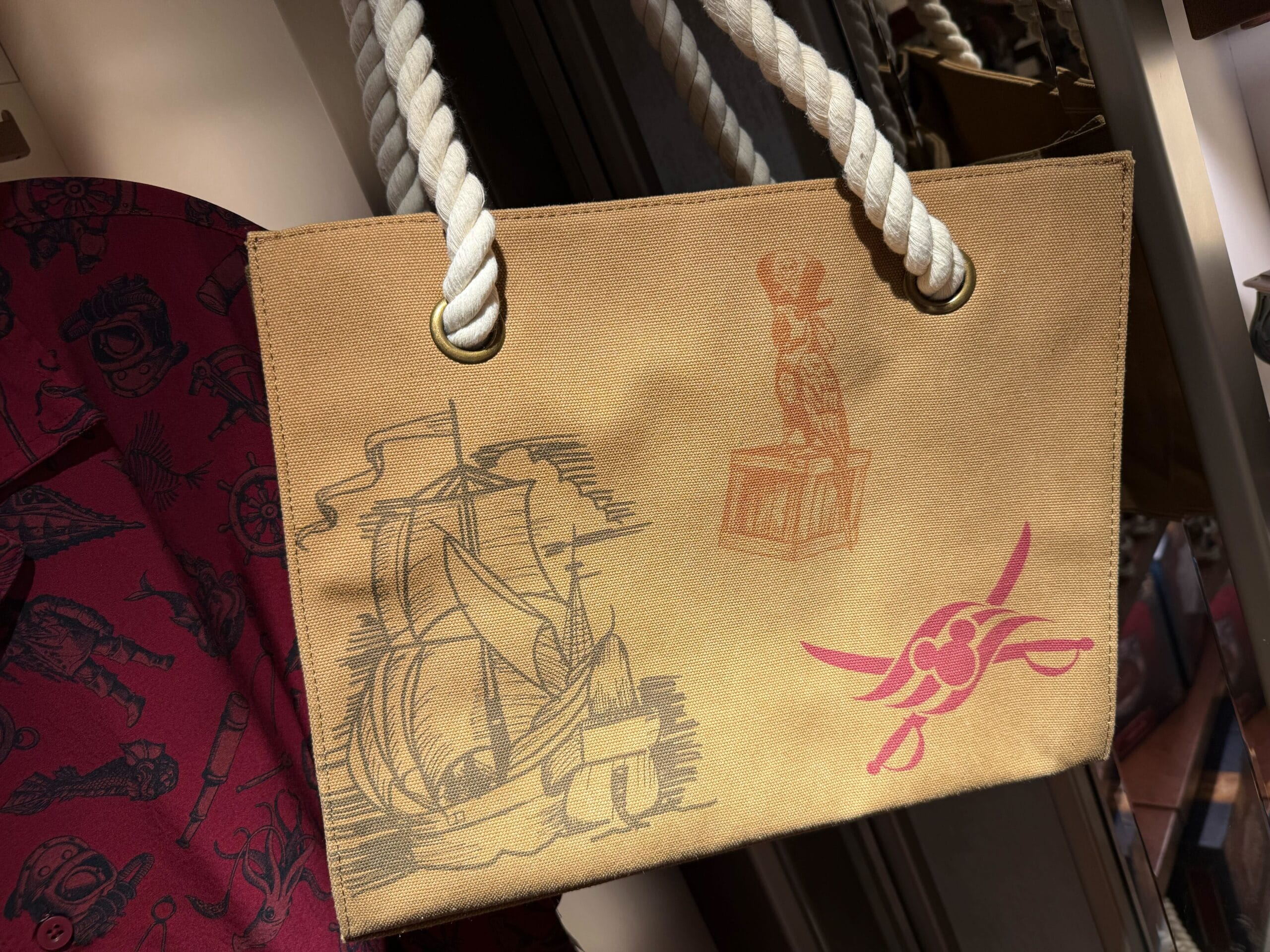 The tan canvas bag has straps made of white rope. There are images on both the front and back, including Peg Leg Pete, the Disney Cruise Line logo in a Pirate-style, the ship, and more.