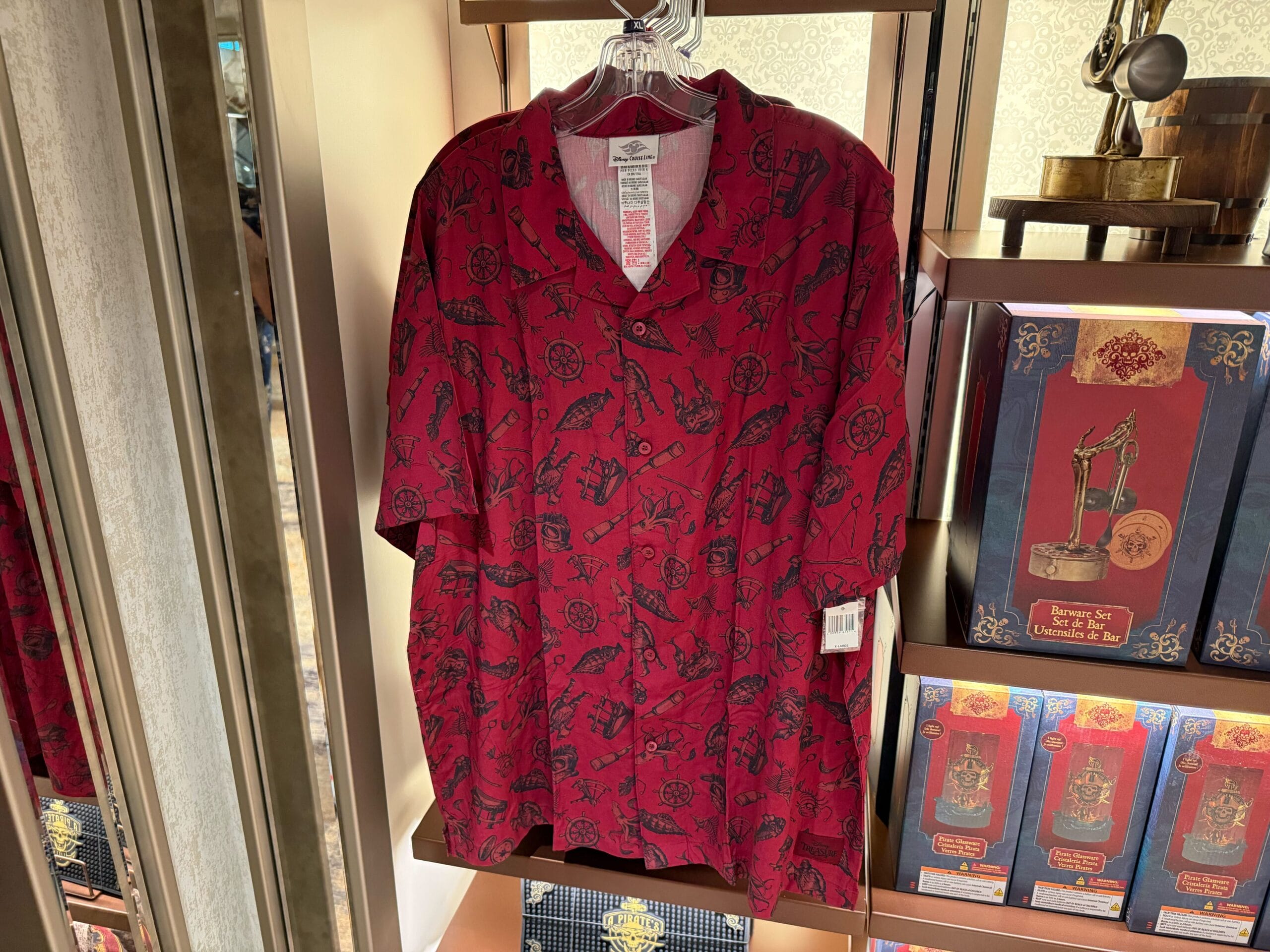 This deep red button-up shirt has an allover print of sketch-style images of tentacles, ships, a captain, fish, spyglass, oar, and more.