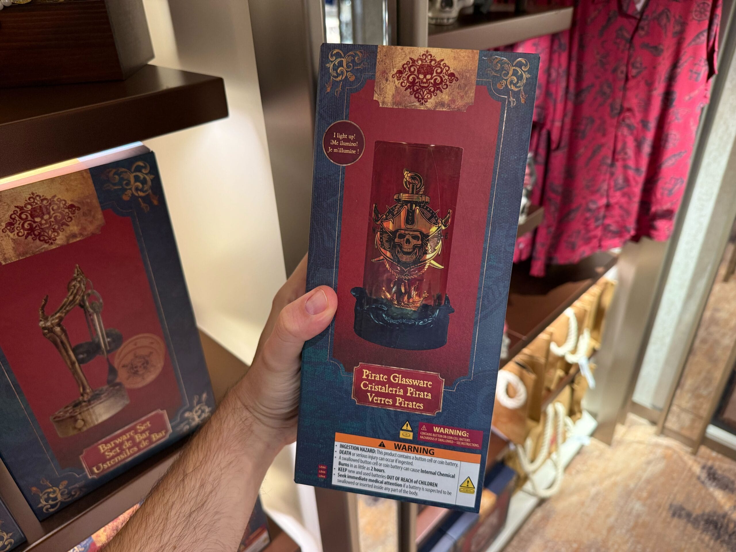 This transparent glass lights up. It has an image of a pirate with sword crossbones, an anchor, and ropes. The bottom of the glass has a ship, and there is a black grip.