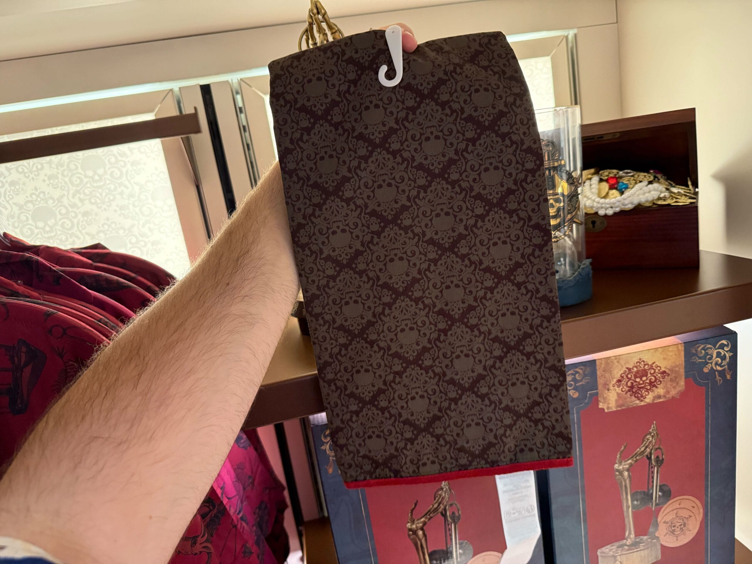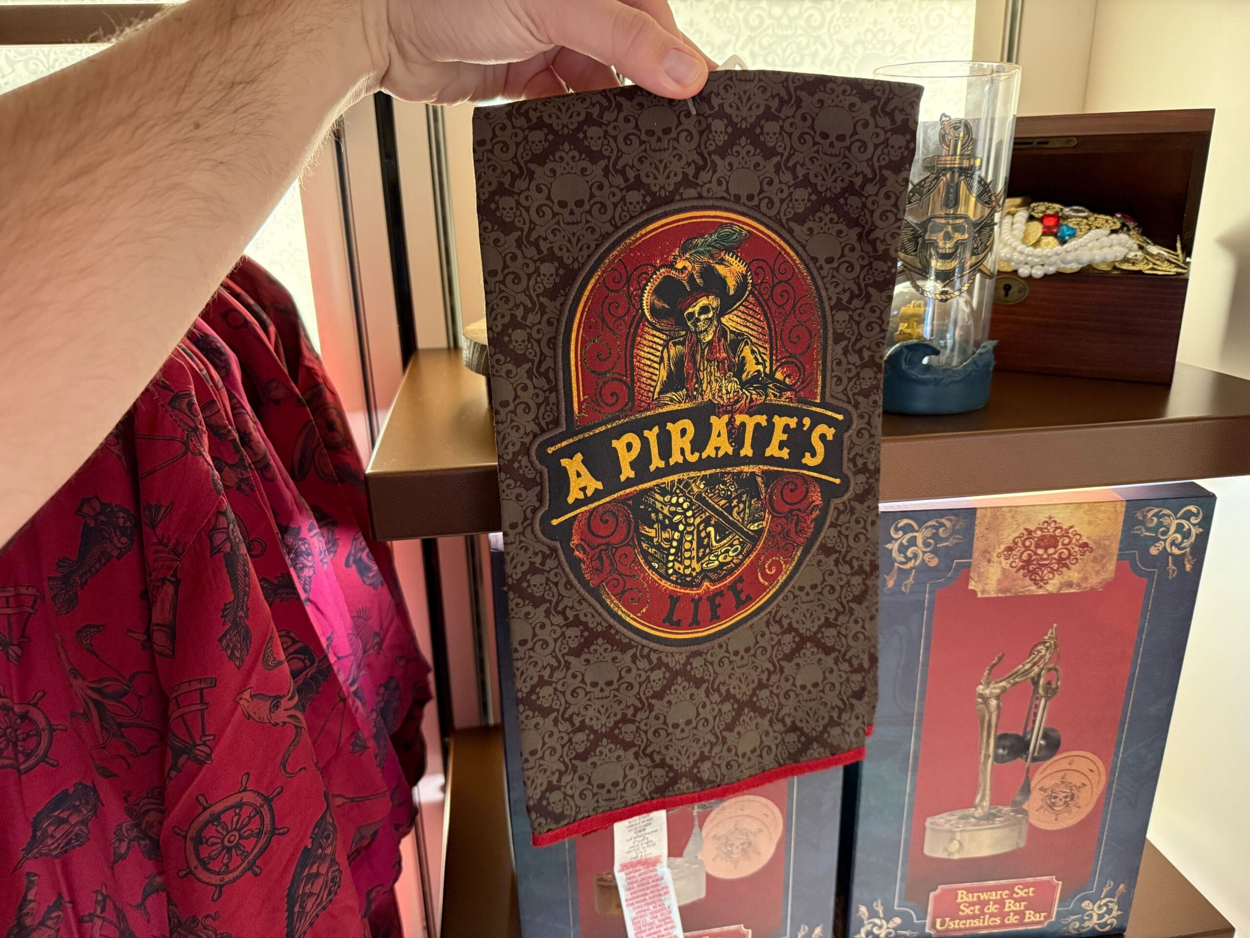 The tea towel has a gray background with a skull damask pattern. In the middle, an embroidered patch has “A Pirate’s Life” text and a skeleton pirate. The bottom of the towel has a red lining. There is nothing on the back except the pattern.