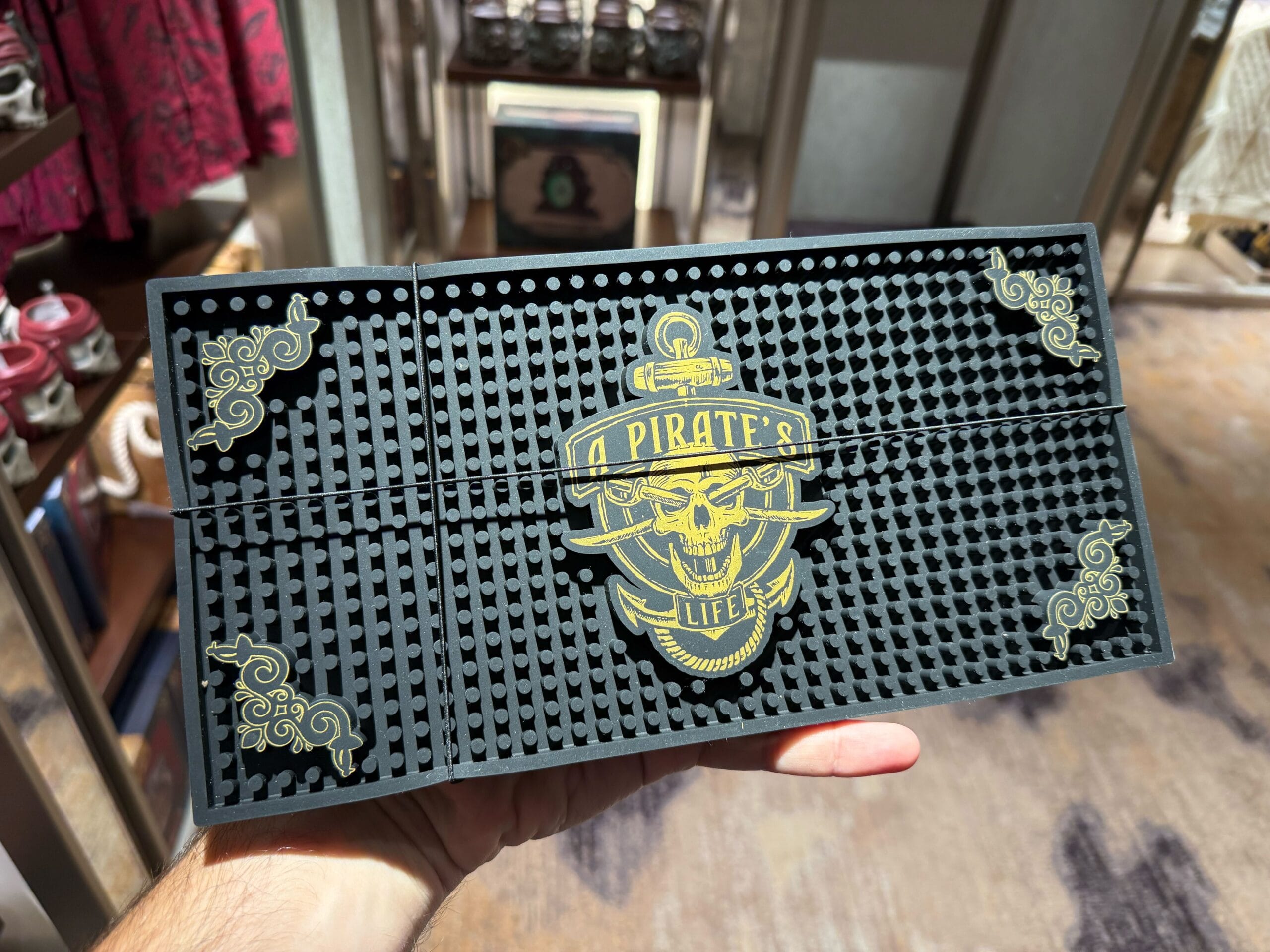 The bar mat is black and each corner has a damask-style accent, and the center has an image that has “A Pirate’s Life” text surrounding a skull with sword crossbones.