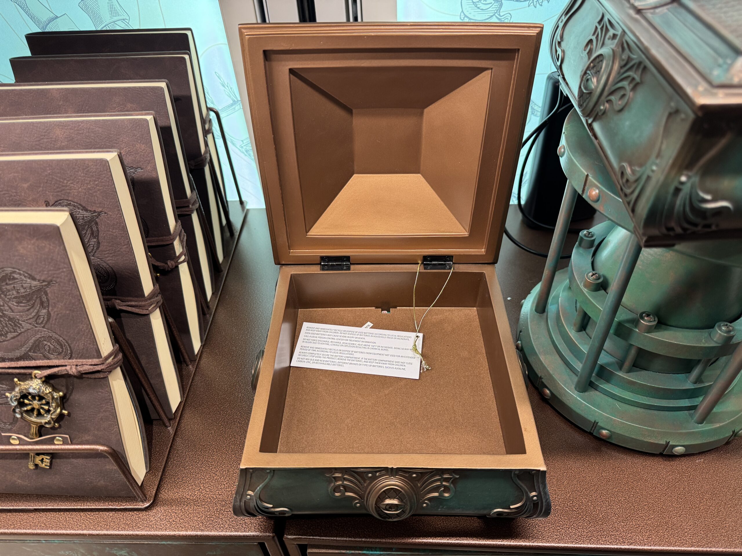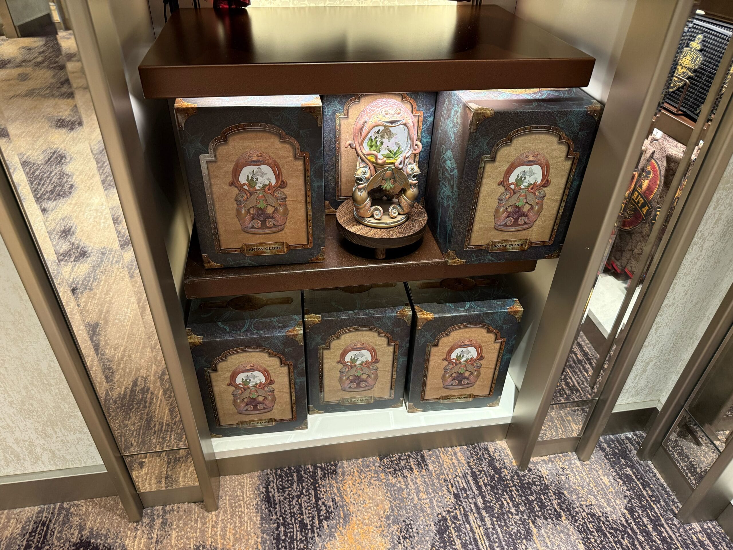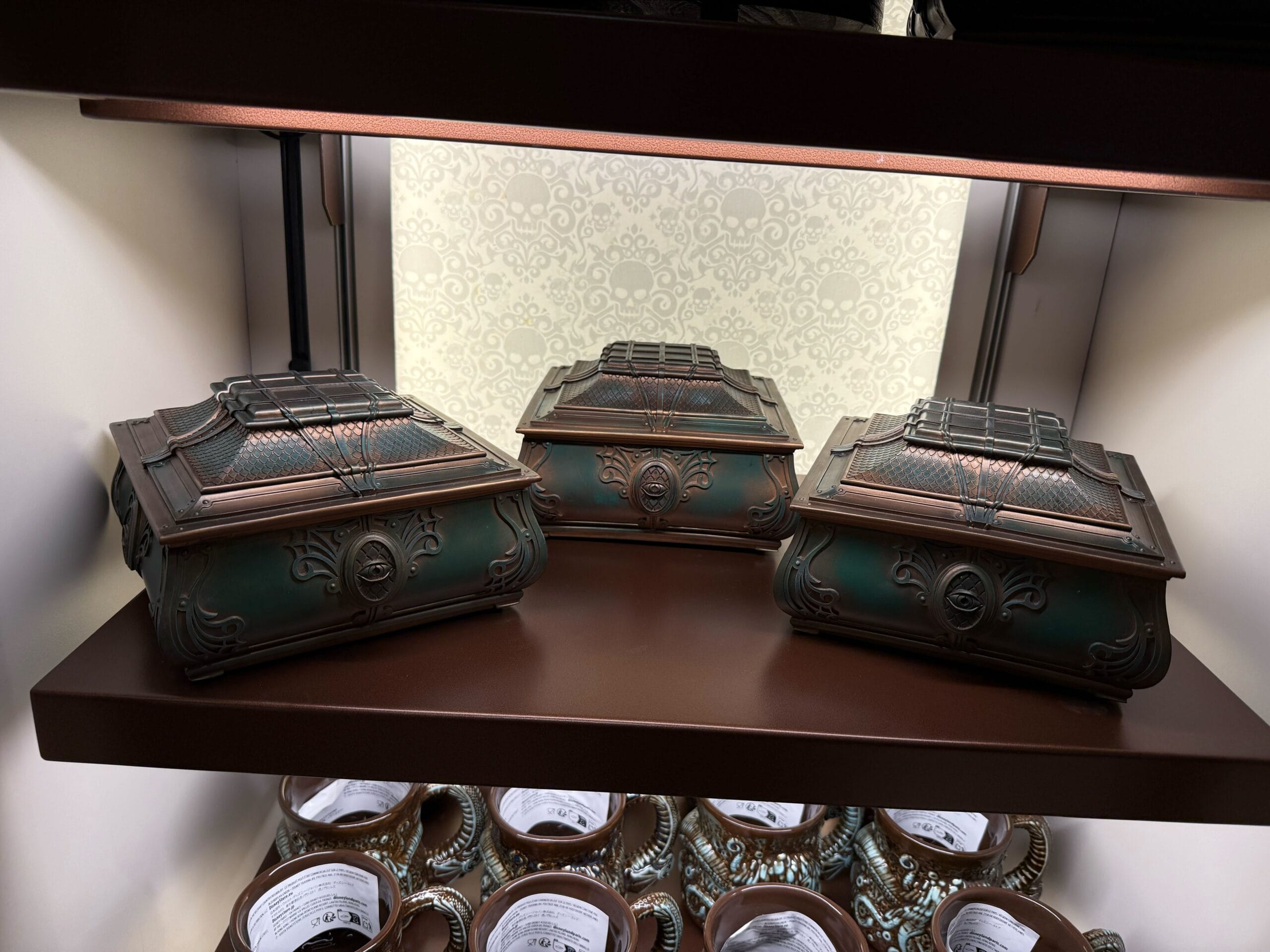 This is inspired by a mysterious music box held in a glass case inside the Haunted Mansion Parlor. On the front is an eye symbol. It’s bronze with touches of green and a scaly lid.
