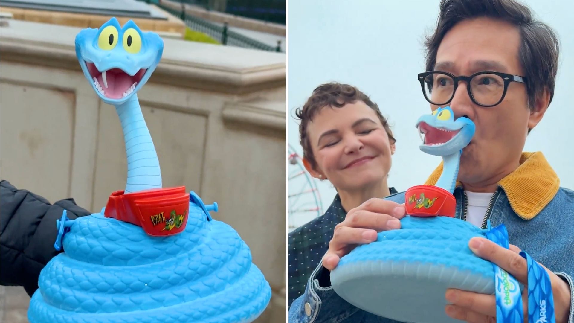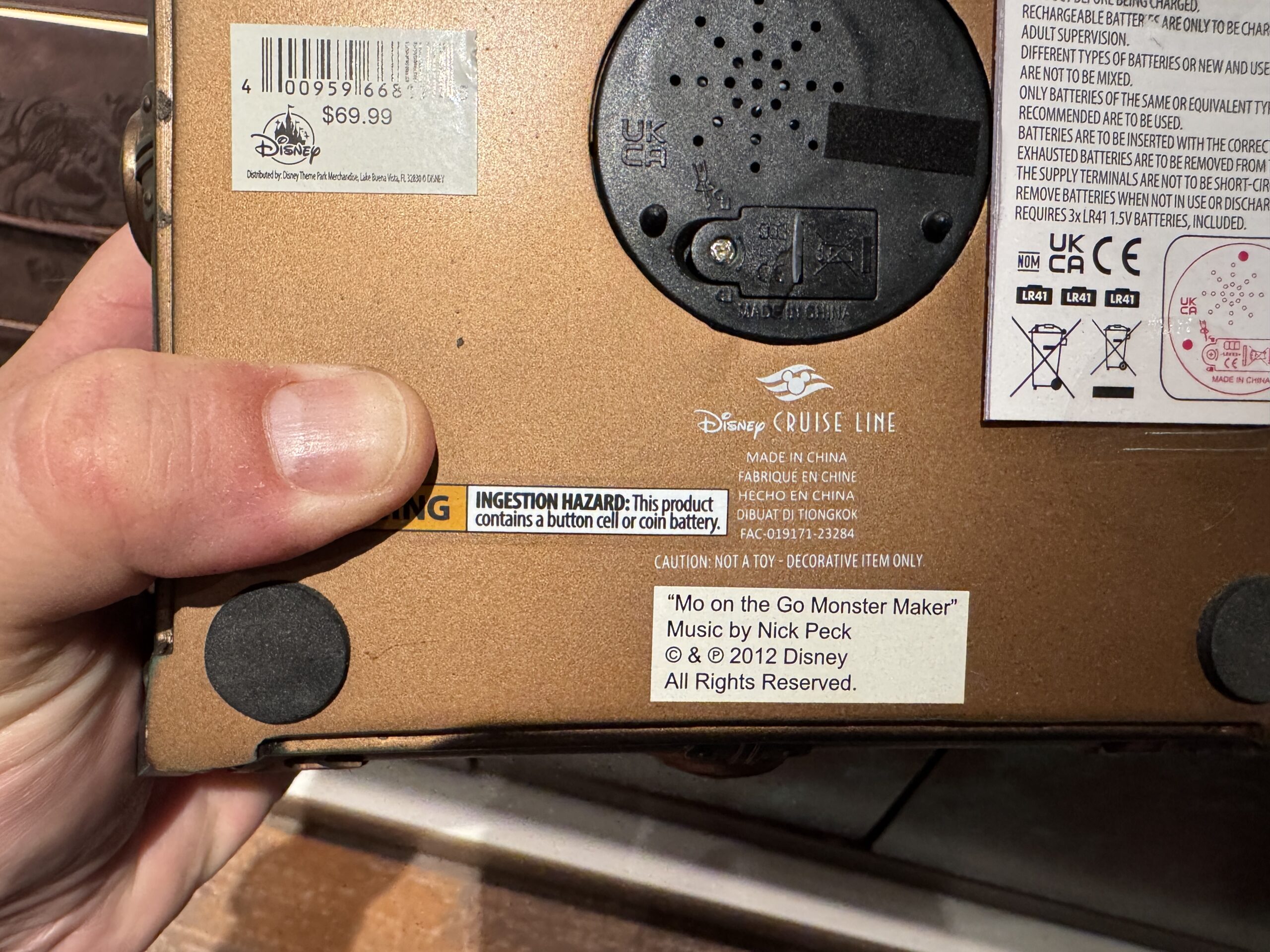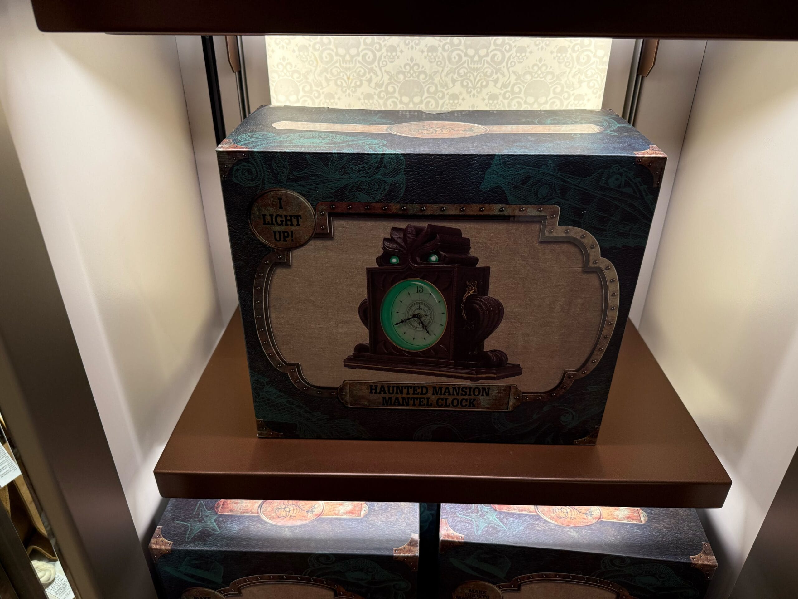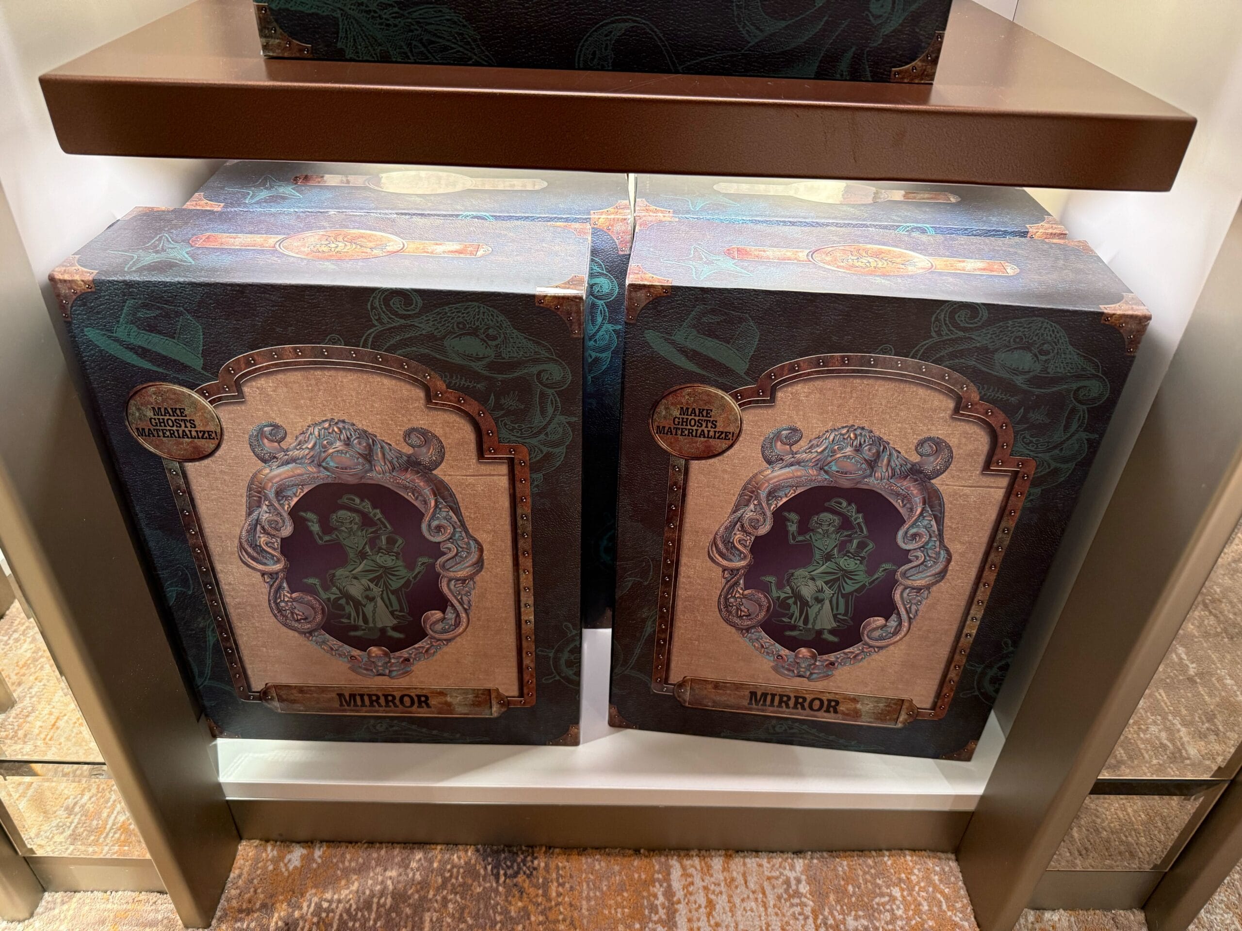 This is inspired by a mysterious music box held in a glass case inside the Haunted Mansion Parlor. On the front is an eye symbol. It’s bronze with touches of green and a scaly lid.