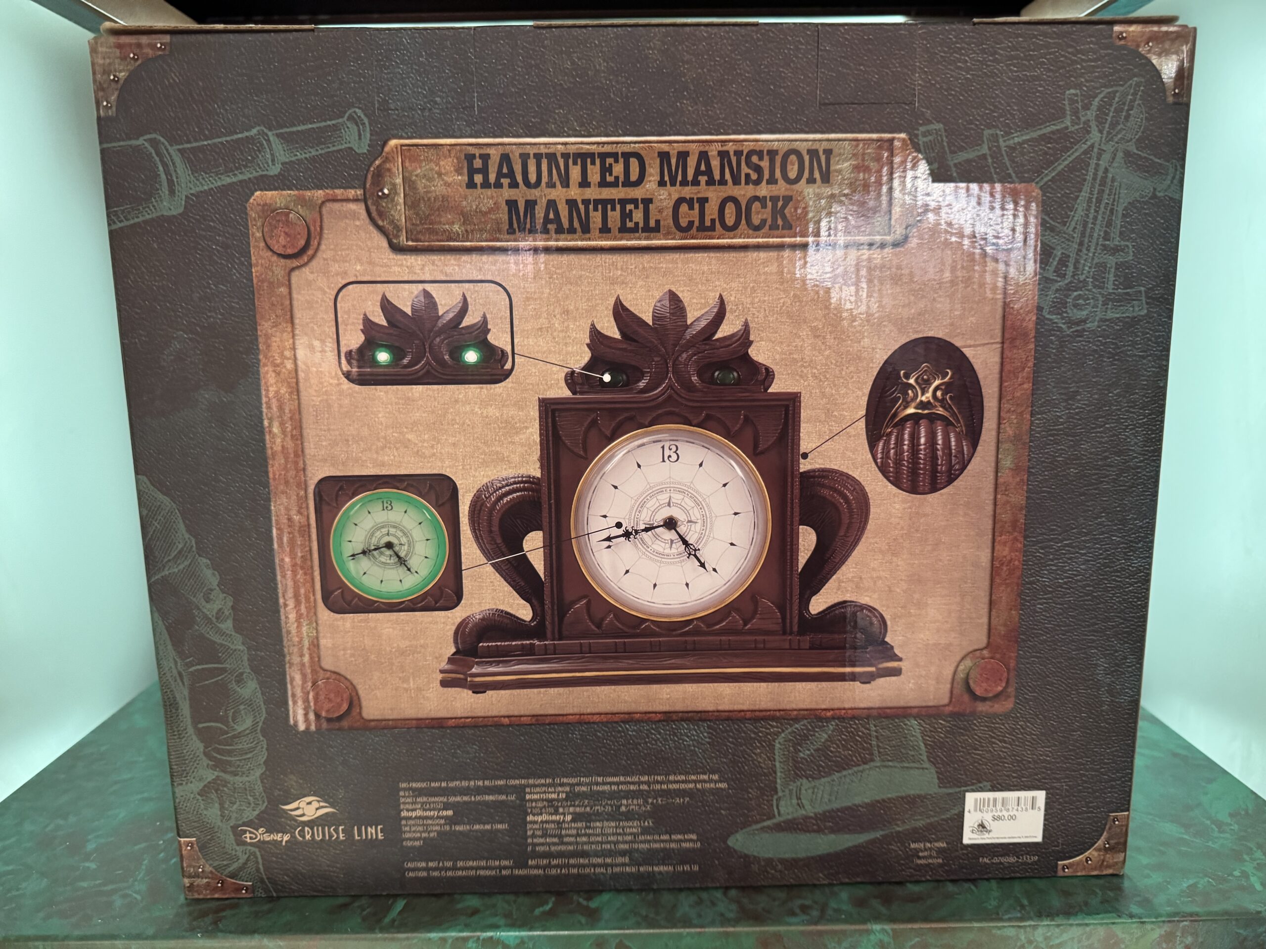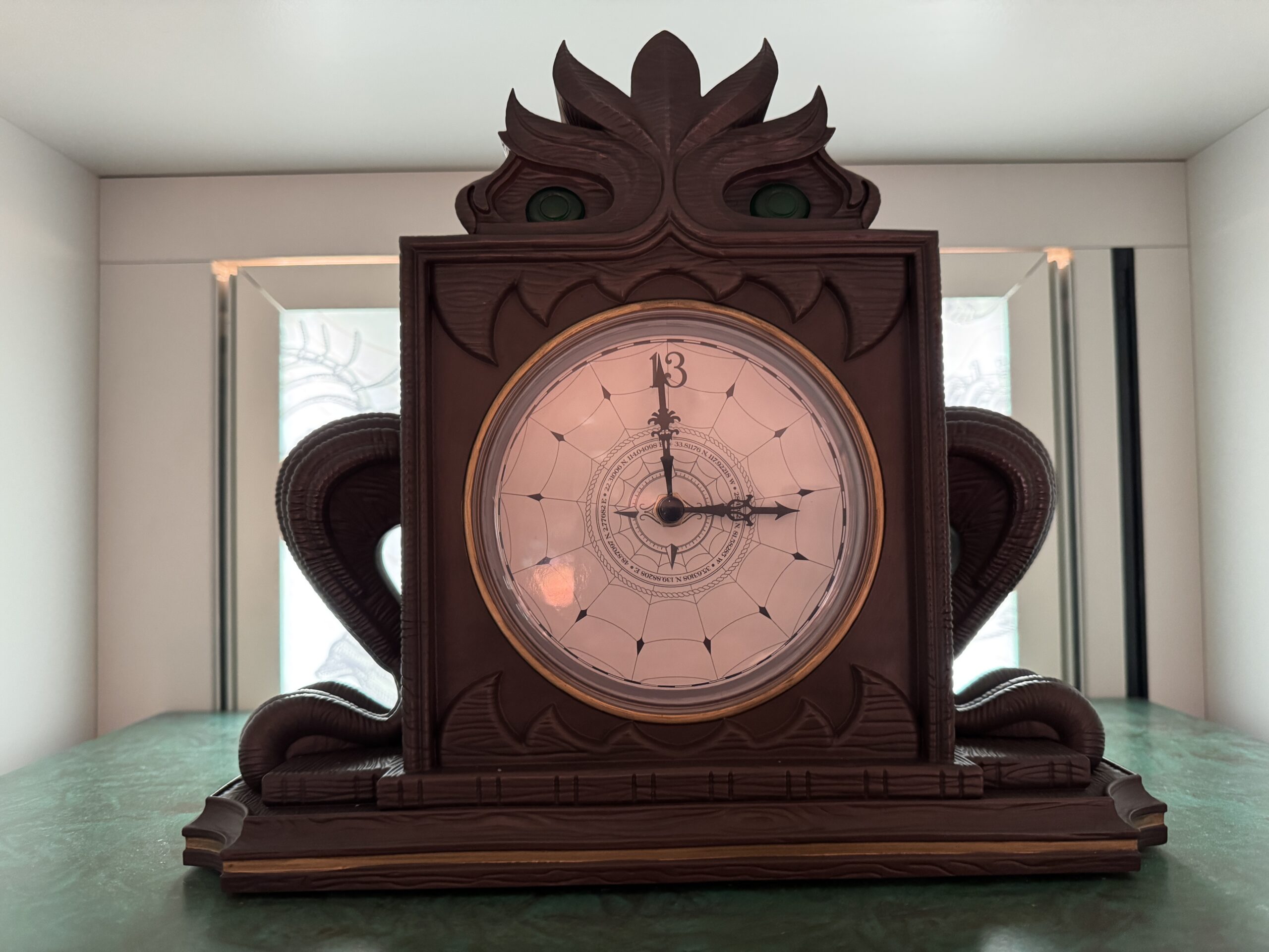 The clock has a glowing green face that goes up to 13 o’clock and glowing green eyes above. It’s bronze.