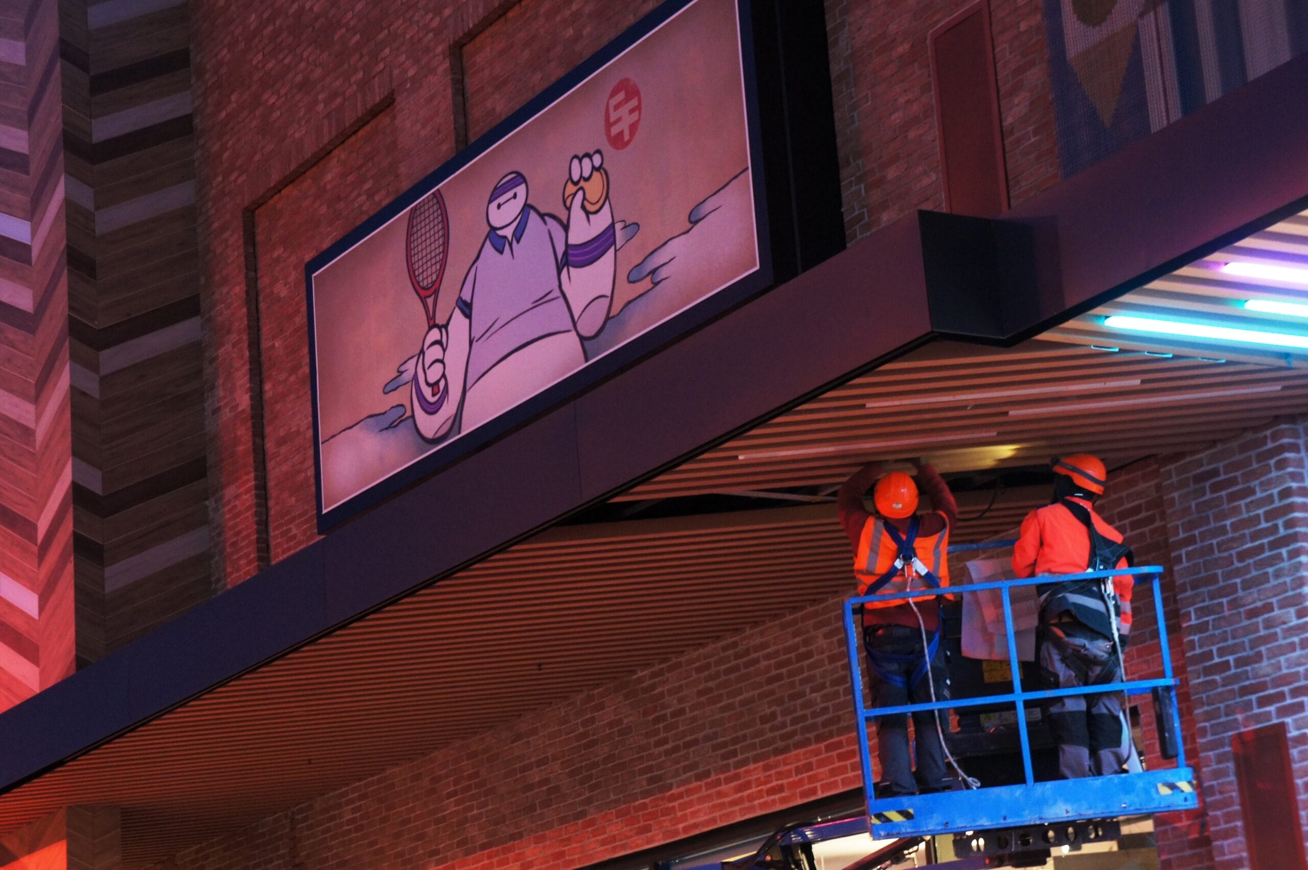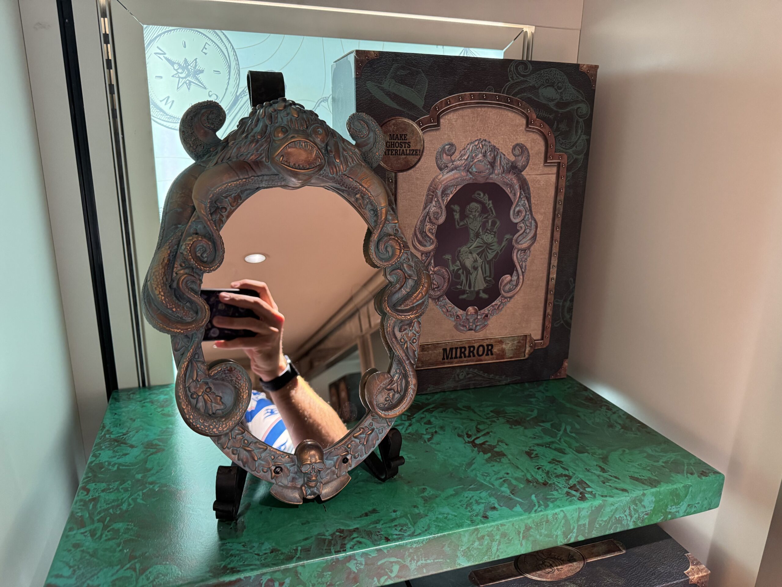 The mirror’s frame is based on the aquarium’s exterior, with the sea creature on top. The three Hitchhiking Ghosts materialize in the glass.