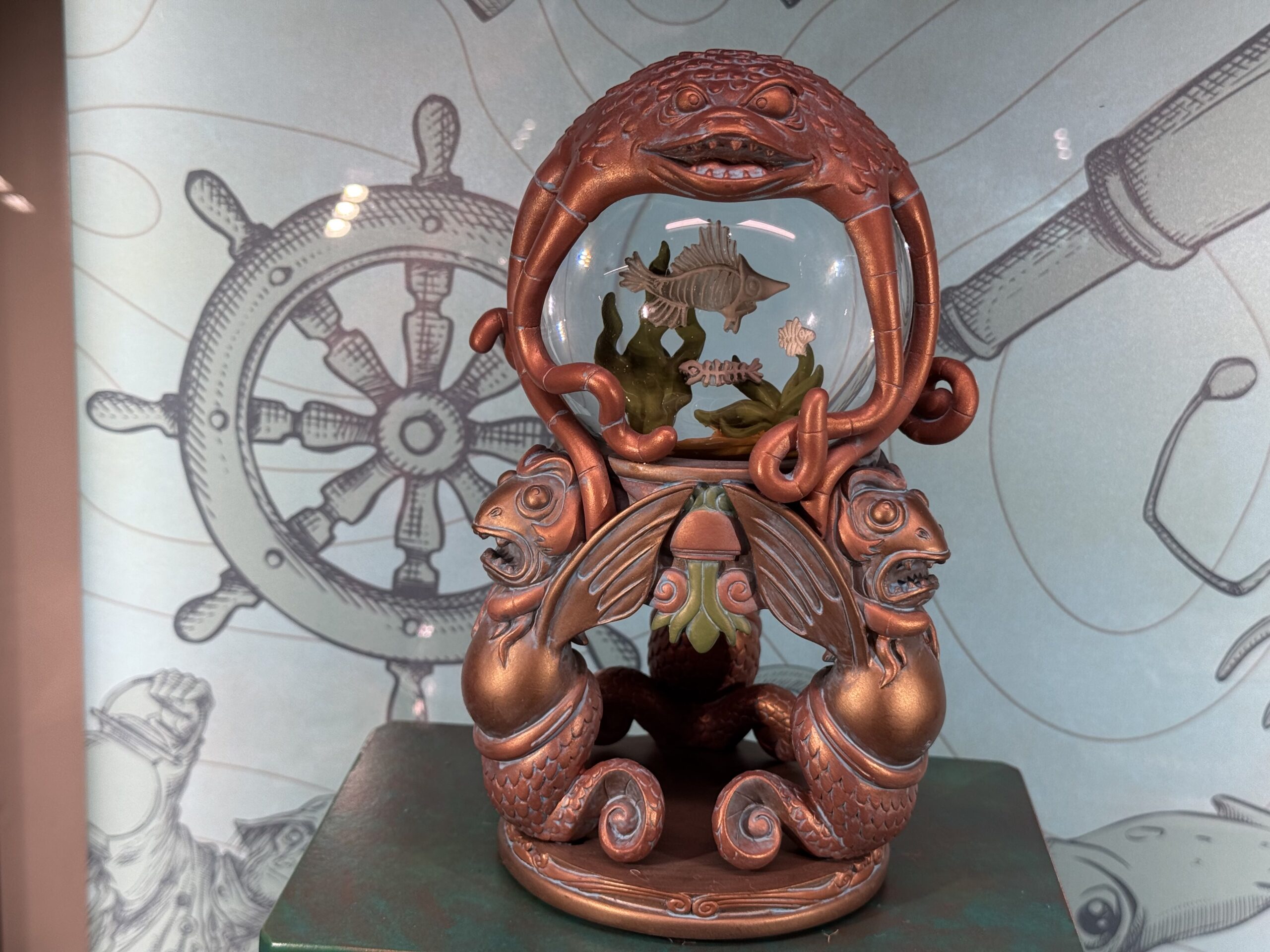 The snow globe is also based on the ghost fish aquarium. The tentacled sea creature sits atop the globe, which has a floating fake fish inside. Other fish figures support the globe.