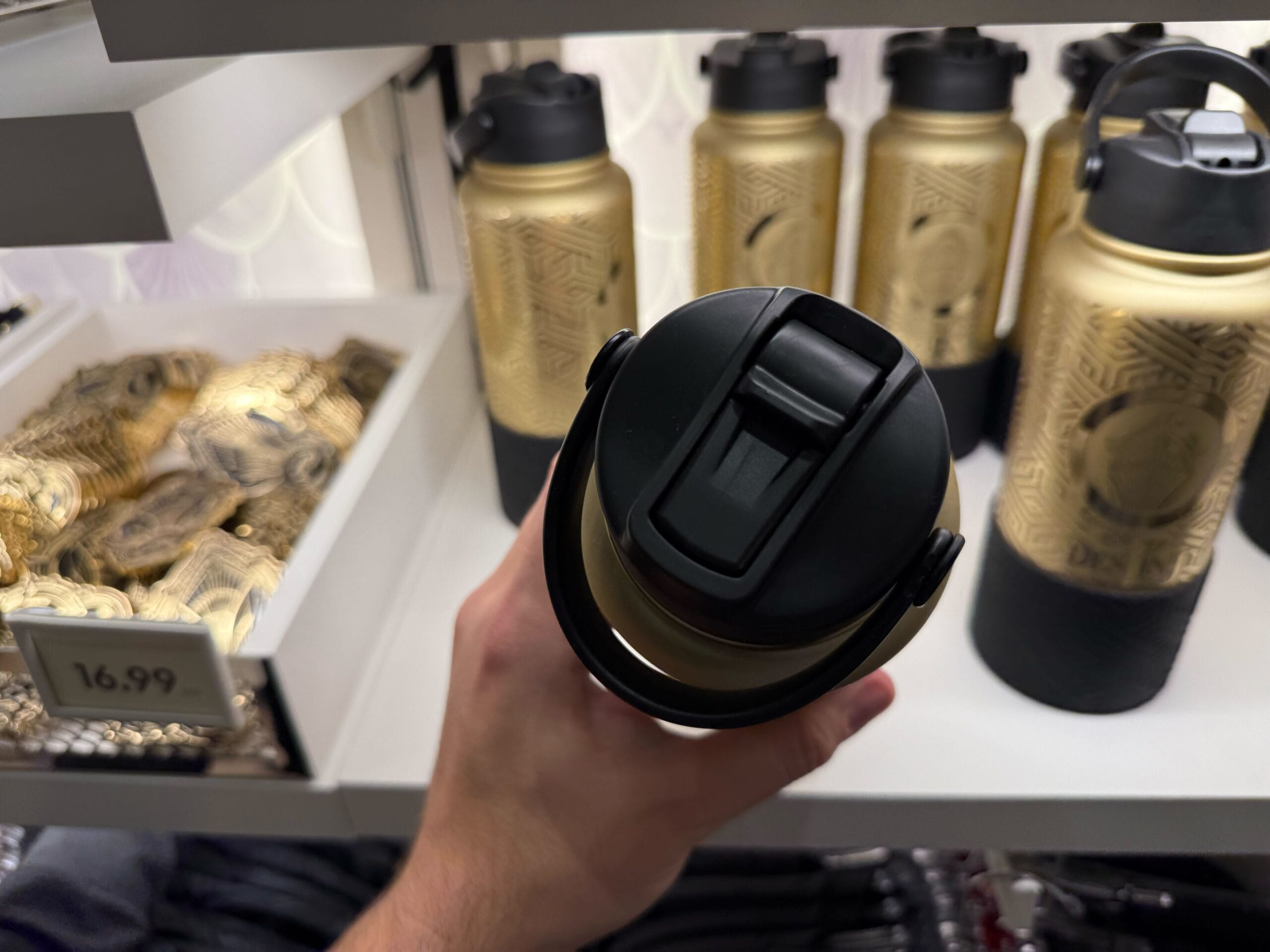 Carry your cold beverage around with all day in this water bottle, which has a flip-top spout and carrying handle. The bottle itself is a shimmery goldtone color with black geometric patterns and an image of the ship. The bottom has a black grip.