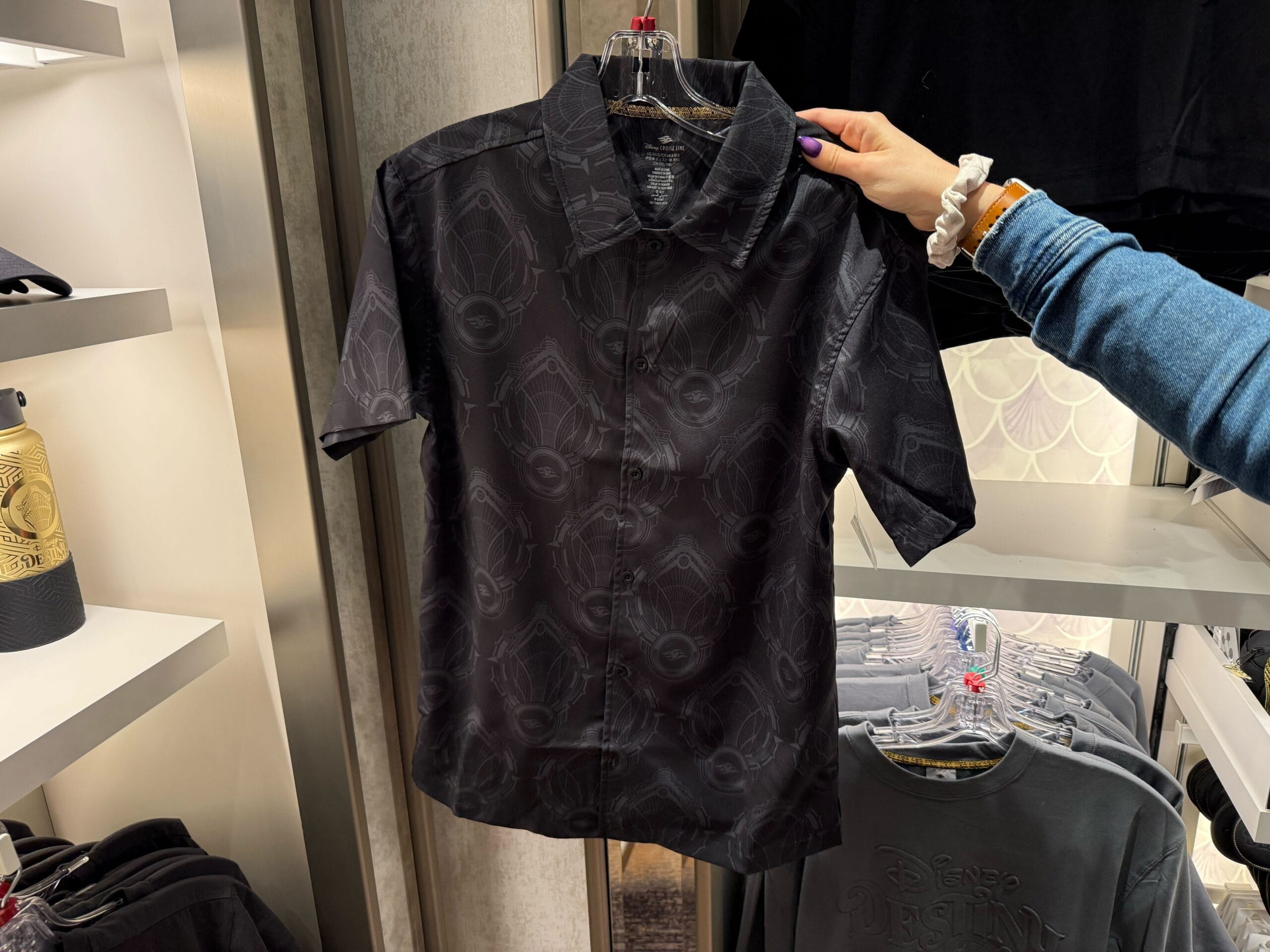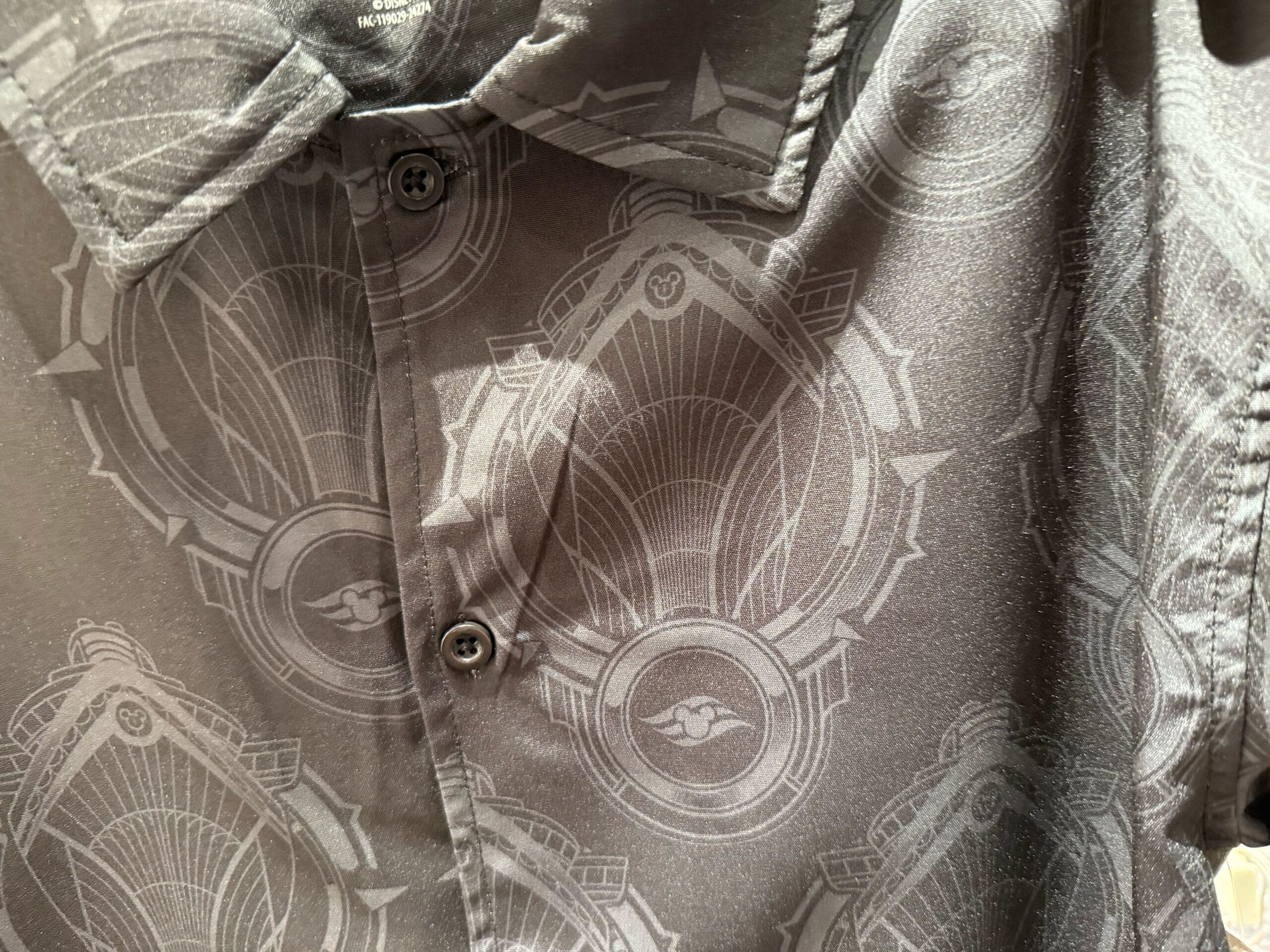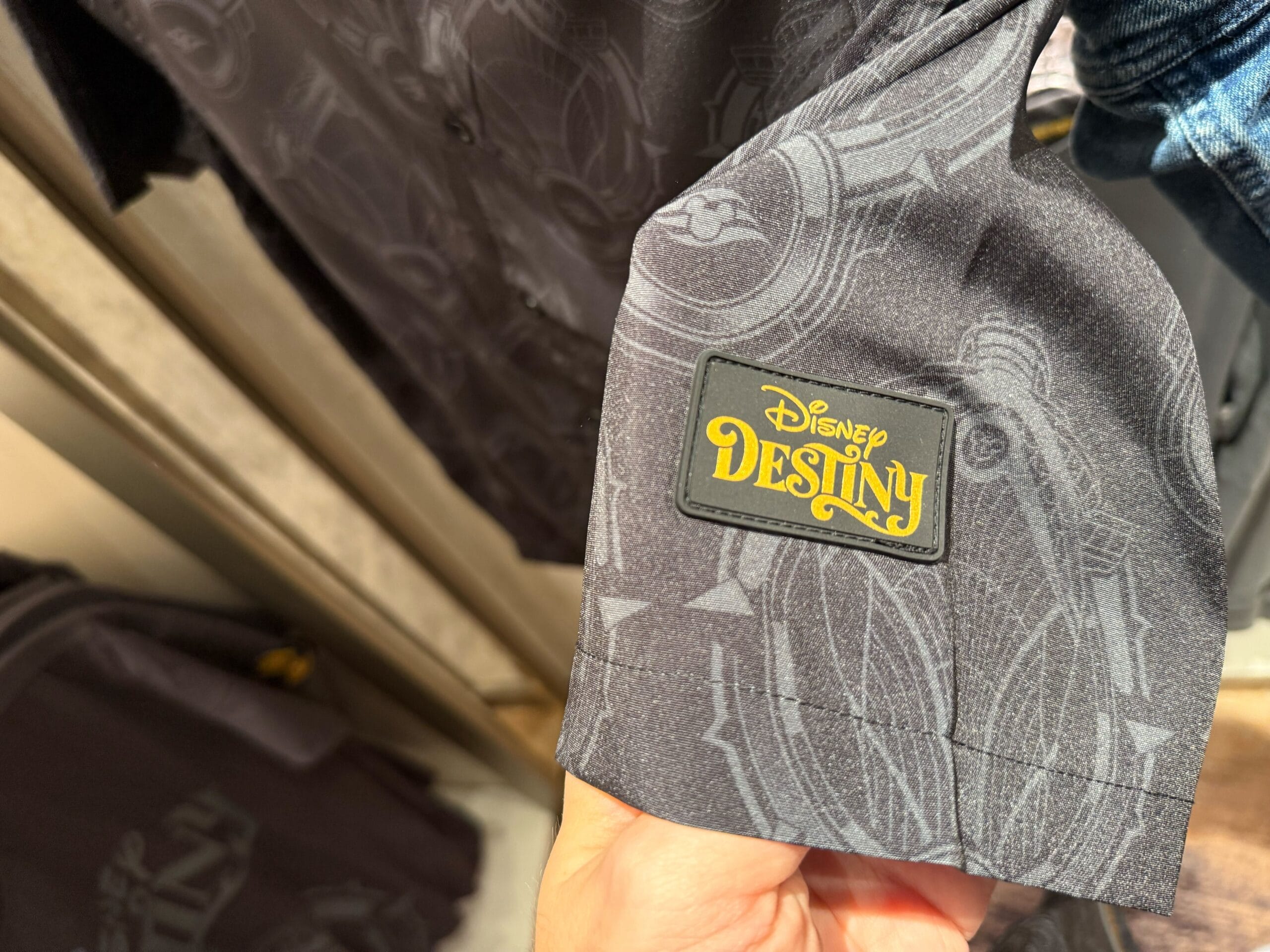 The gray button-up short-sleeve shirt has an allover print of the Disney Destiny ship and Disney Cruise Line logo. A patch on the right sleeve has the Destiny wordmark in yellow.