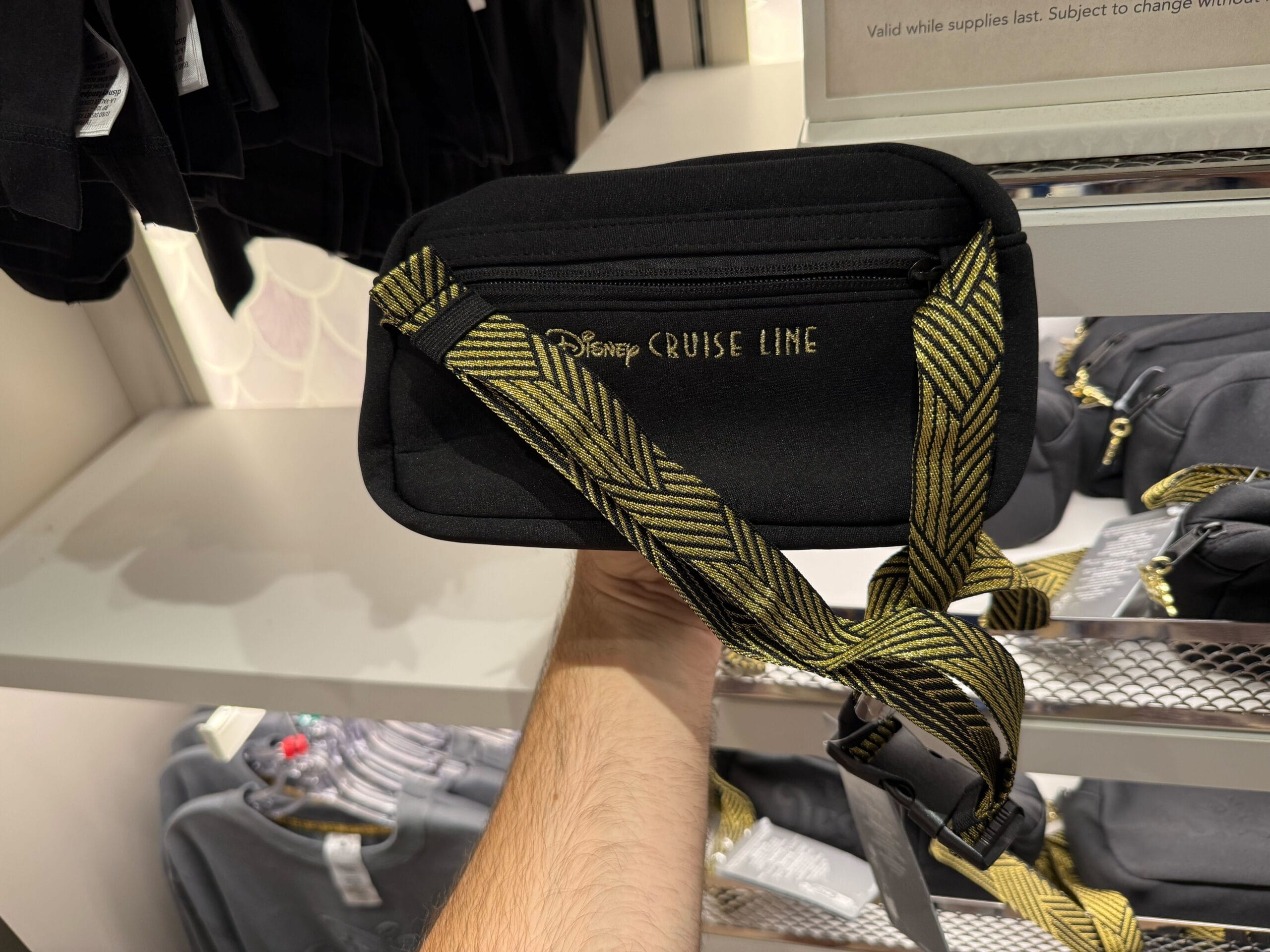 The black belt bag has the Destiny wordmark embossed on the front and the Disney Cruise Line wordmark on the back in yellow text. The adjustable strap has a yellow and black herringbone pattern.