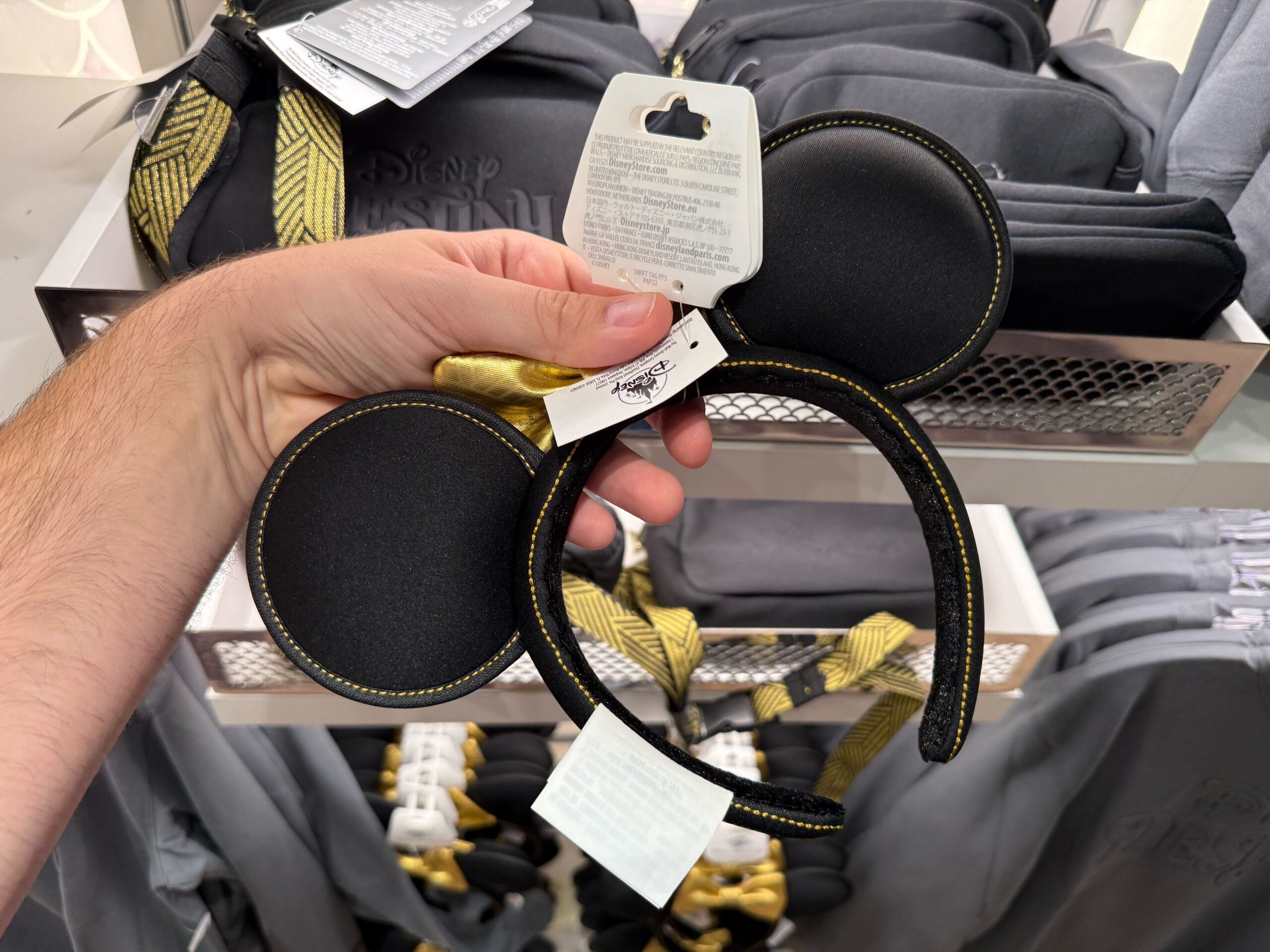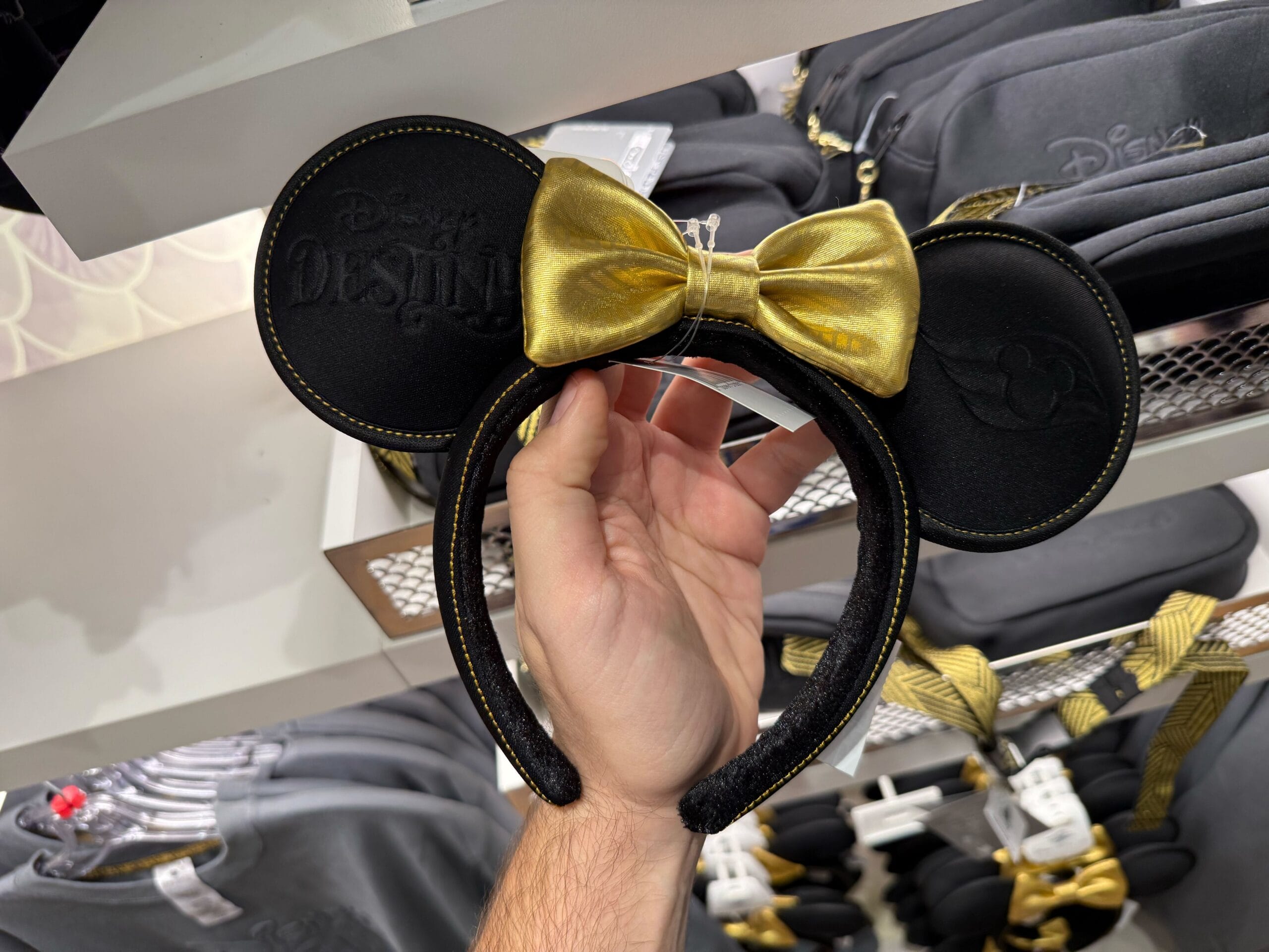 The black ear headband has a shimmery gold bow in the center and embroidered stitching along the headband and ears. Embossed on the ears is the Destiny logo and the Disney Cruise Line logo. The Disney Cruise Line wordmark runs down one side of the headband.