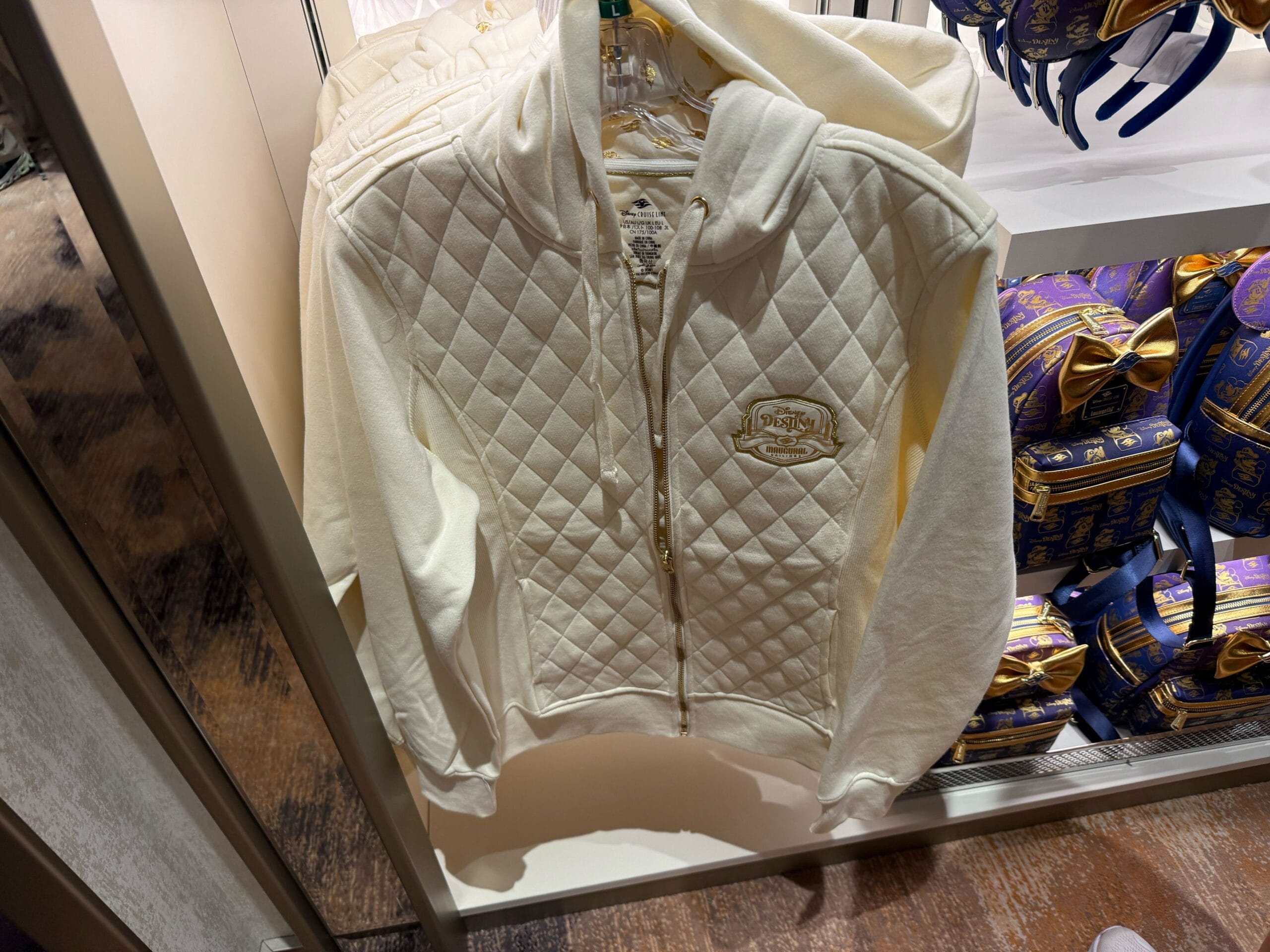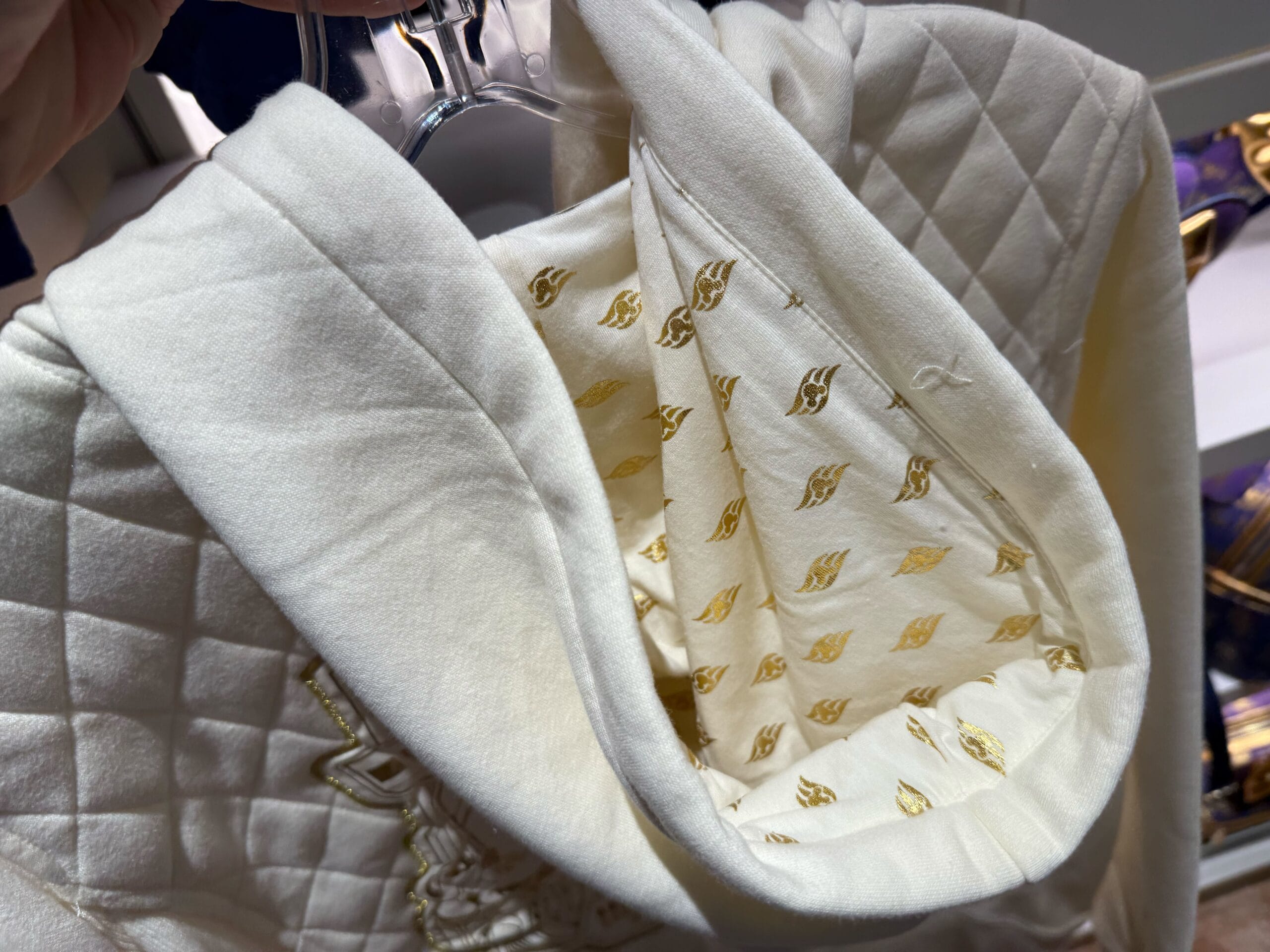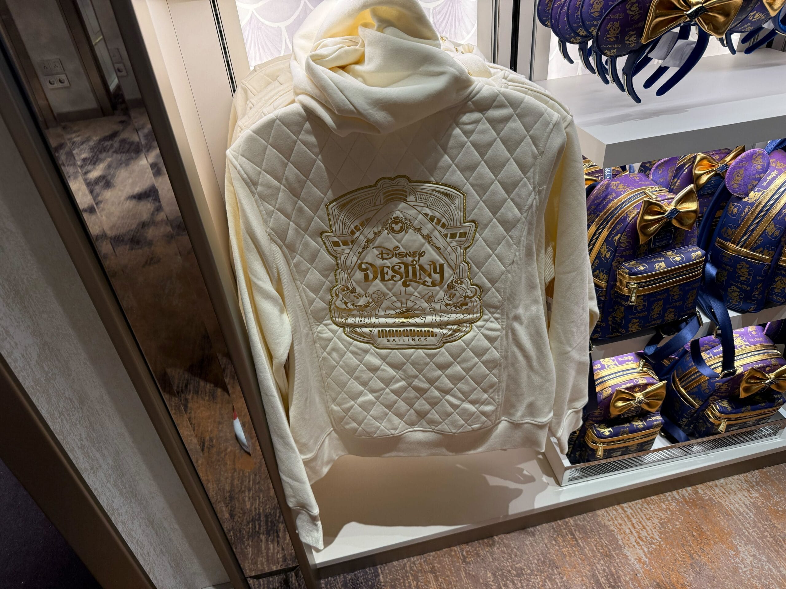 This cream-colored quilted jacket features goldtone details on the zipper, Inaugural Sailings chest logo, and on the large image on the back. The hood has an allover print with goldtone Disney Cruise Line logos.