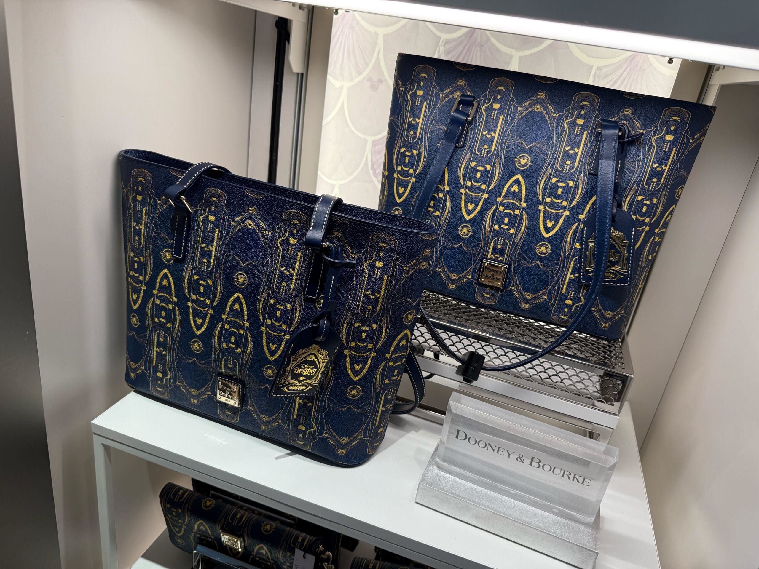 The Dooney & Bourke tote bag (top right in the photo above) is navy blue with goldtone sketch-like images of the top of the ship. It has the brand logo nameplate on the front.