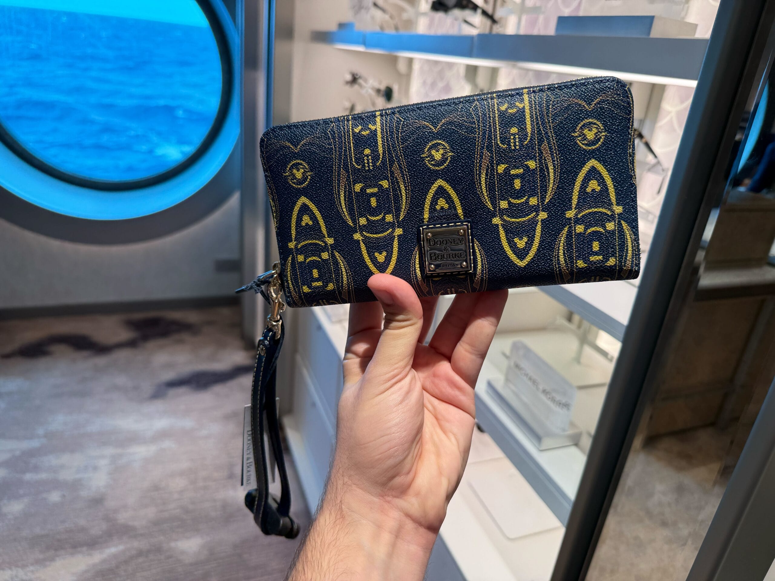 The Dooney & Bourke crossbody bag (bottom left in the photo above) is navy blue with goldtone sketch-like images of the top of the ship. It has the brand logo nameplate on the front.