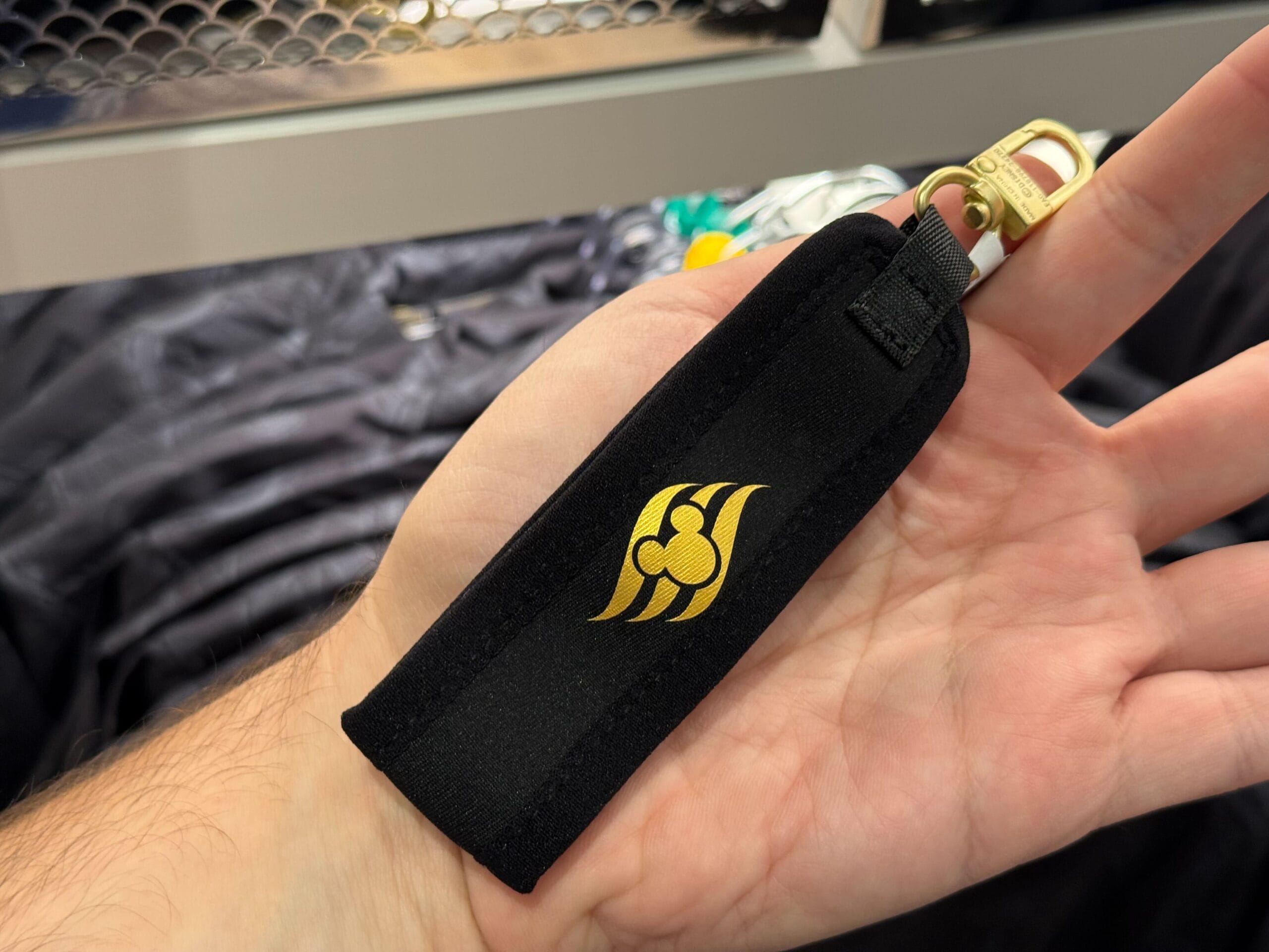One side of the black fabric keychain has the Destiny wordmark, and the other side has the Disney Cruise Line logo.