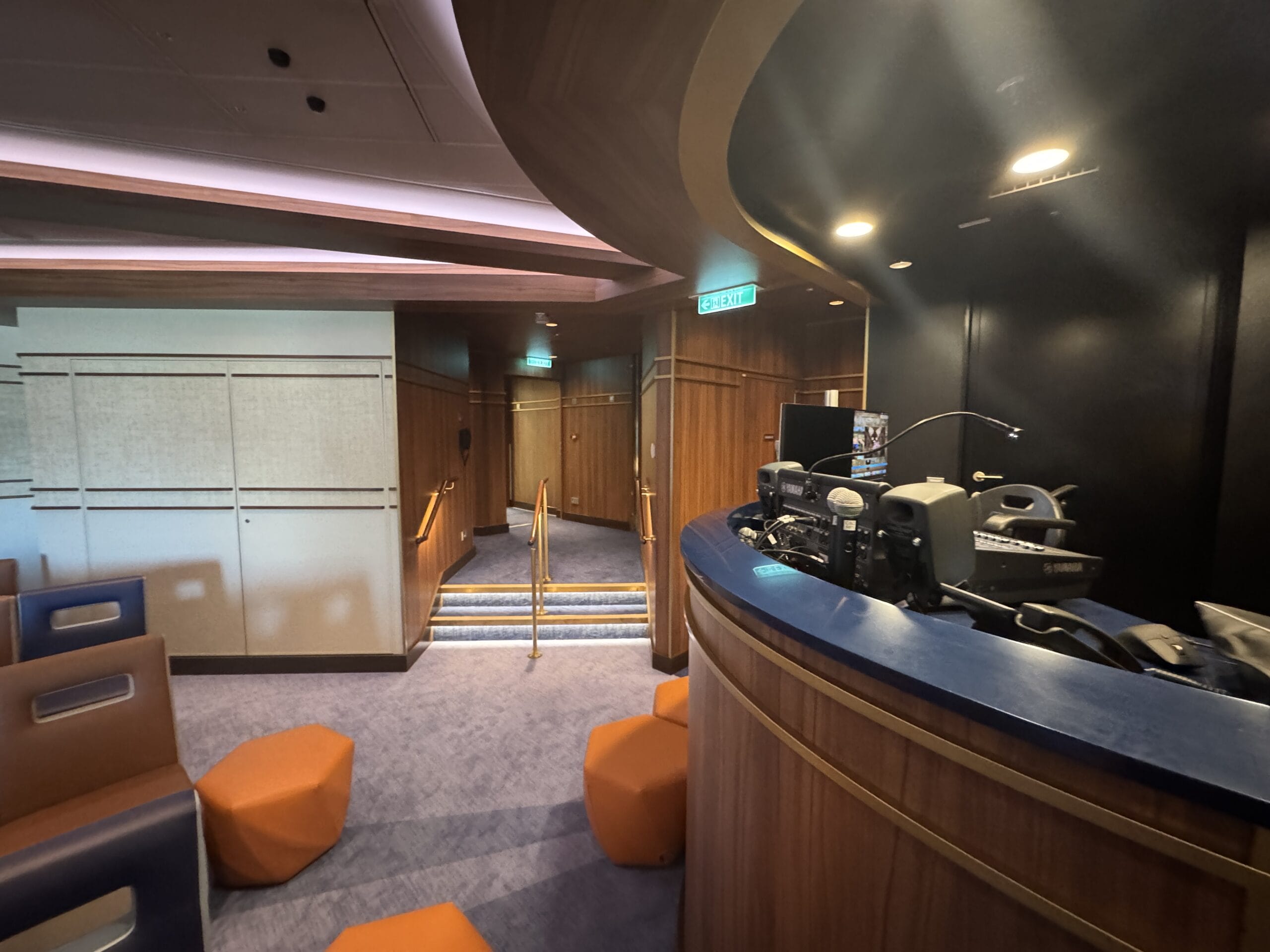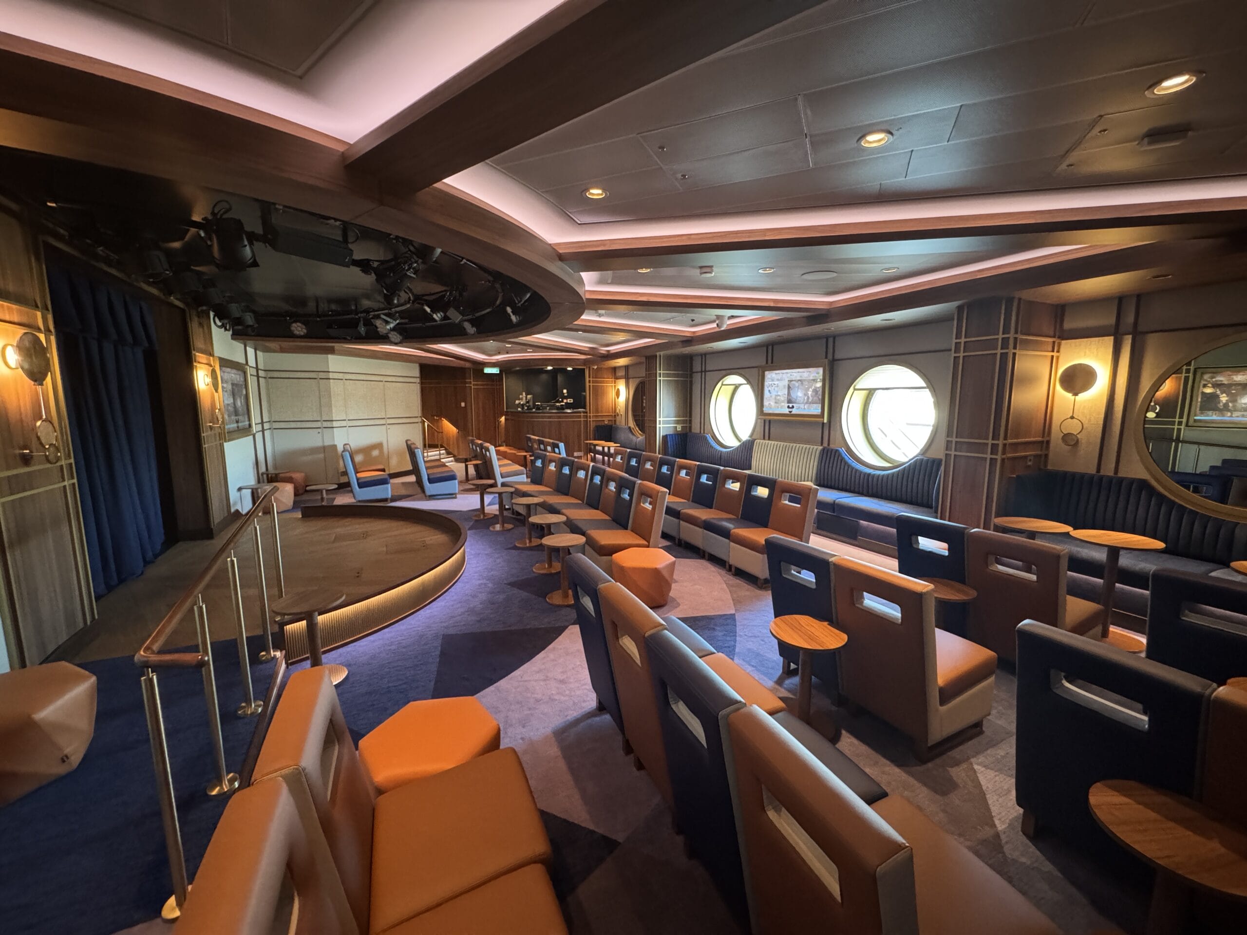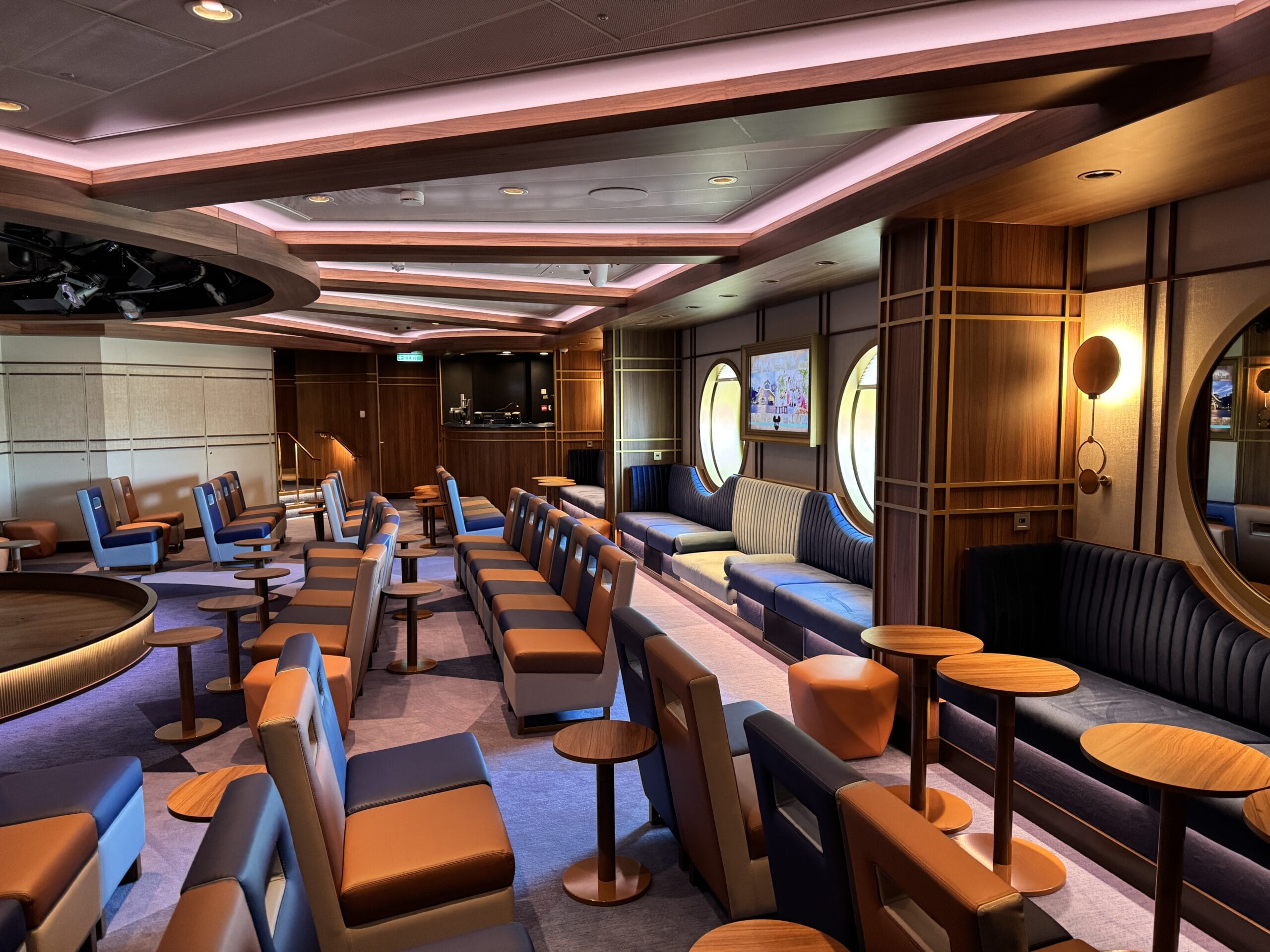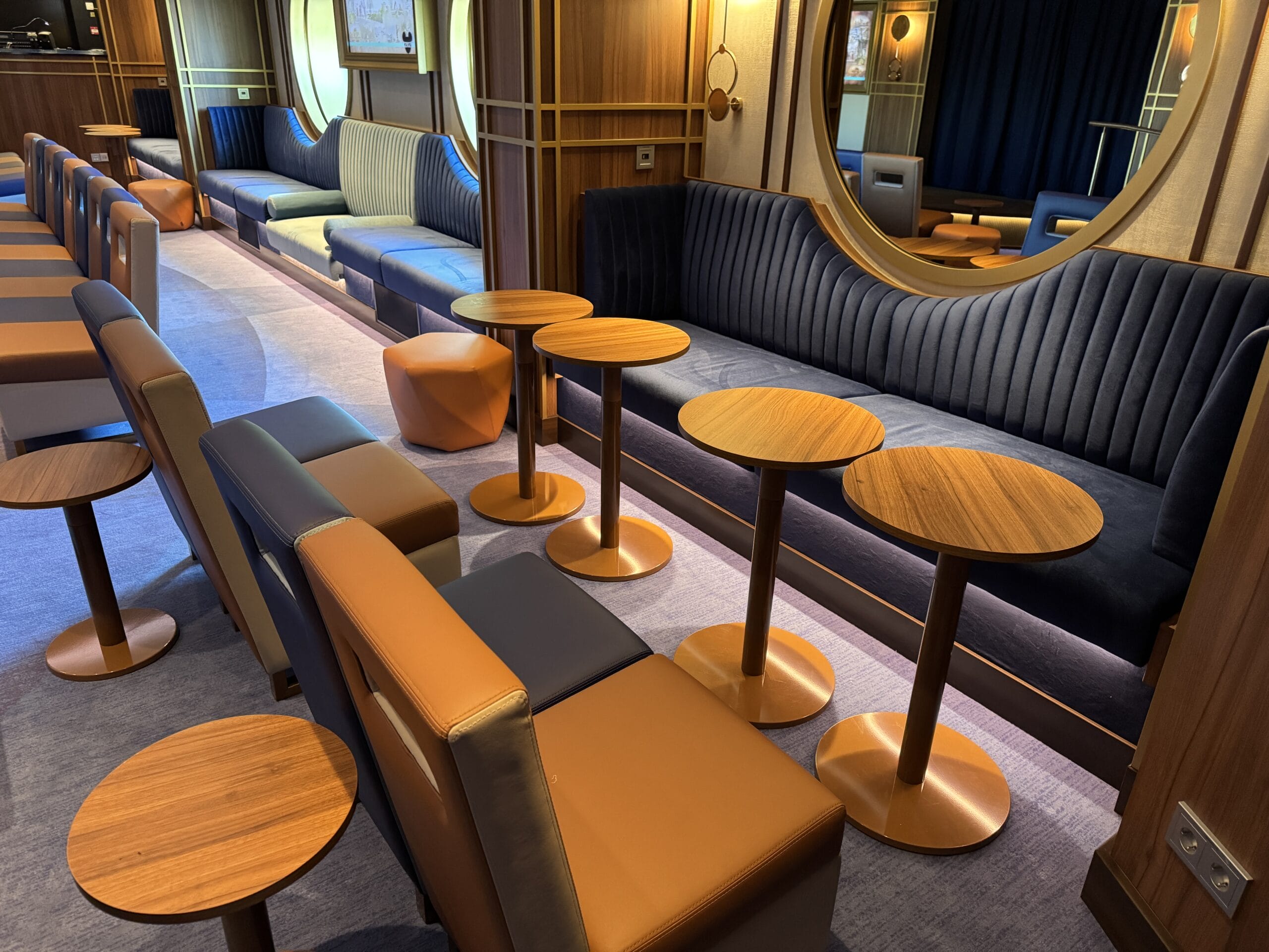The back of the lounge has built-in seating made of a dark blue velour. Large mirrors and portholes line the walls, along with a television screen.