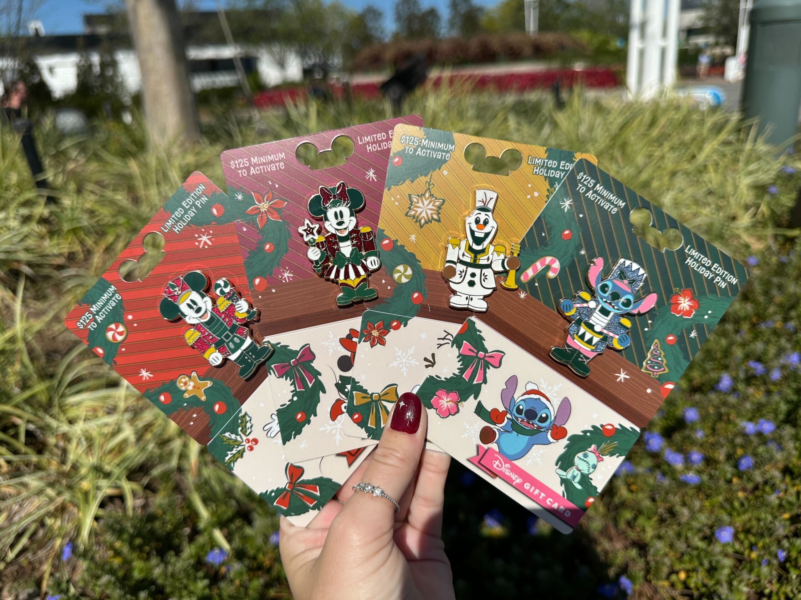 - Purchase Disney gift cards and receive a holiday pin as well. Choose from Mickey, Minnie, Olaf, and Stitch.