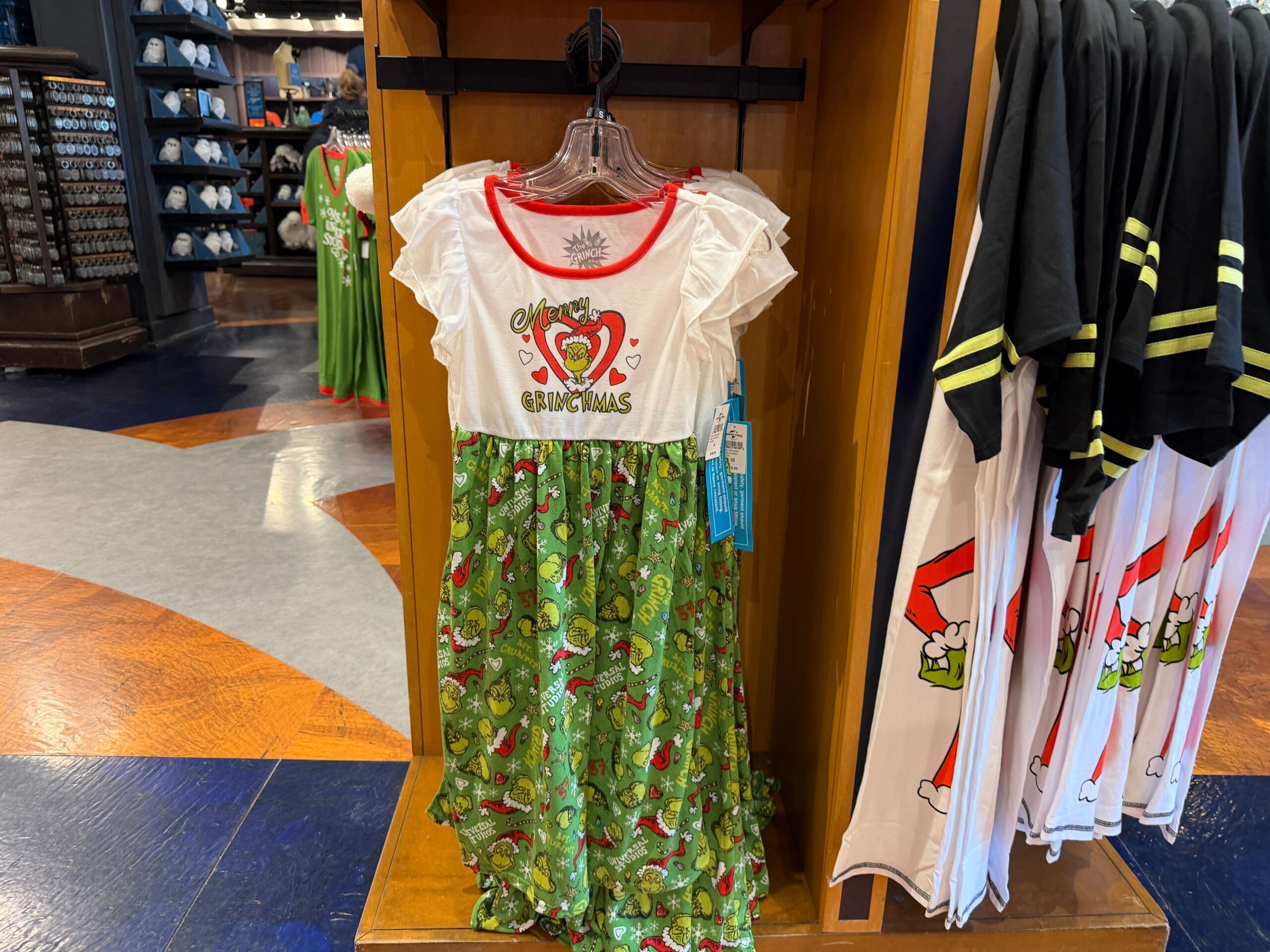 The youth one-piece nightgown has a white shirt with “Merry Grinchmas” text and the Grinch inside of a red heart. The bottom dress portion is green with an allover print of the Grinch.