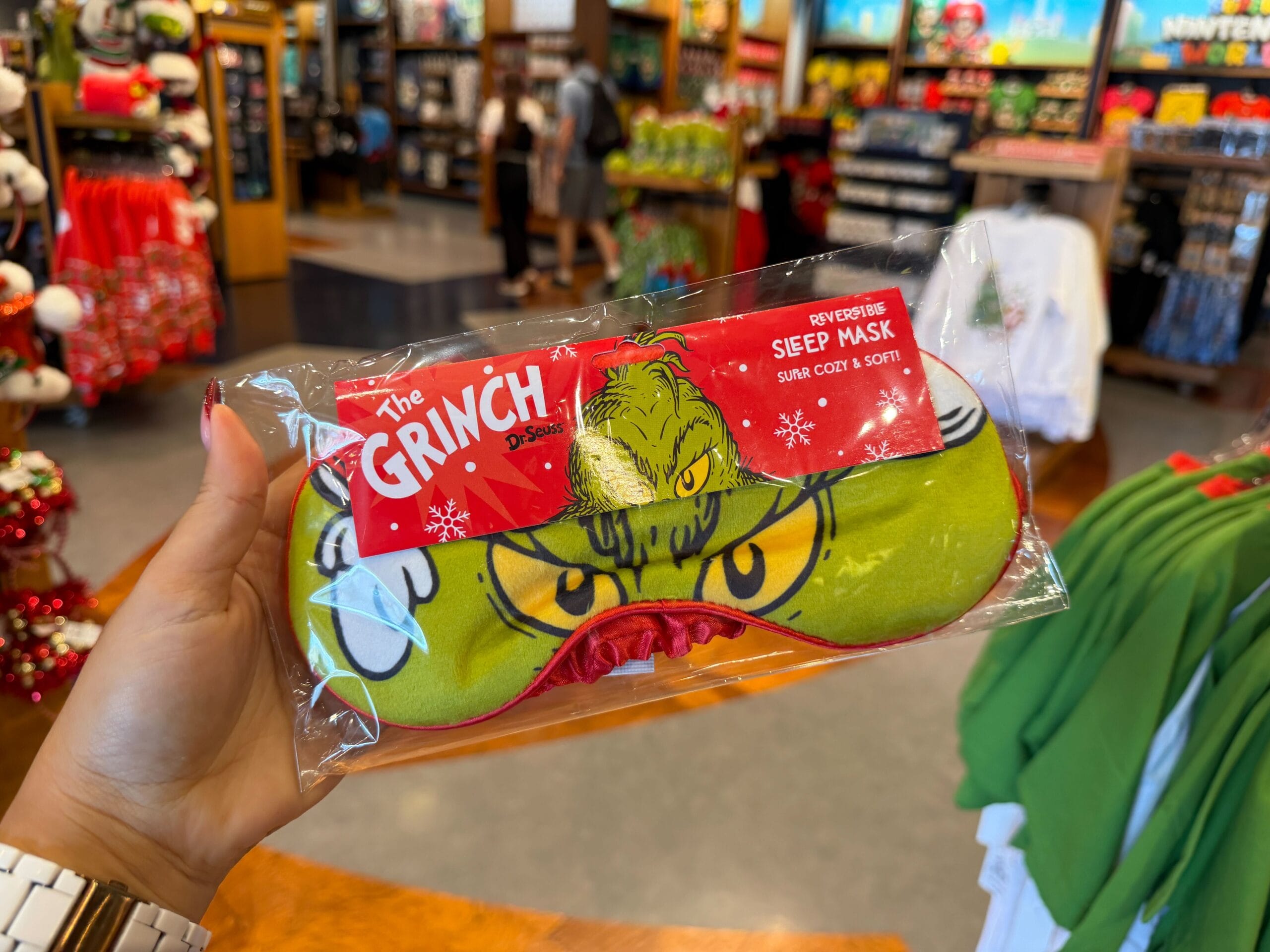 This reversible sleep mask has a red satin headband and an image of the Grinch’s face.