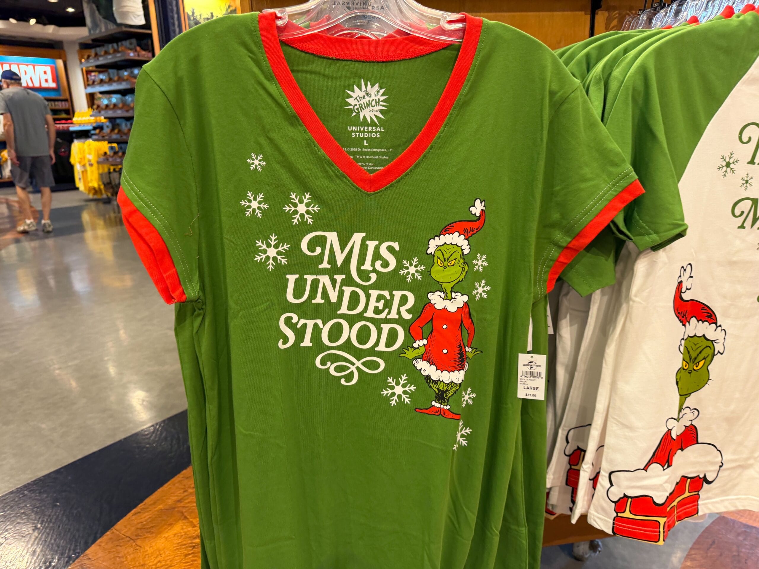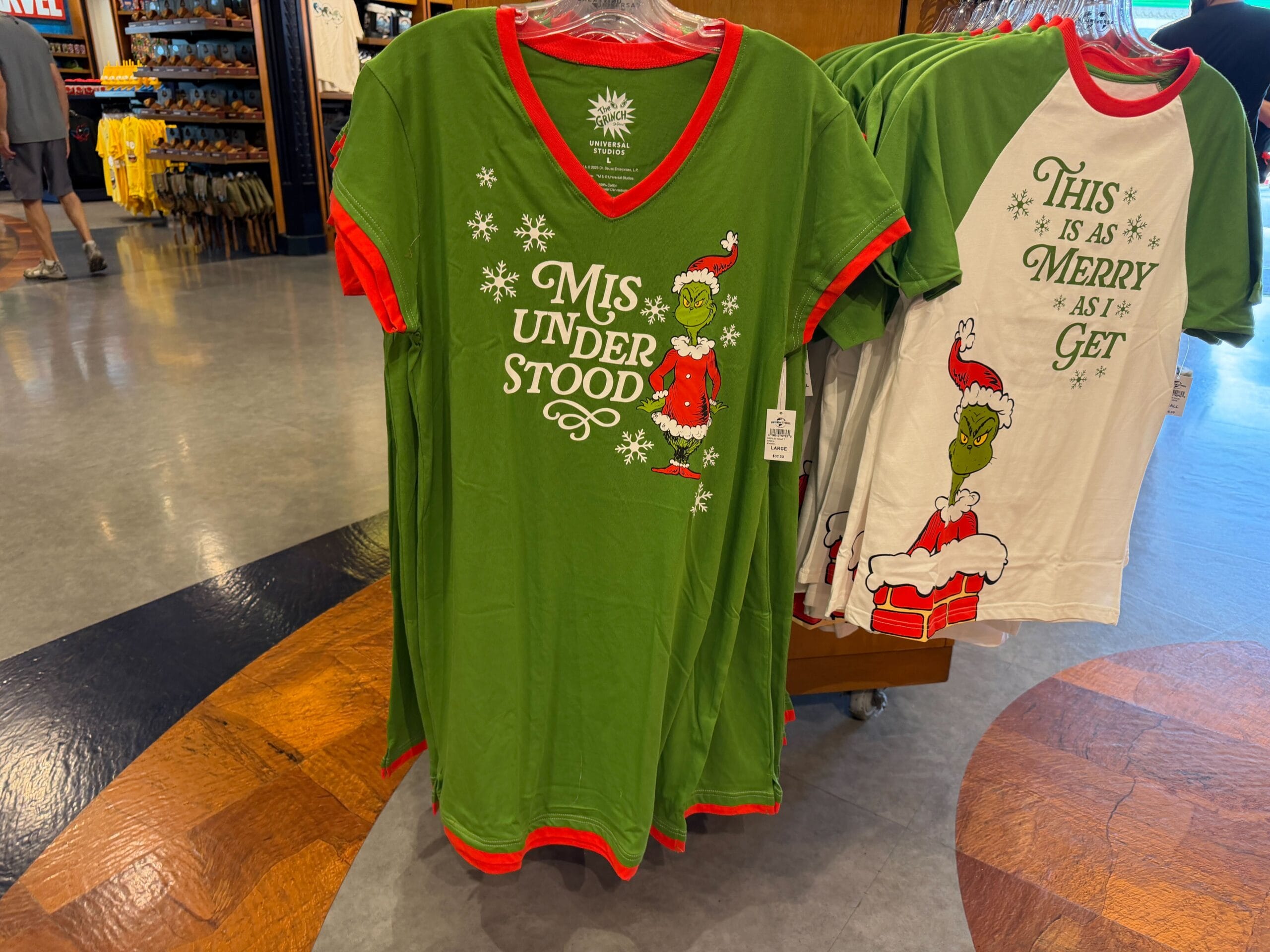 The Grinch nightgown is green with red details. “Misunderstood” white text stands next to an image of the Grinch dressed in his Santa suit.