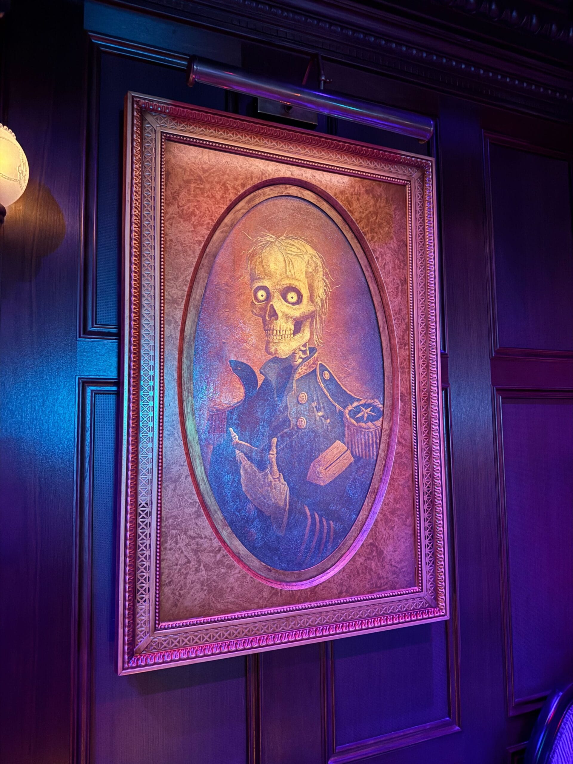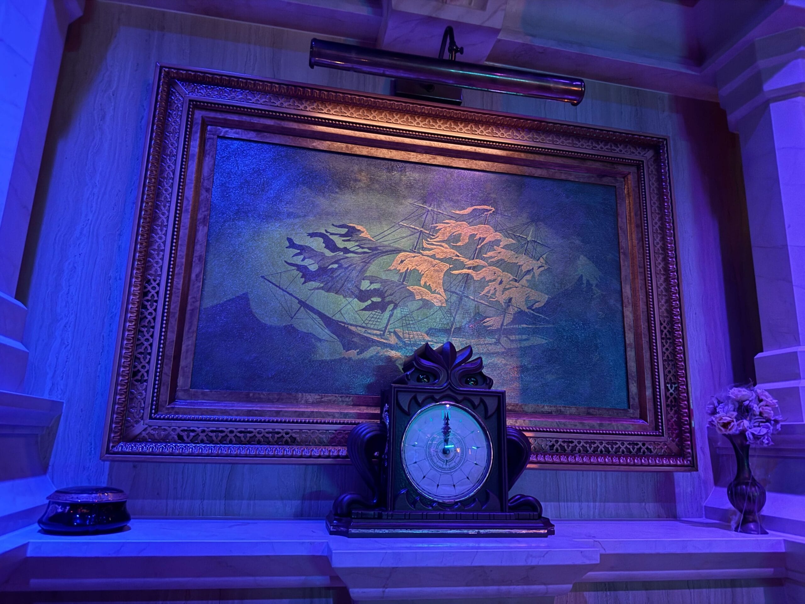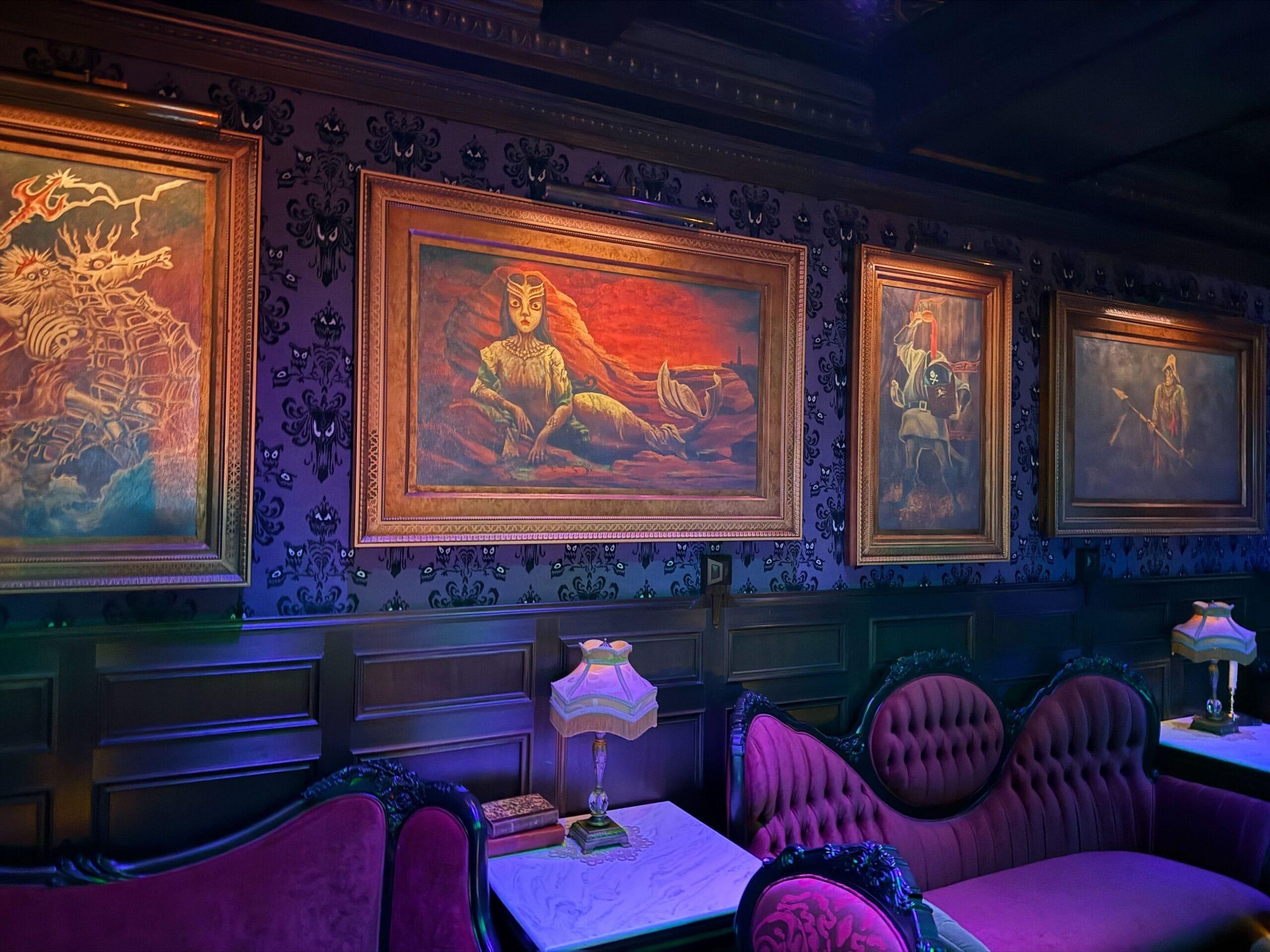 Along the wall is the Parlor’s portrait gallery, which includes art of the wandering souls that have taken up residence on the ship. These pieces mimic the art stylings utilized by Imagineers for the original Haunted Mansion in 1969.