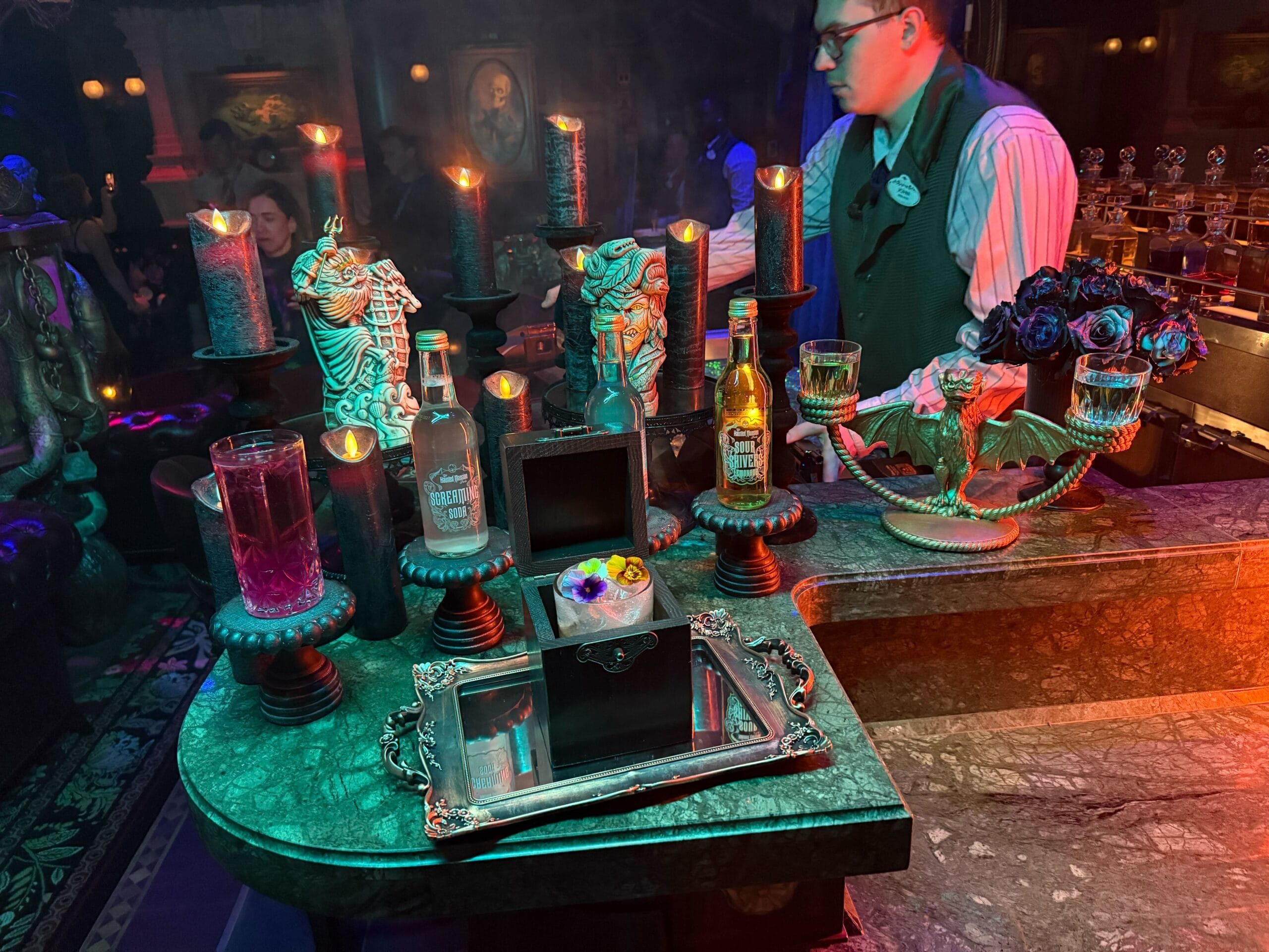 The bar features a green marble which perfectly matches the iconic purple wallpaper. At the back of the bar, there is a mirror, which not only helps to make the space feel bigger but there is an added surprise lurking. The longer you look in, the more likely you are to spot the ghostly figures straight from the Haunted Mansion.