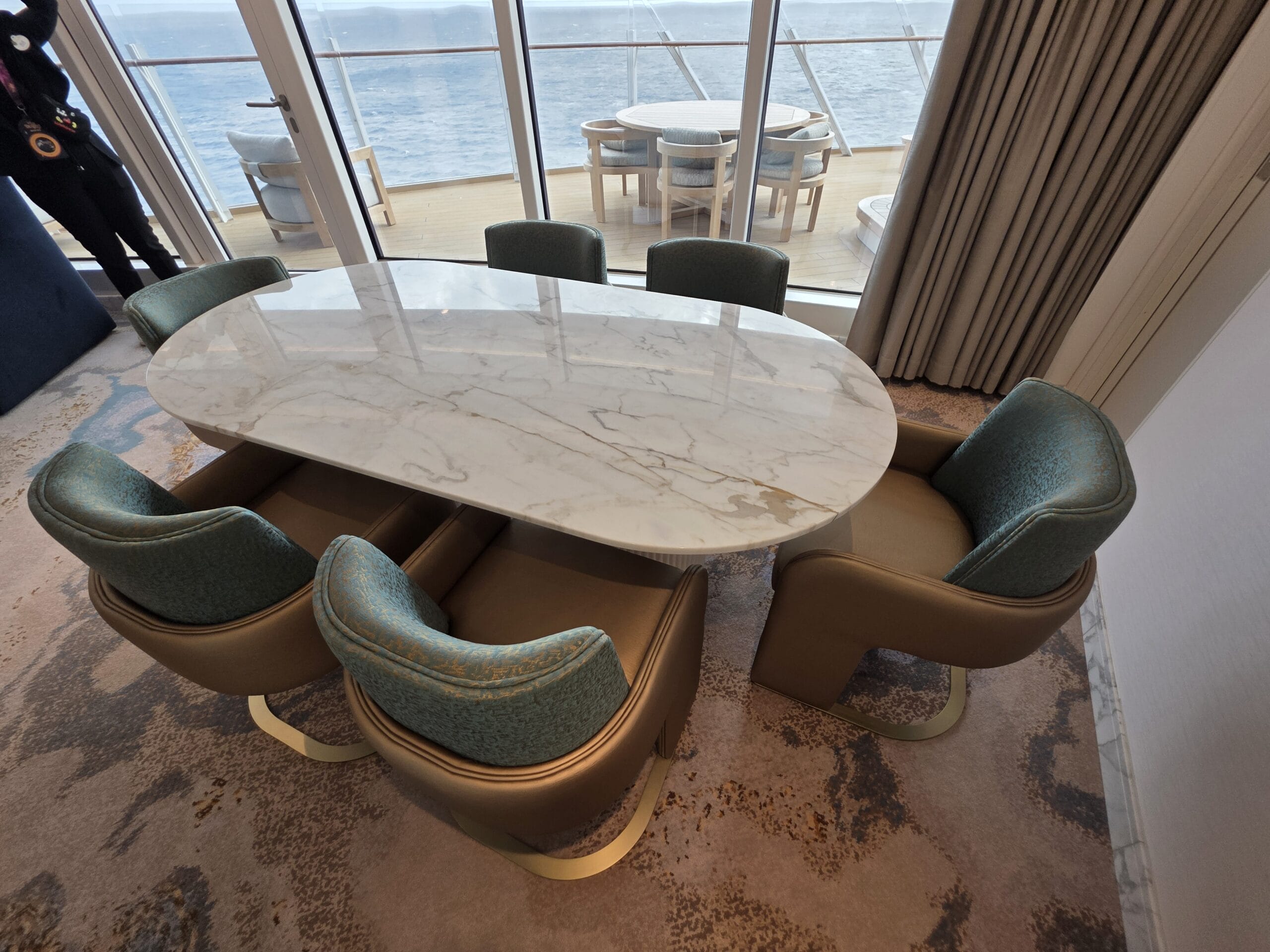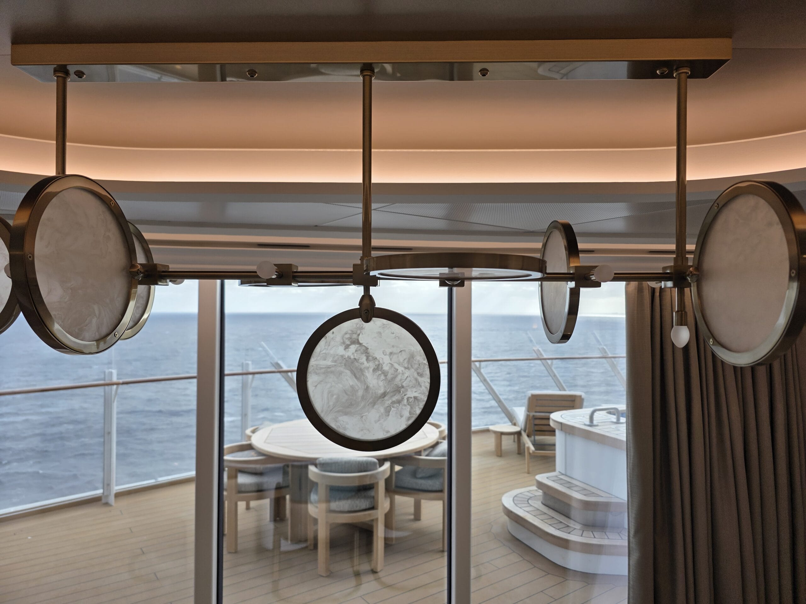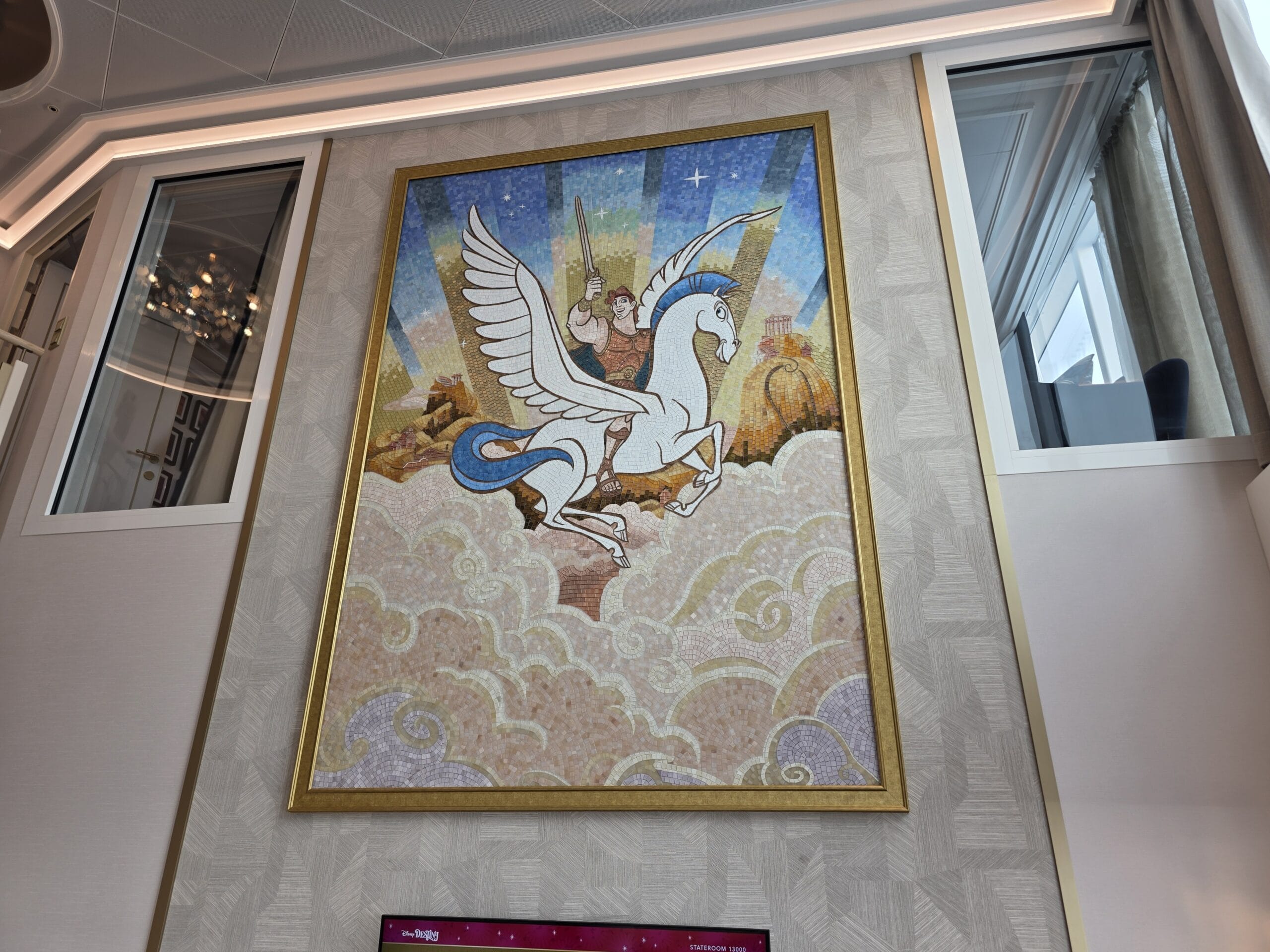 We got to take a look inside the Hercules-themed Royal Suite on the Disney Destiny. It includes a main living area, two bedrooms, kitchenette, and a private verandah with a whirlpool spa.