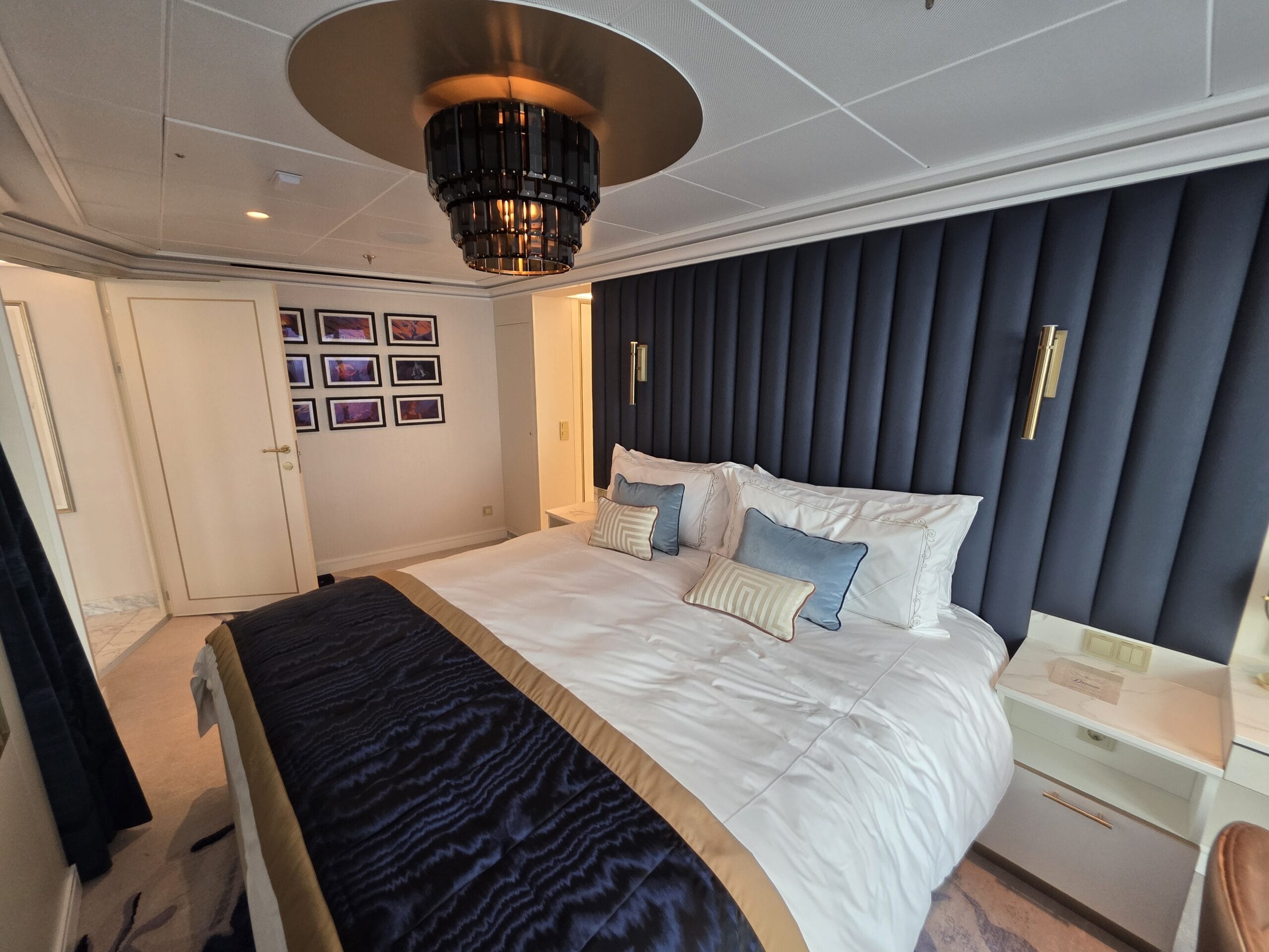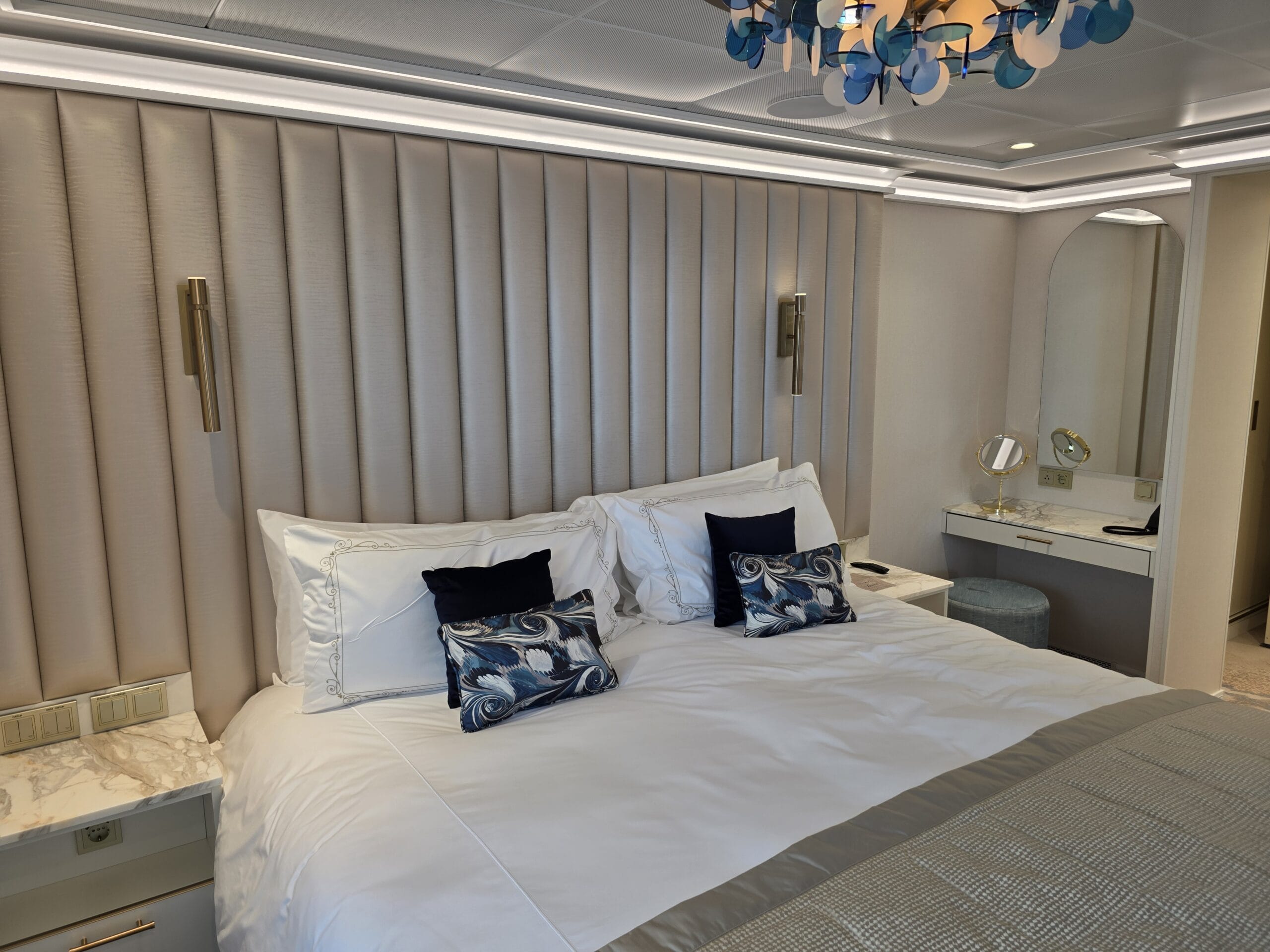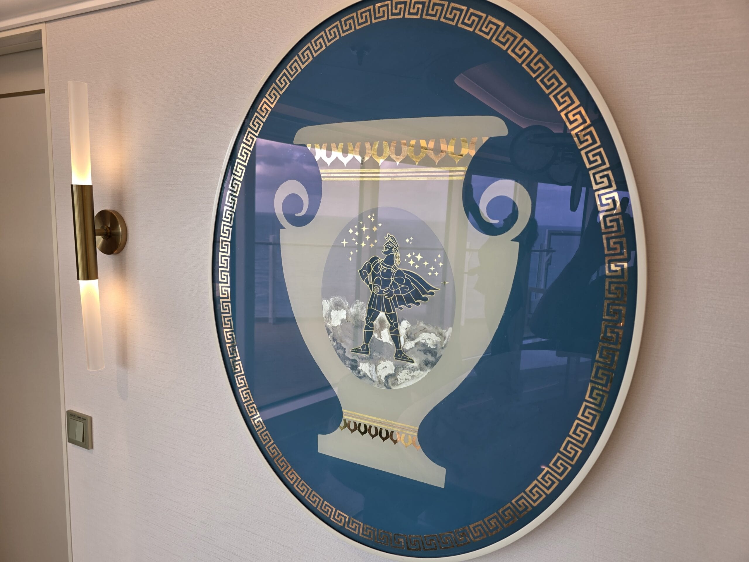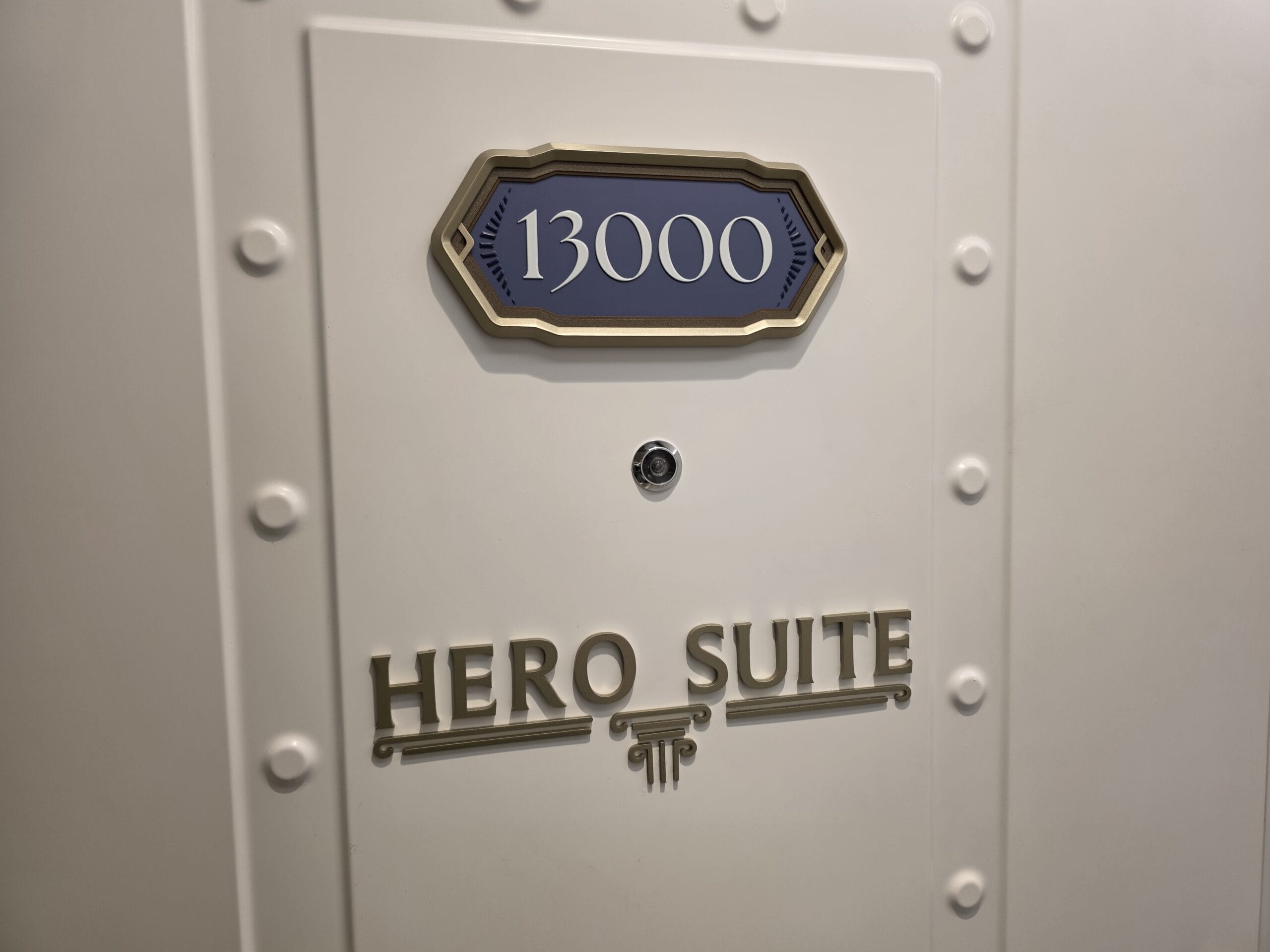 The Stateroom we toured is numbered 13000, and “Hero Suite” text and a Greek symbol greeted us at the door.
