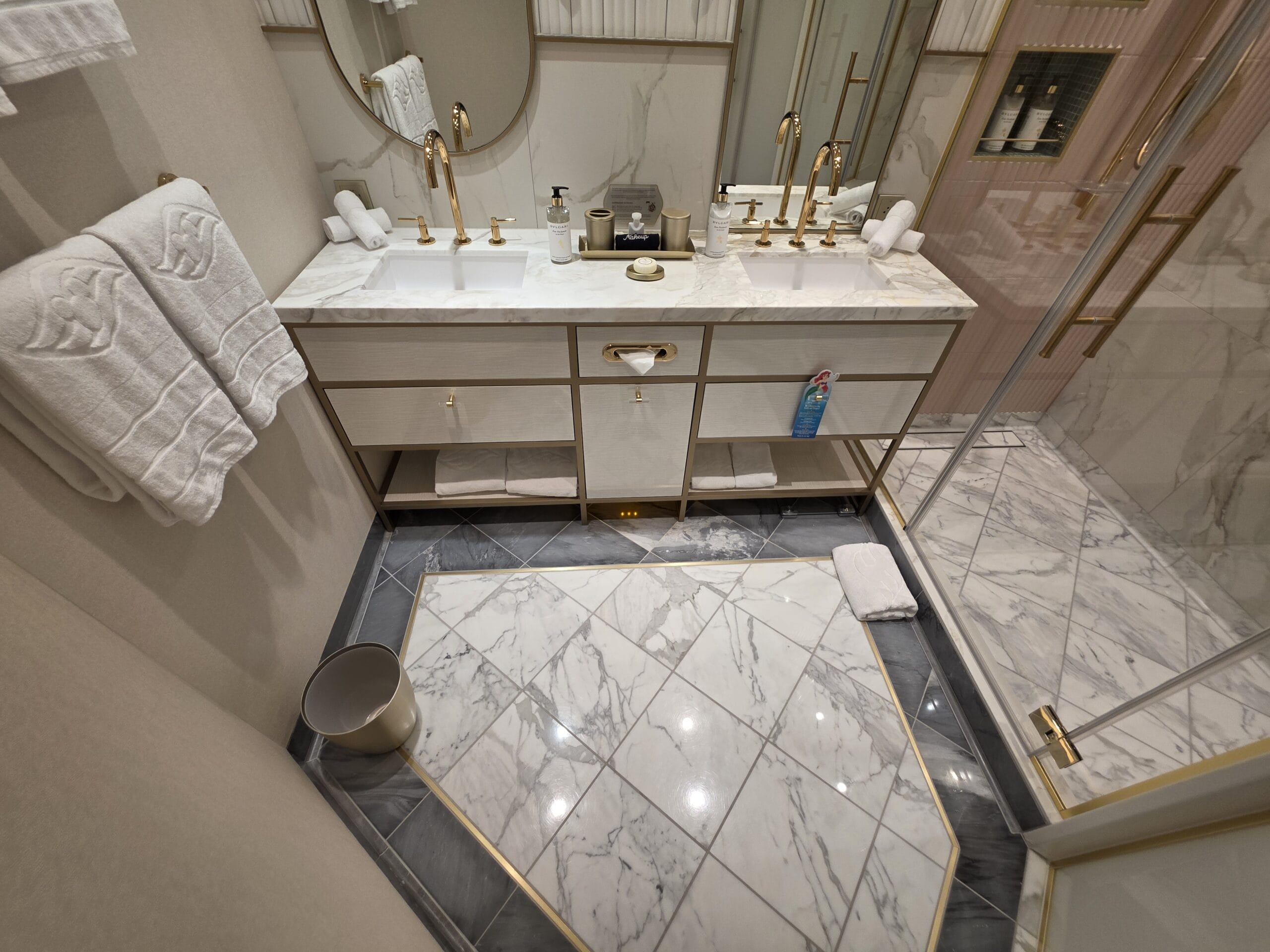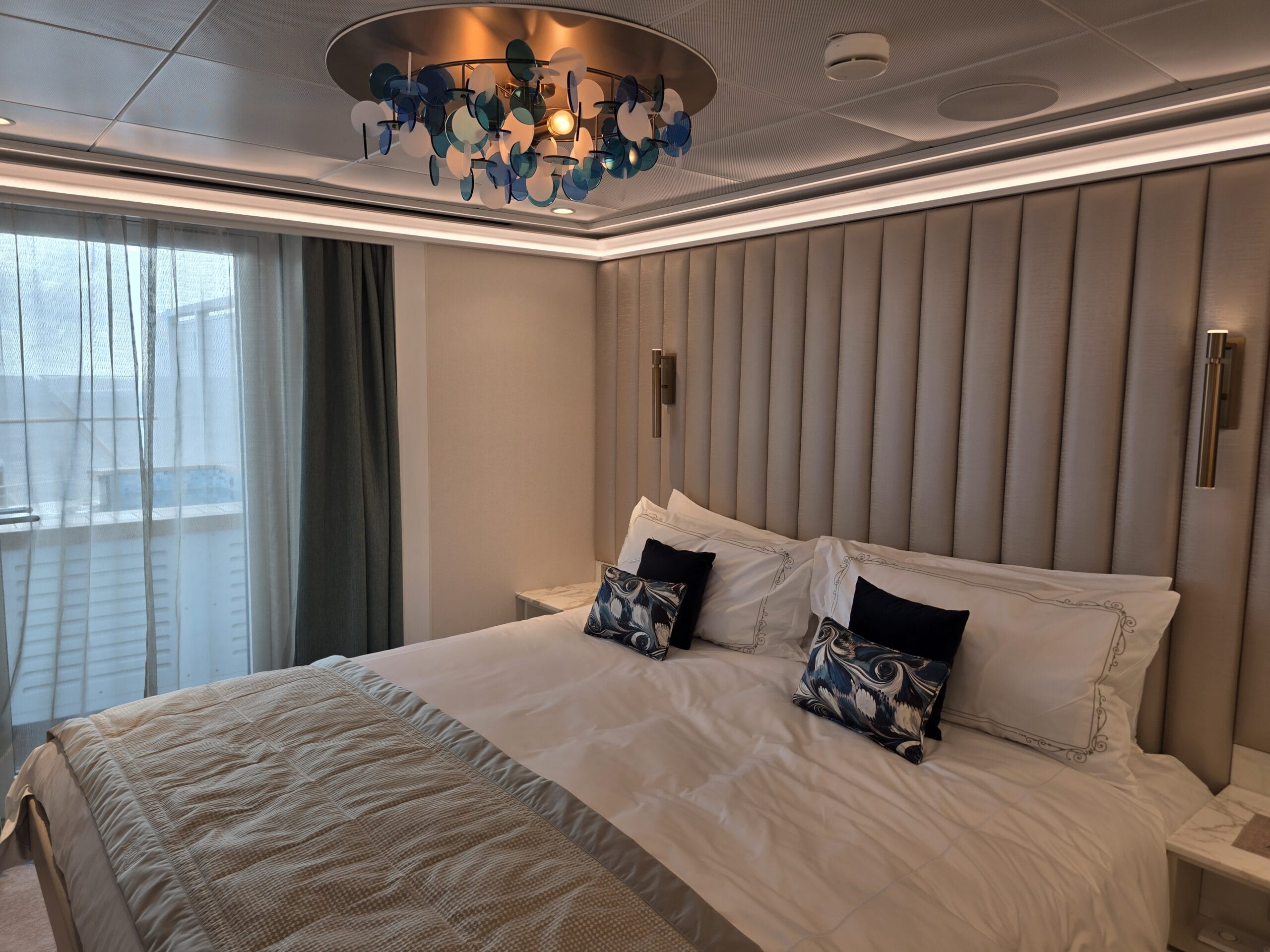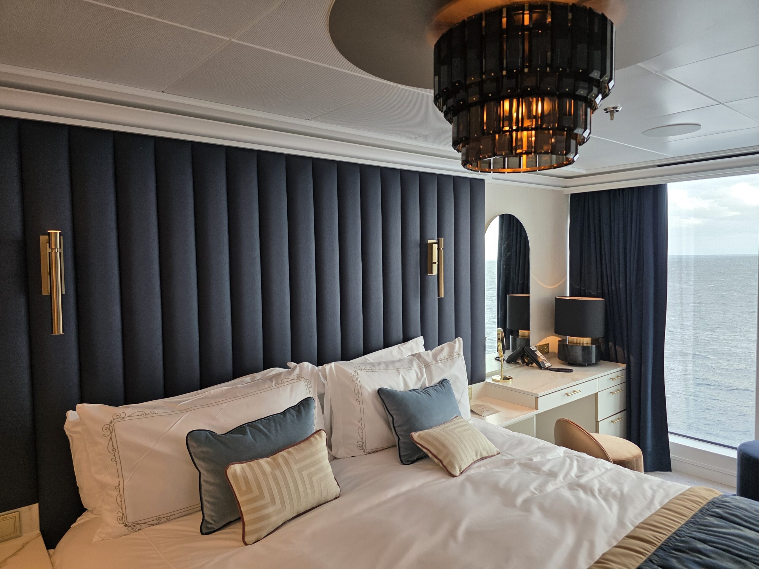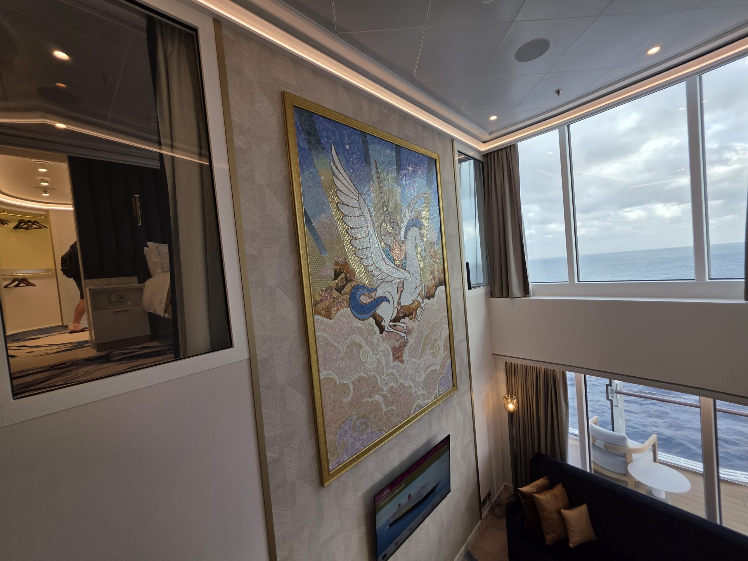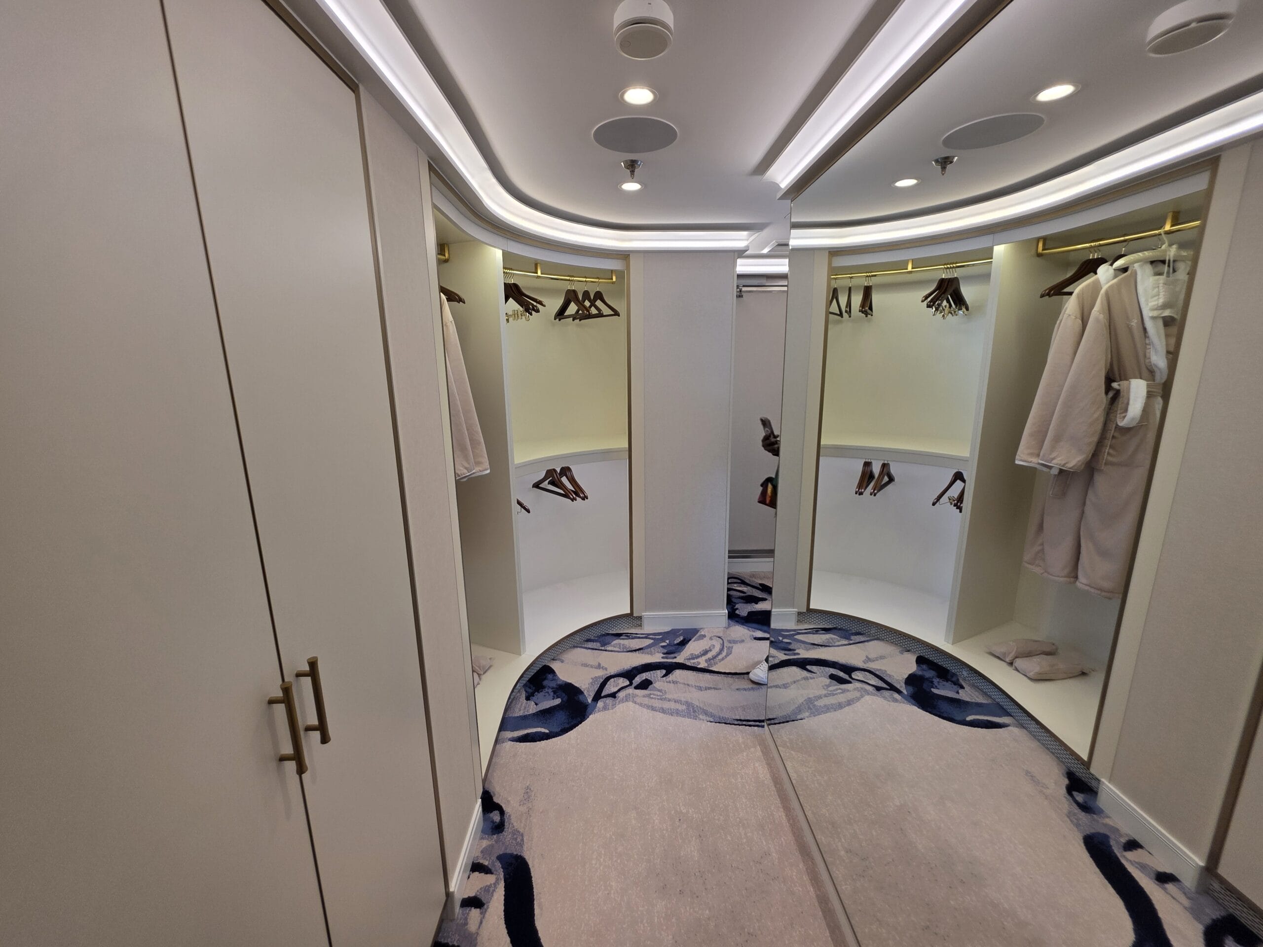 The Stateroom we toured is numbered 13000, and “Hero Suite” text and a Greek symbol greeted us at the door.