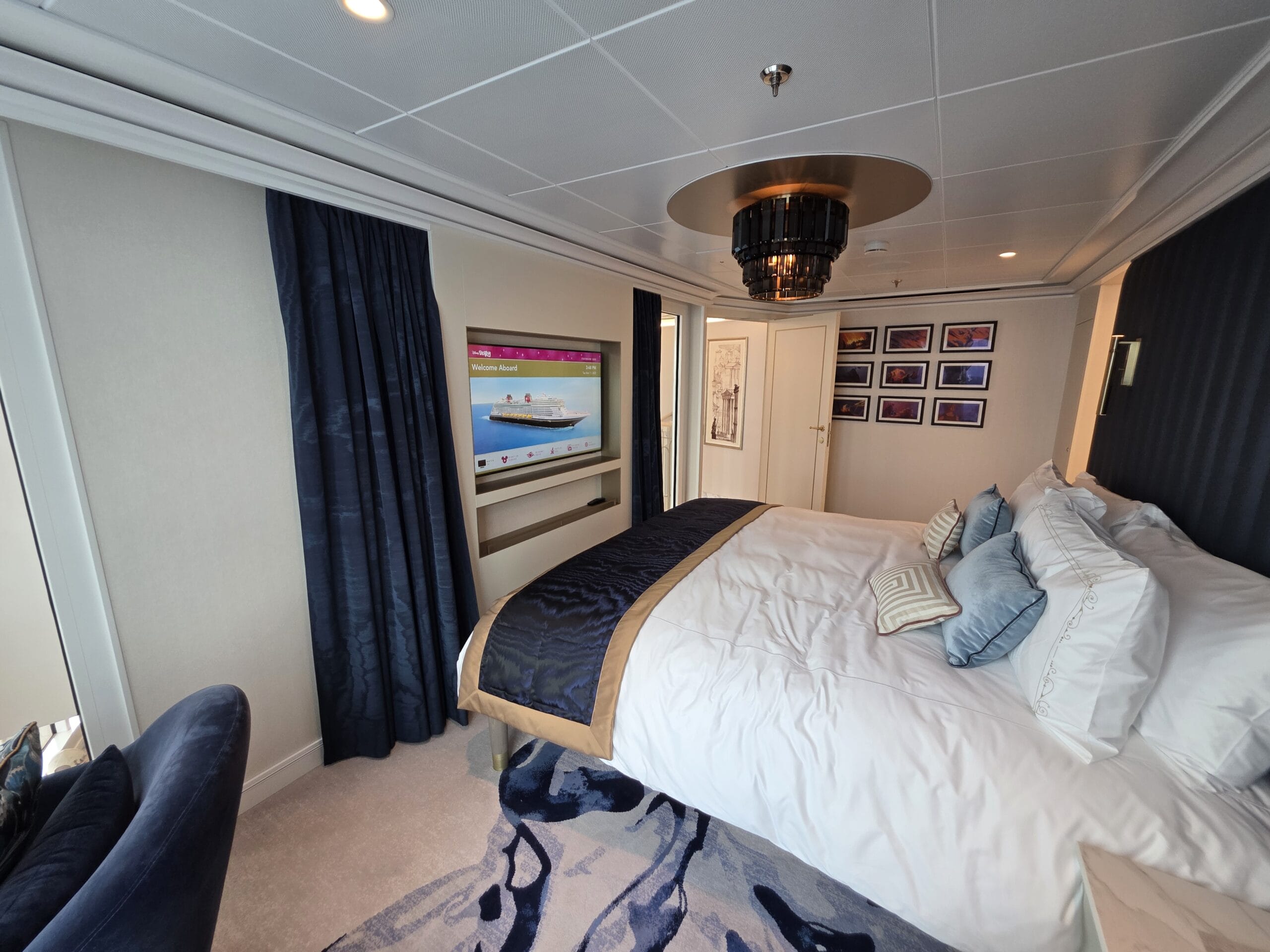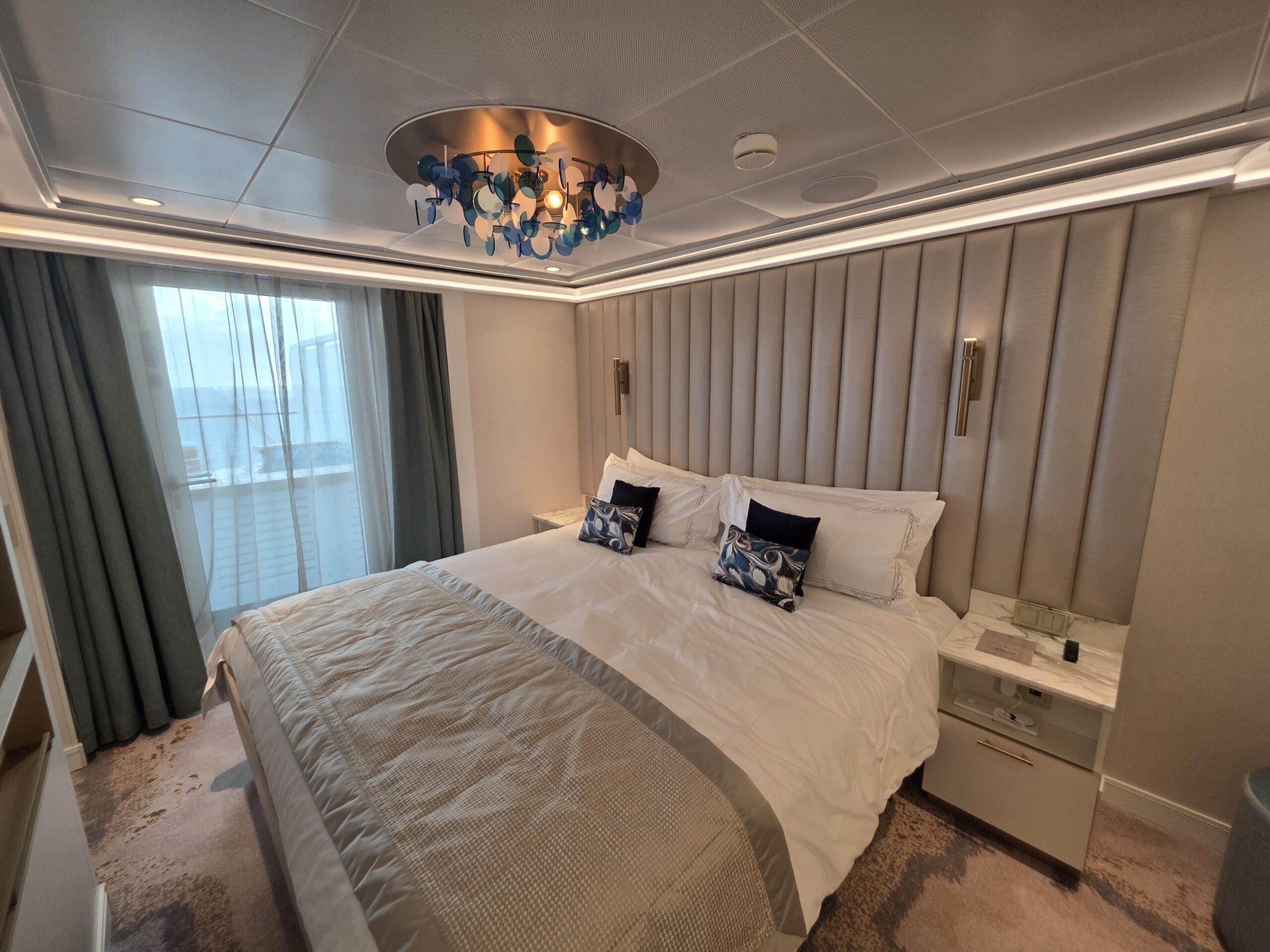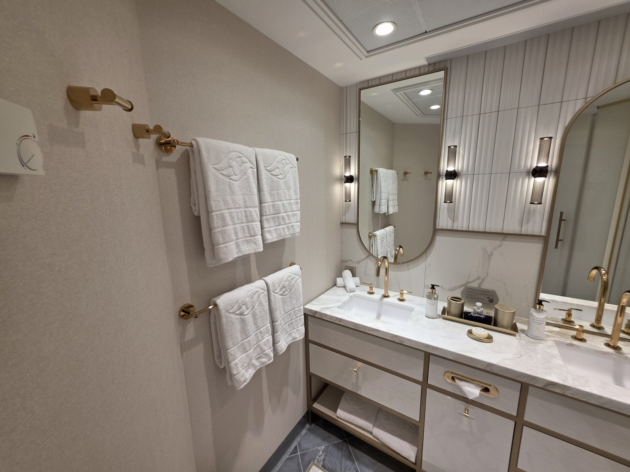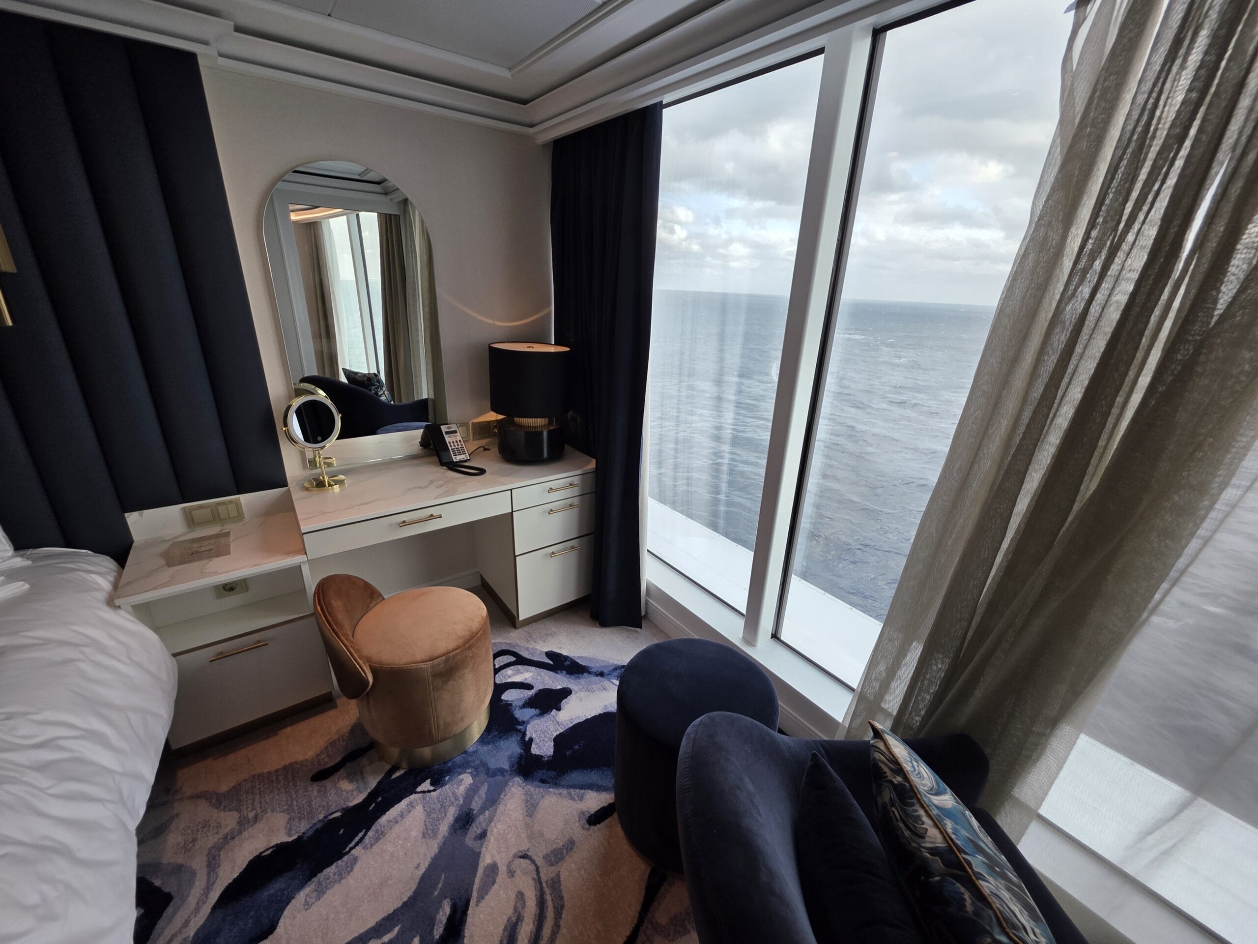 The Stateroom we toured is numbered 13000, and “Hero Suite” text and a Greek symbol greeted us at the door.