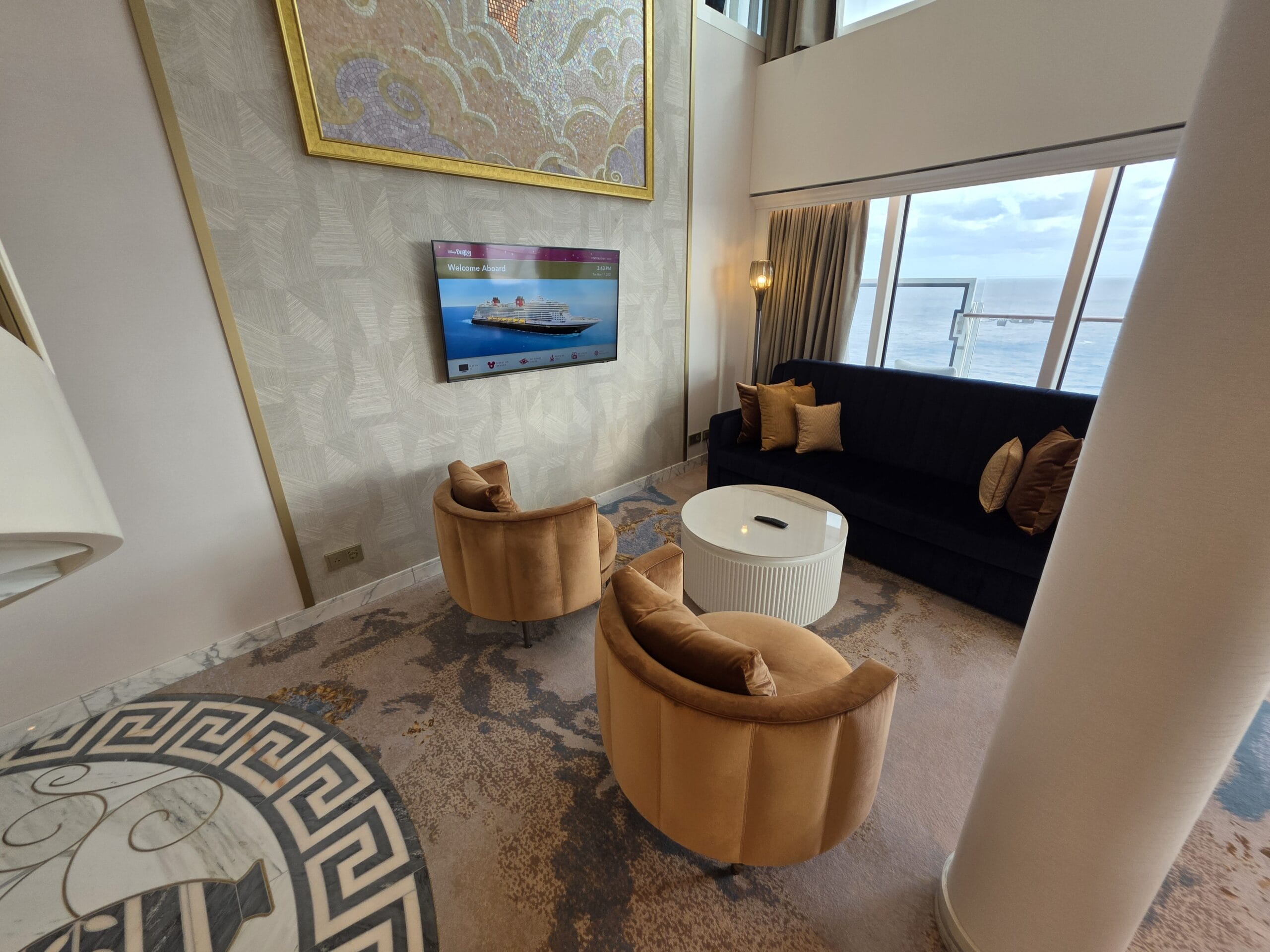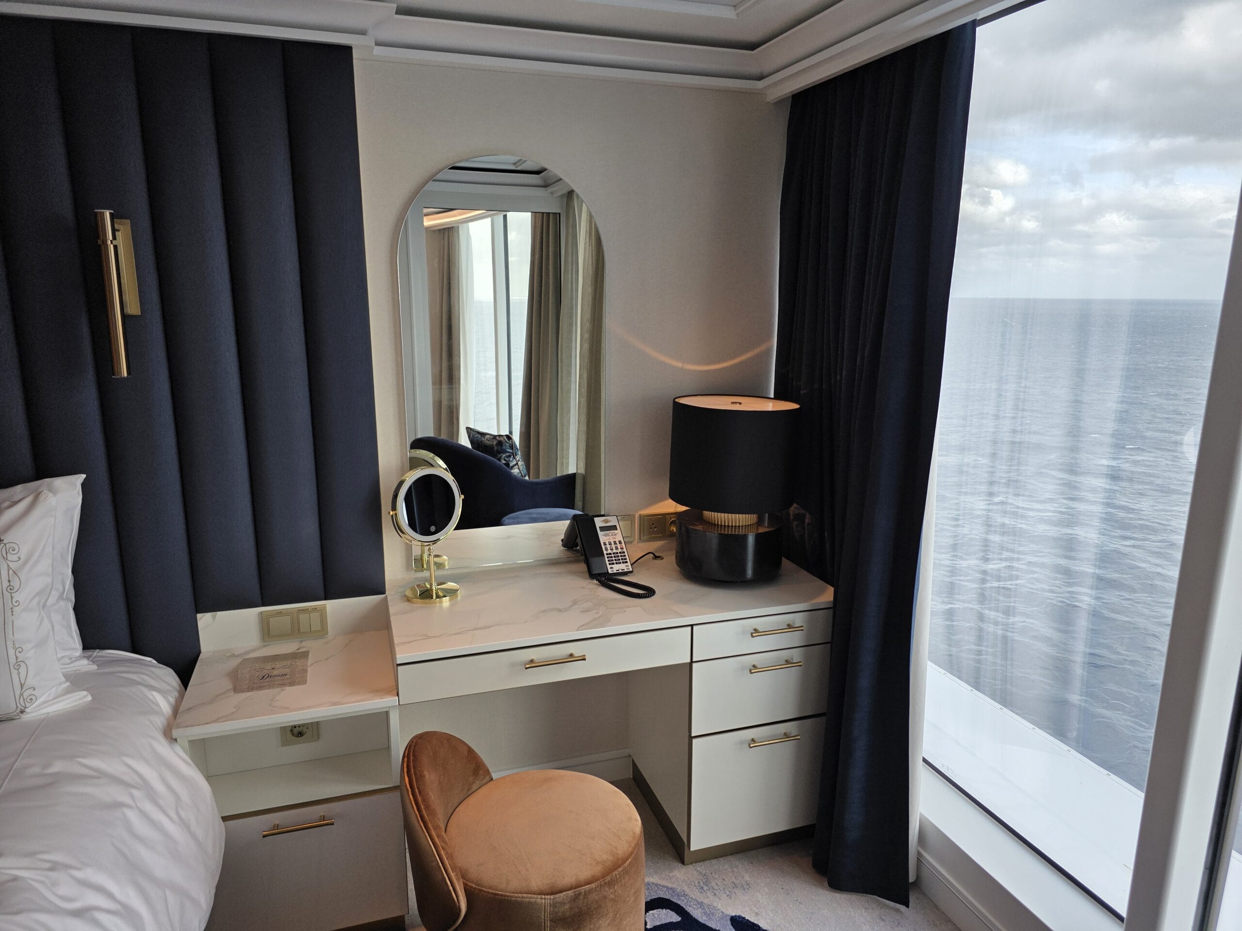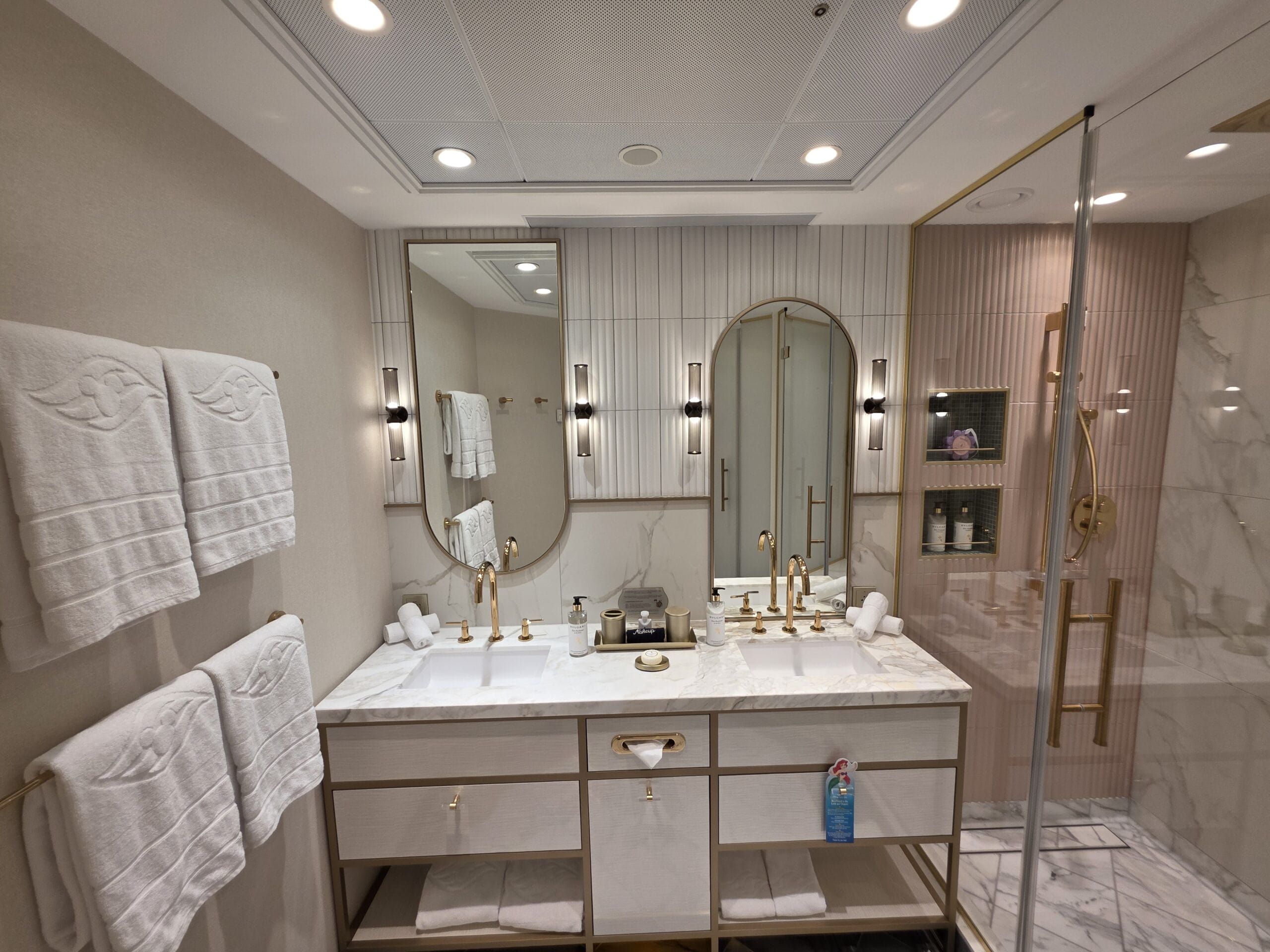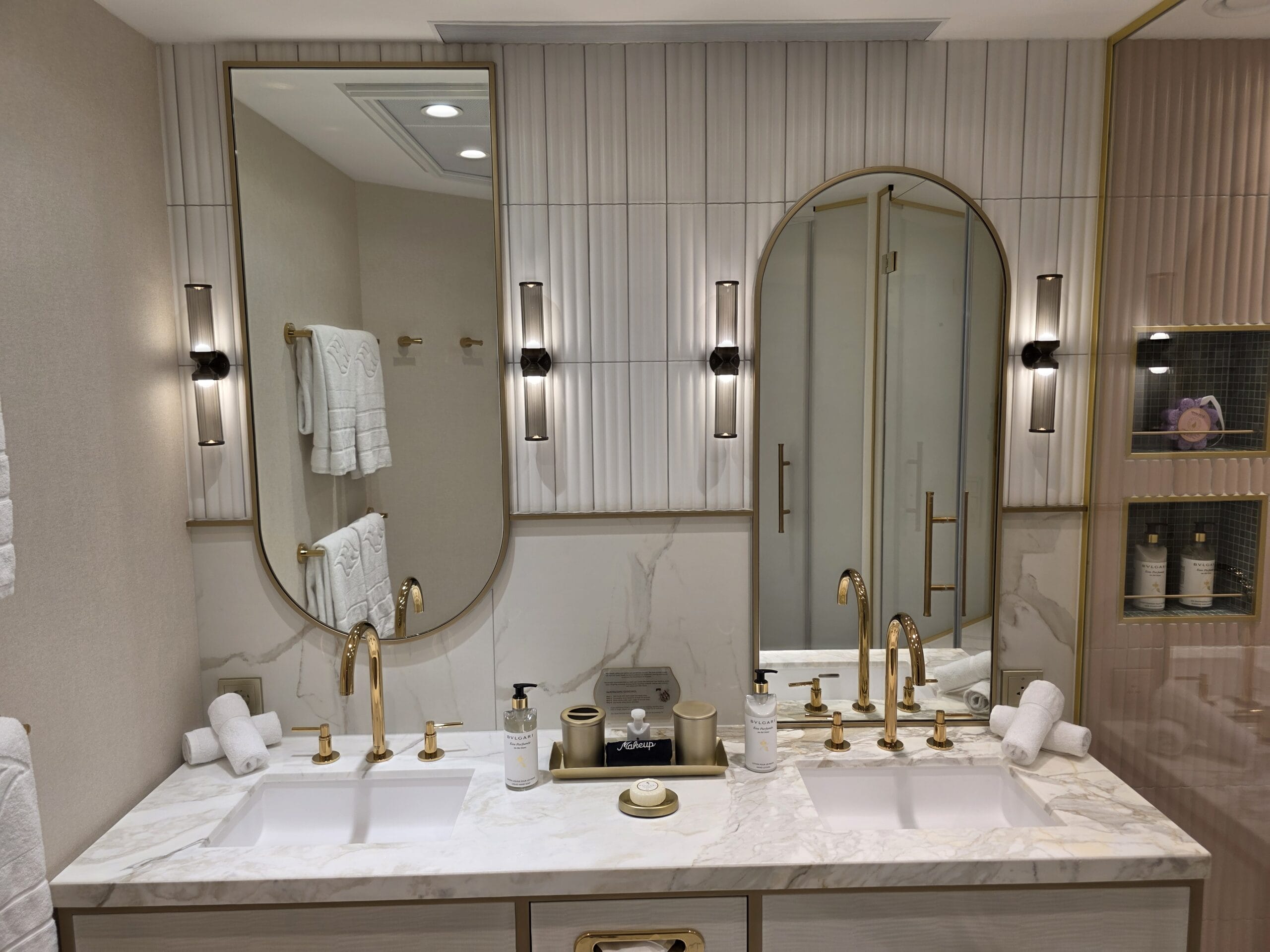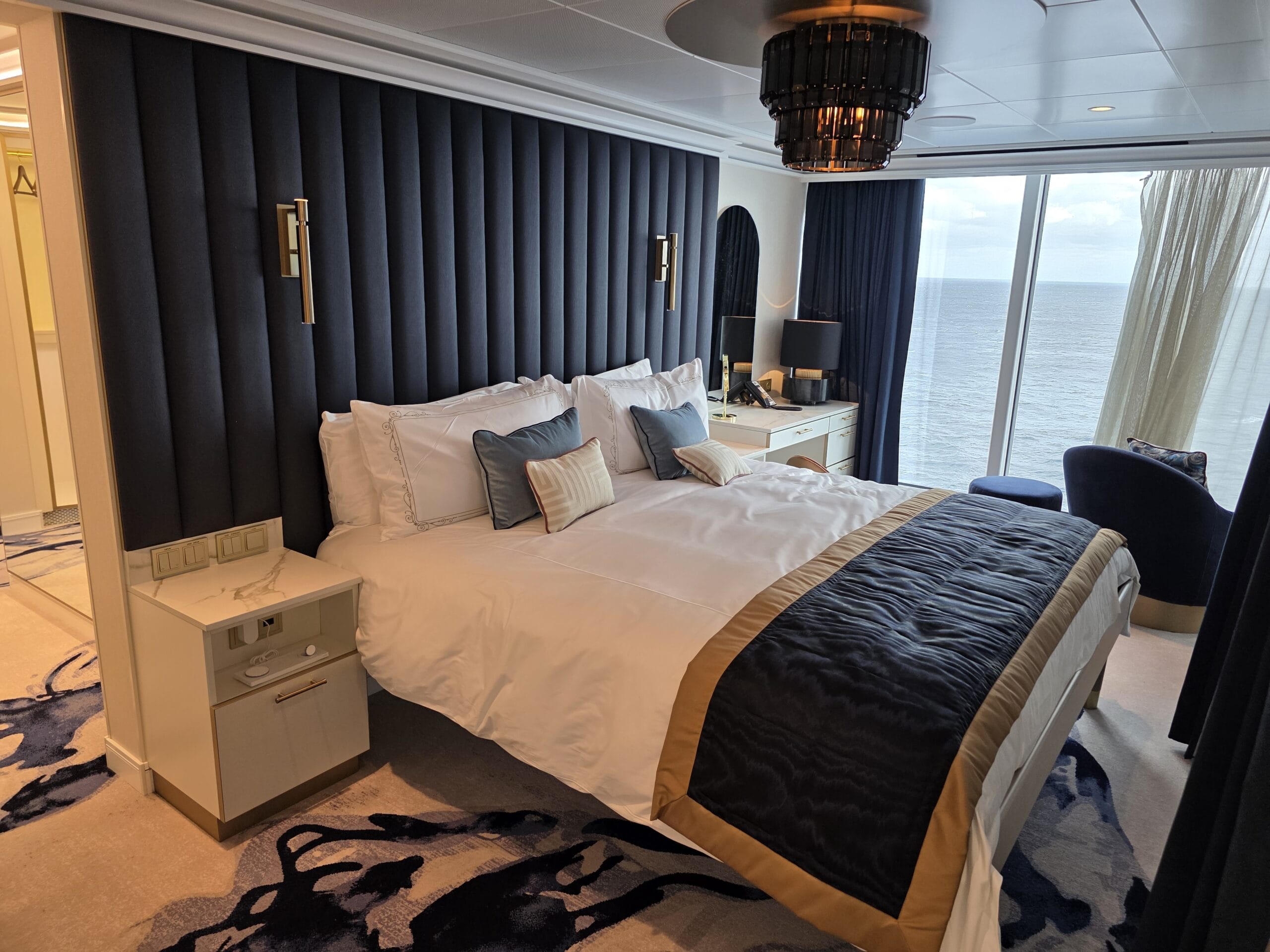 The Stateroom we toured is numbered 13000, and “Hero Suite” text and a Greek symbol greeted us at the door.