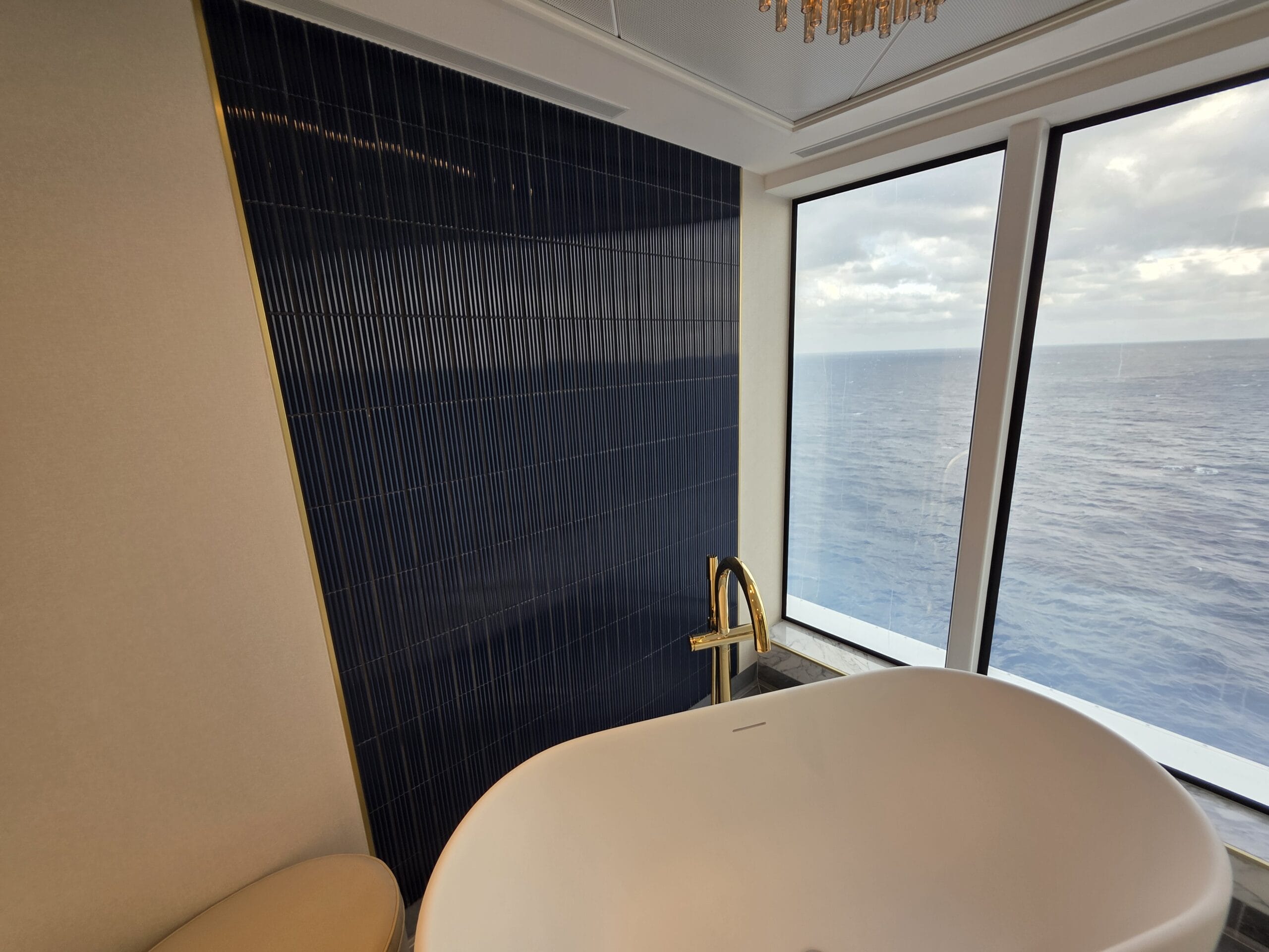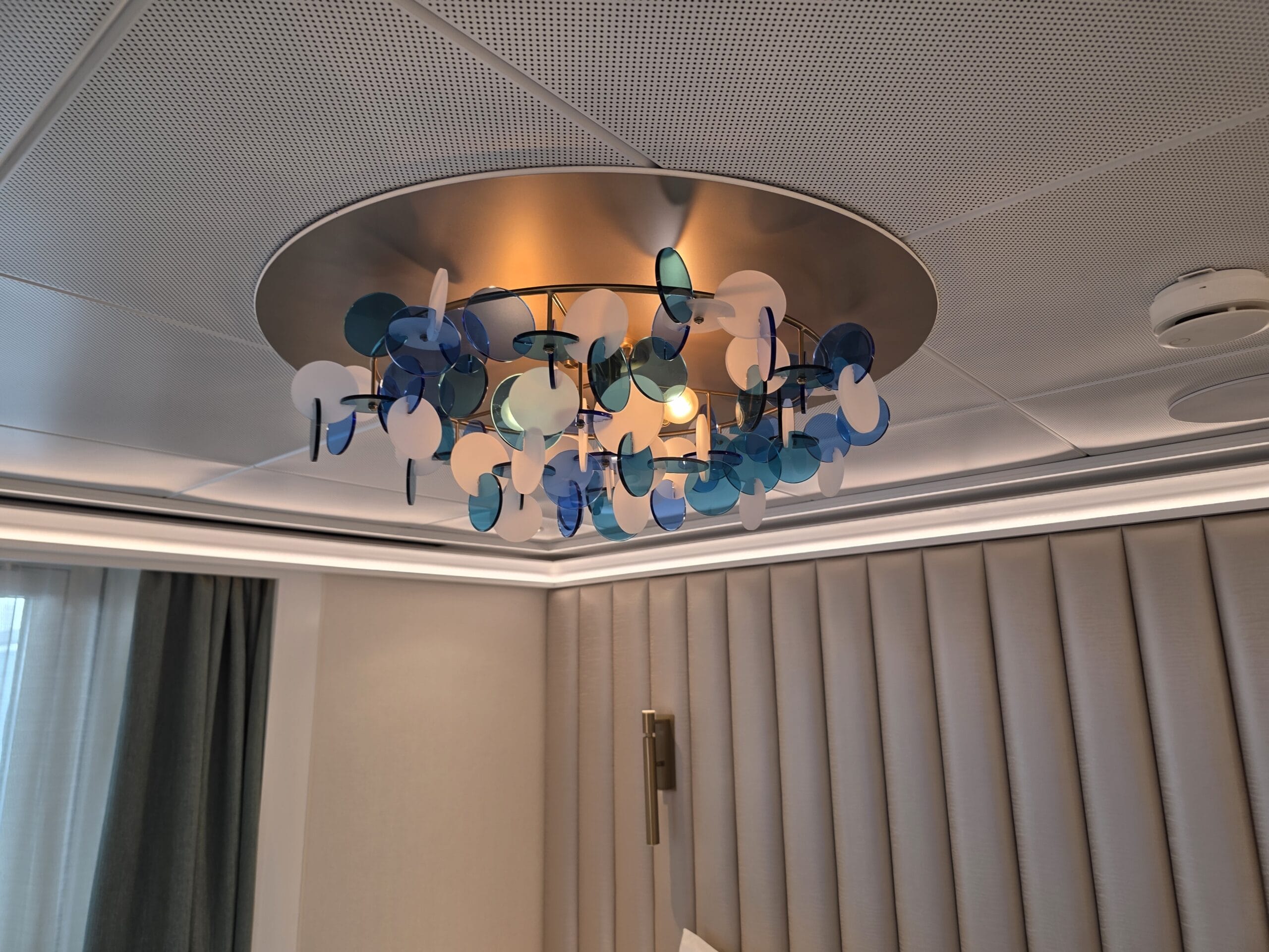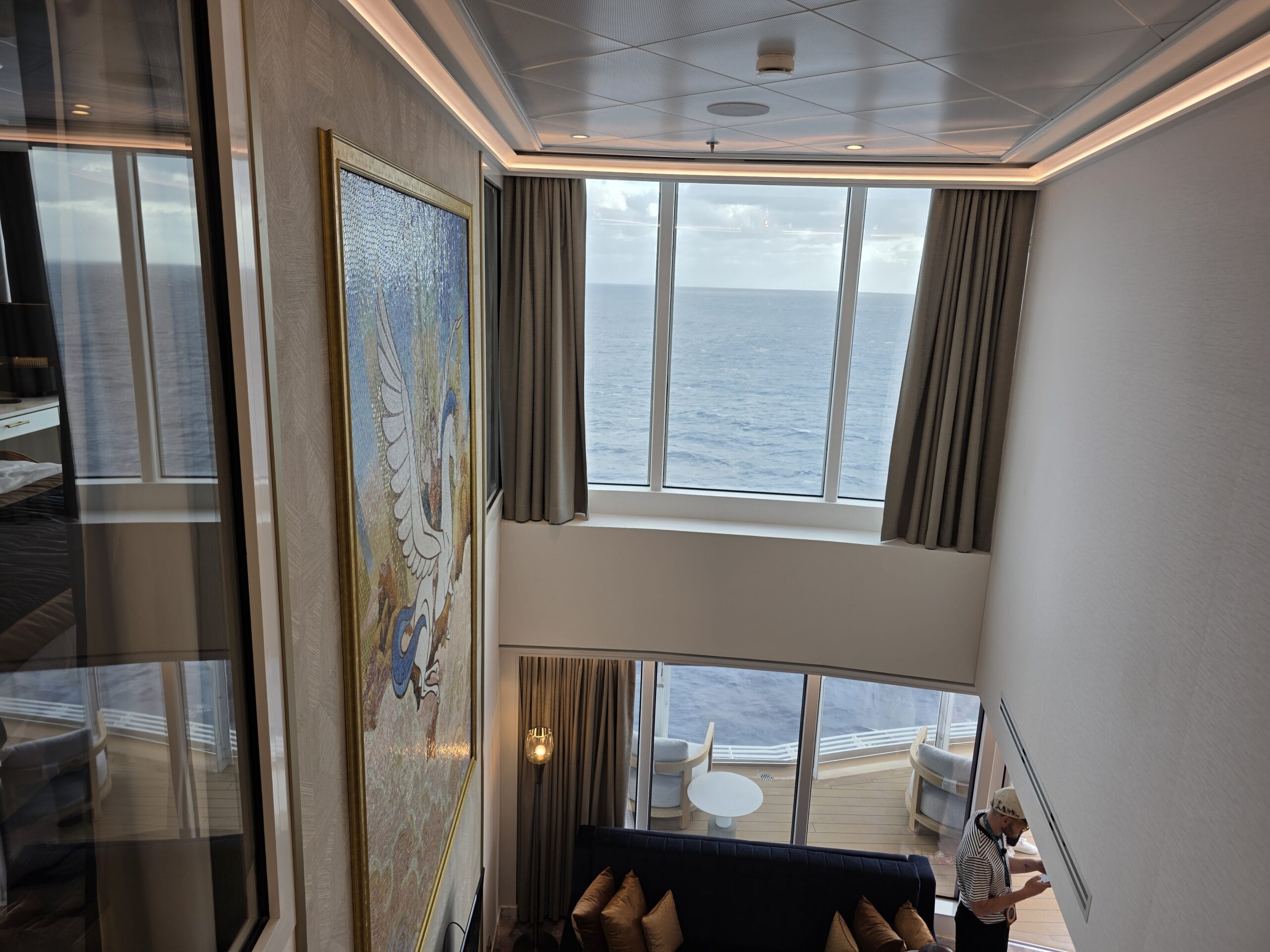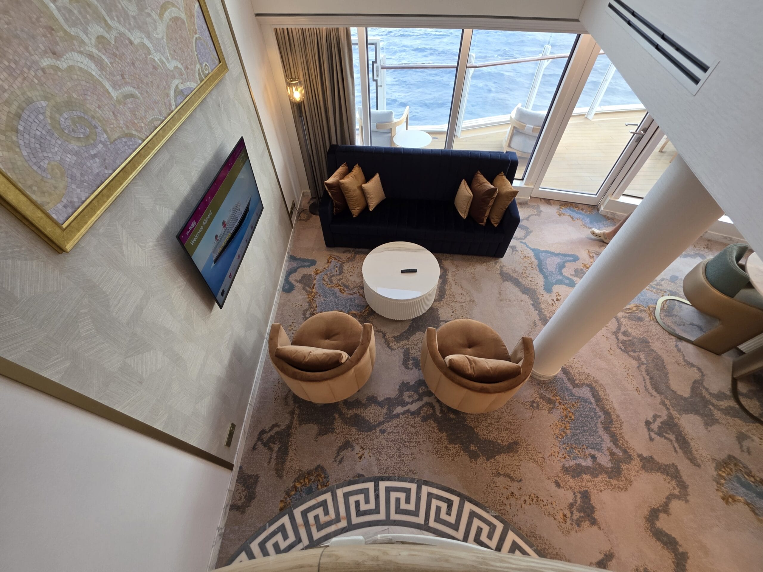 The Stateroom we toured is numbered 13000, and “Hero Suite” text and a Greek symbol greeted us at the door.