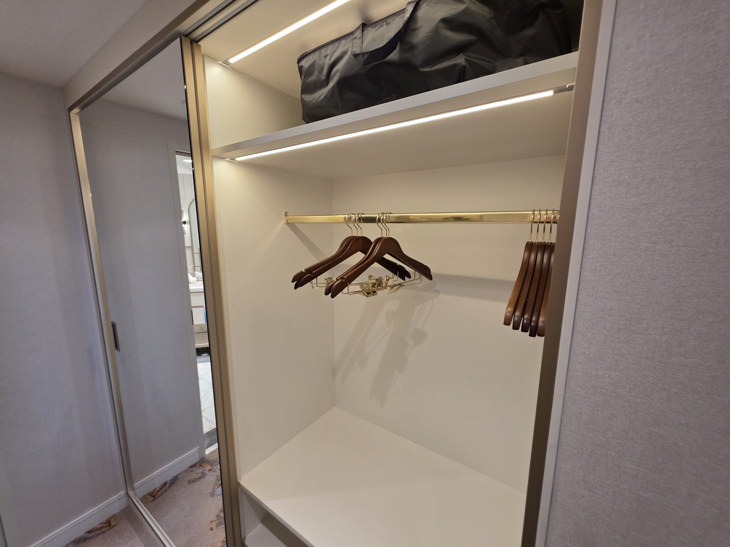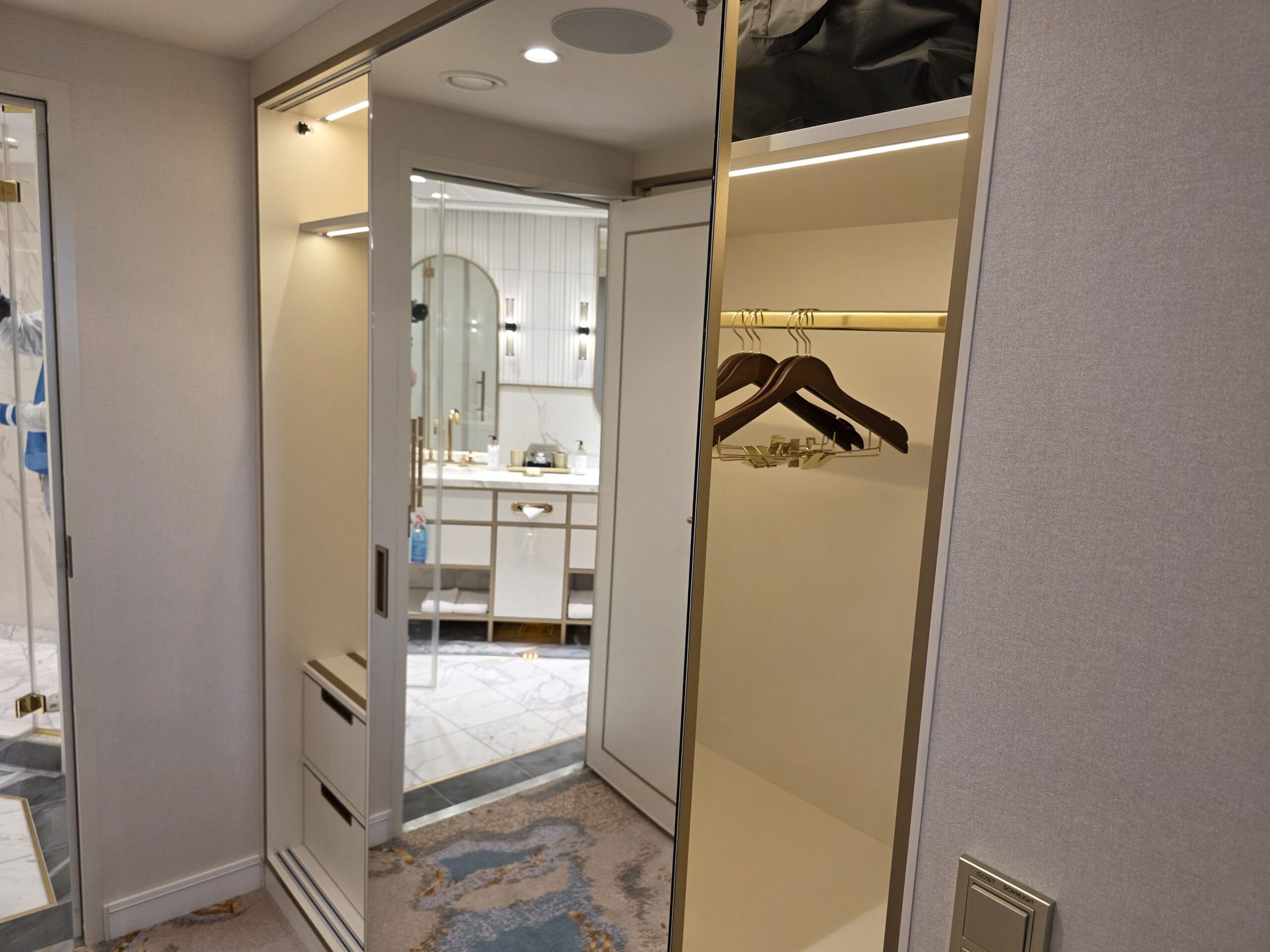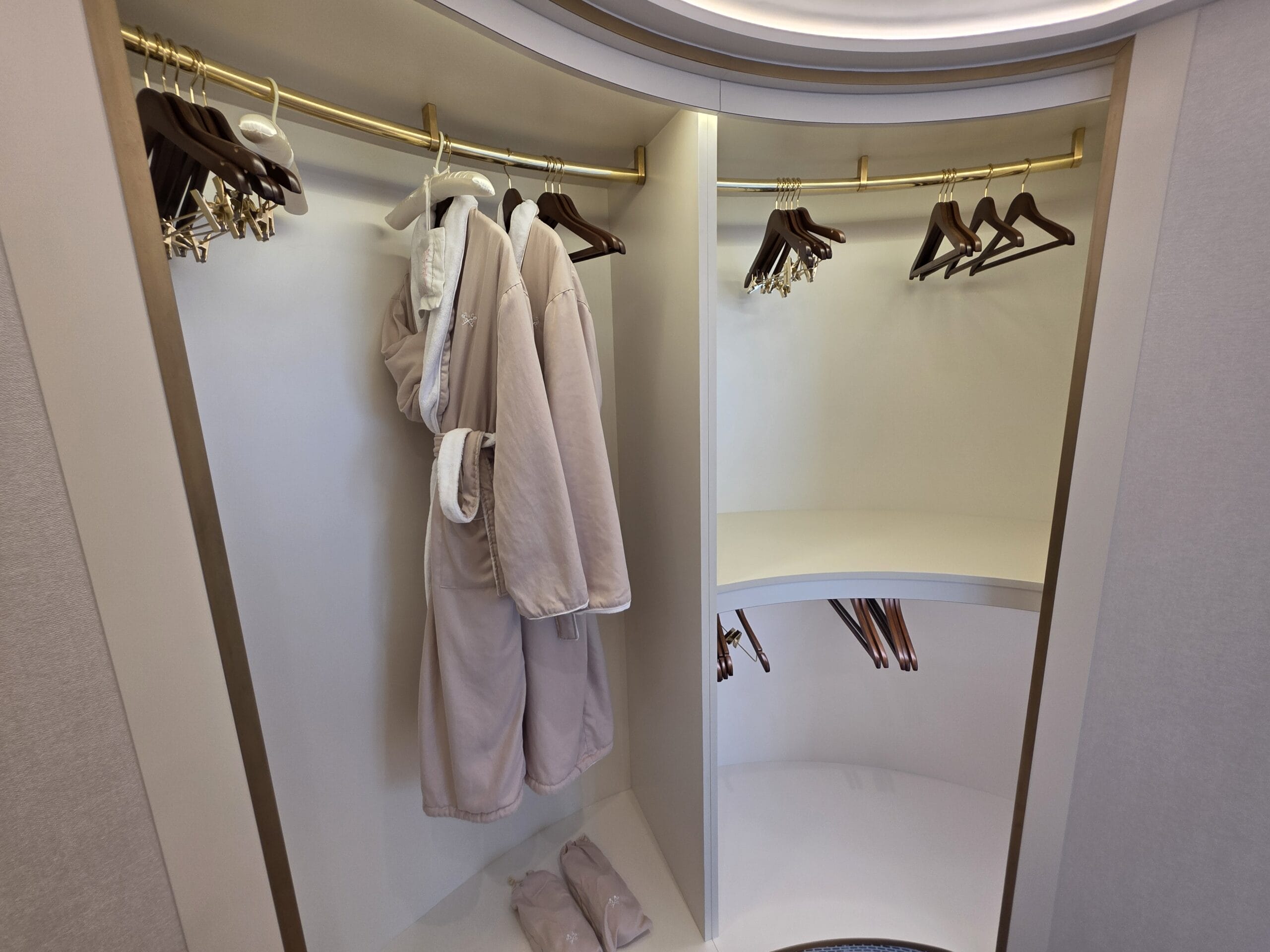 Some of the cabinets do not have doors, while some do. Disney provides hangers, robes, and slippers in the Royal Suite.